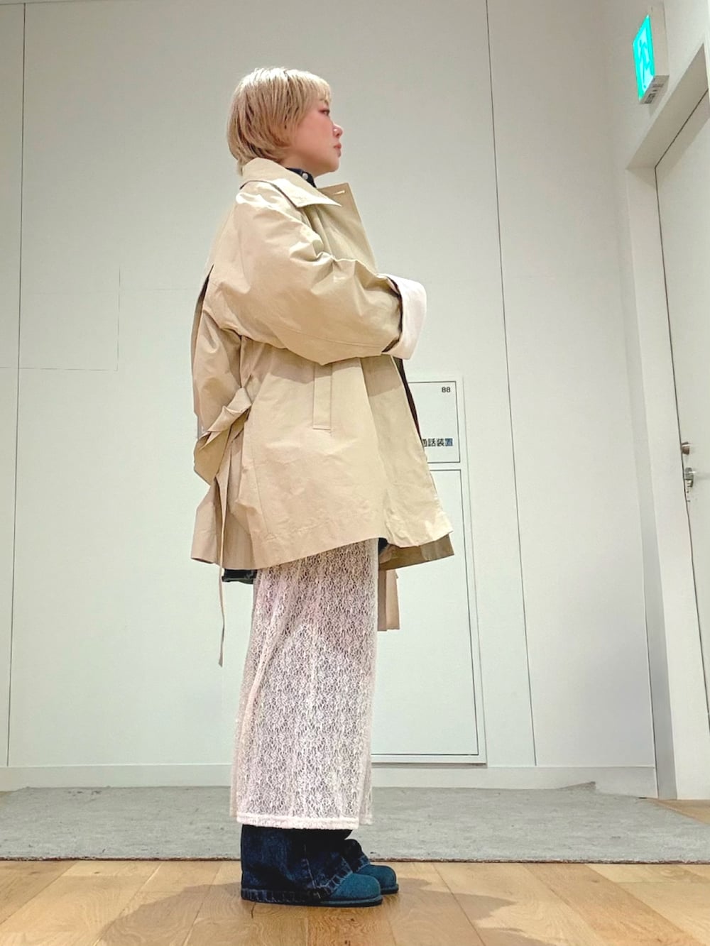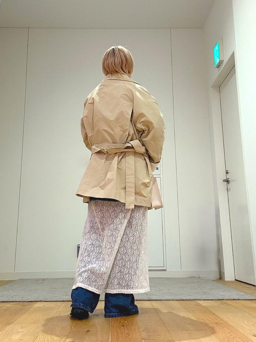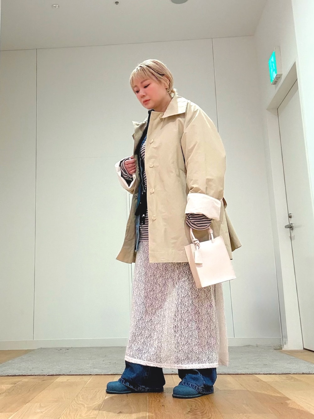 ベージュのコートを羽織れば、カジュアルさが程よく抑えられ、クリーンな印象にシフト。