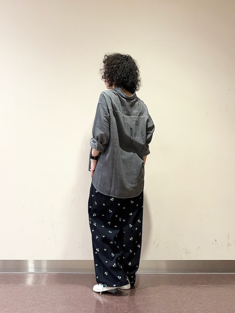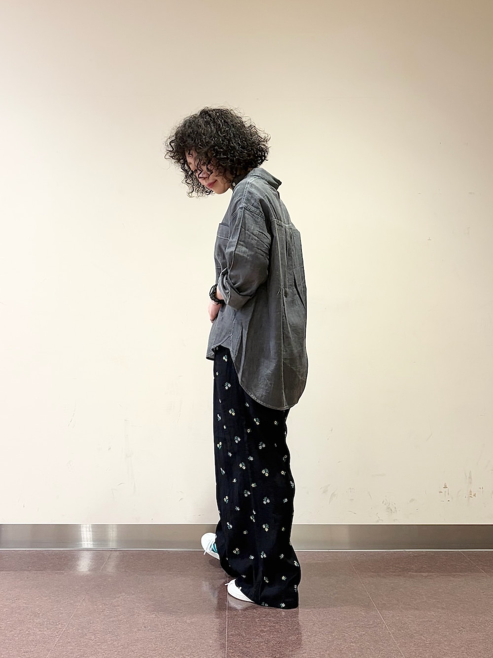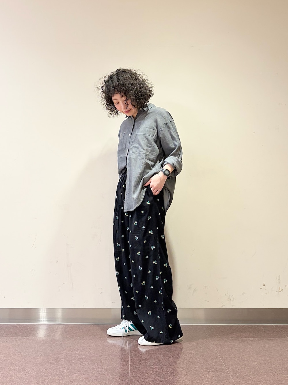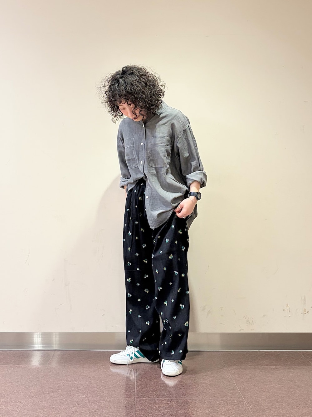シアーのデニムシャツと小花刺繍のリラックスパンツに、DOORS別注のadidas SPEZIALを合わせました♪