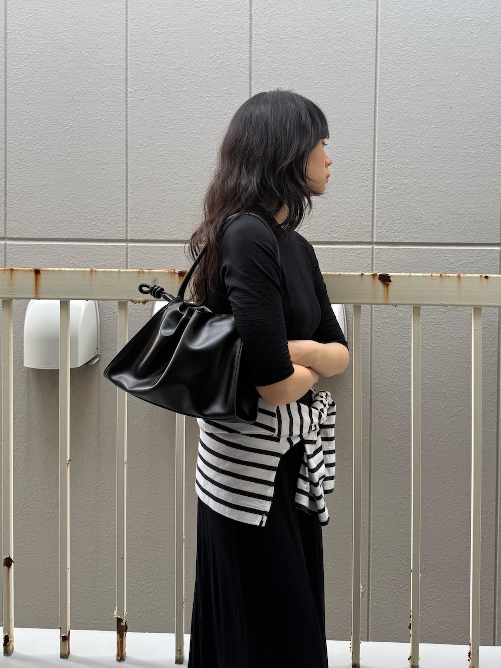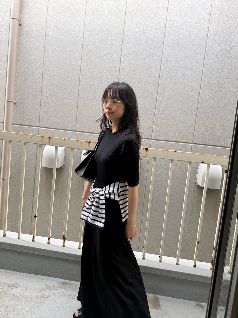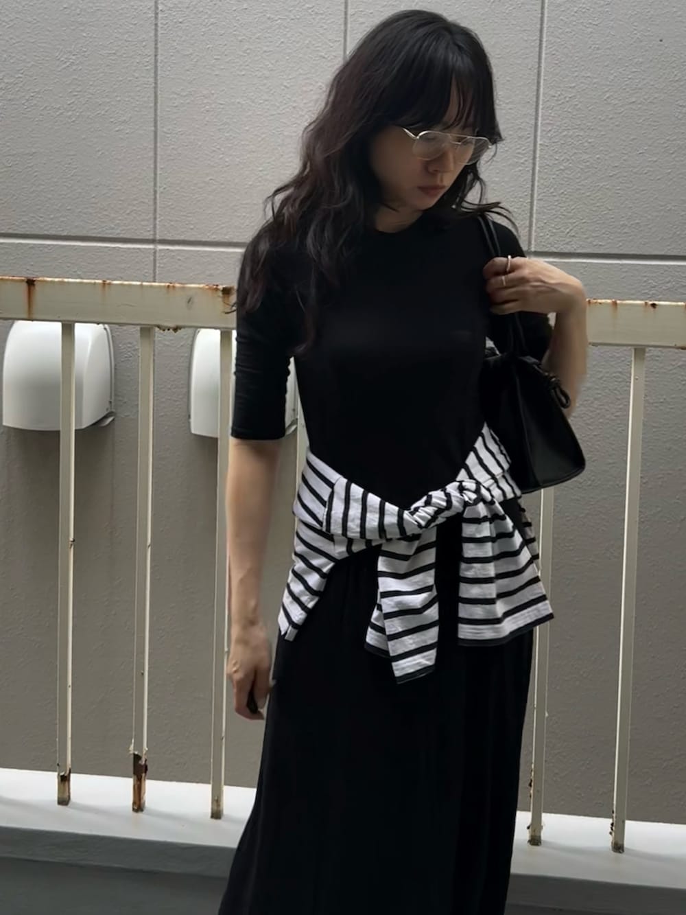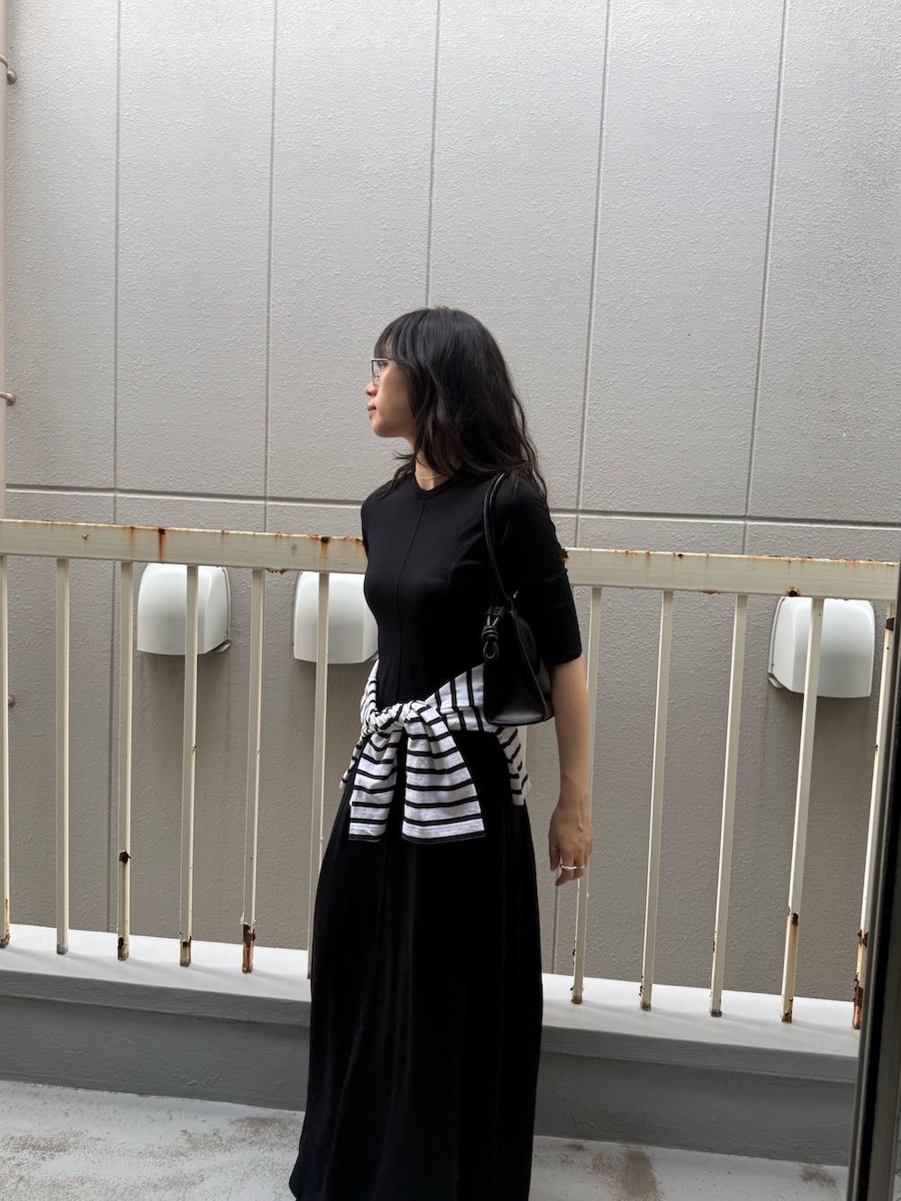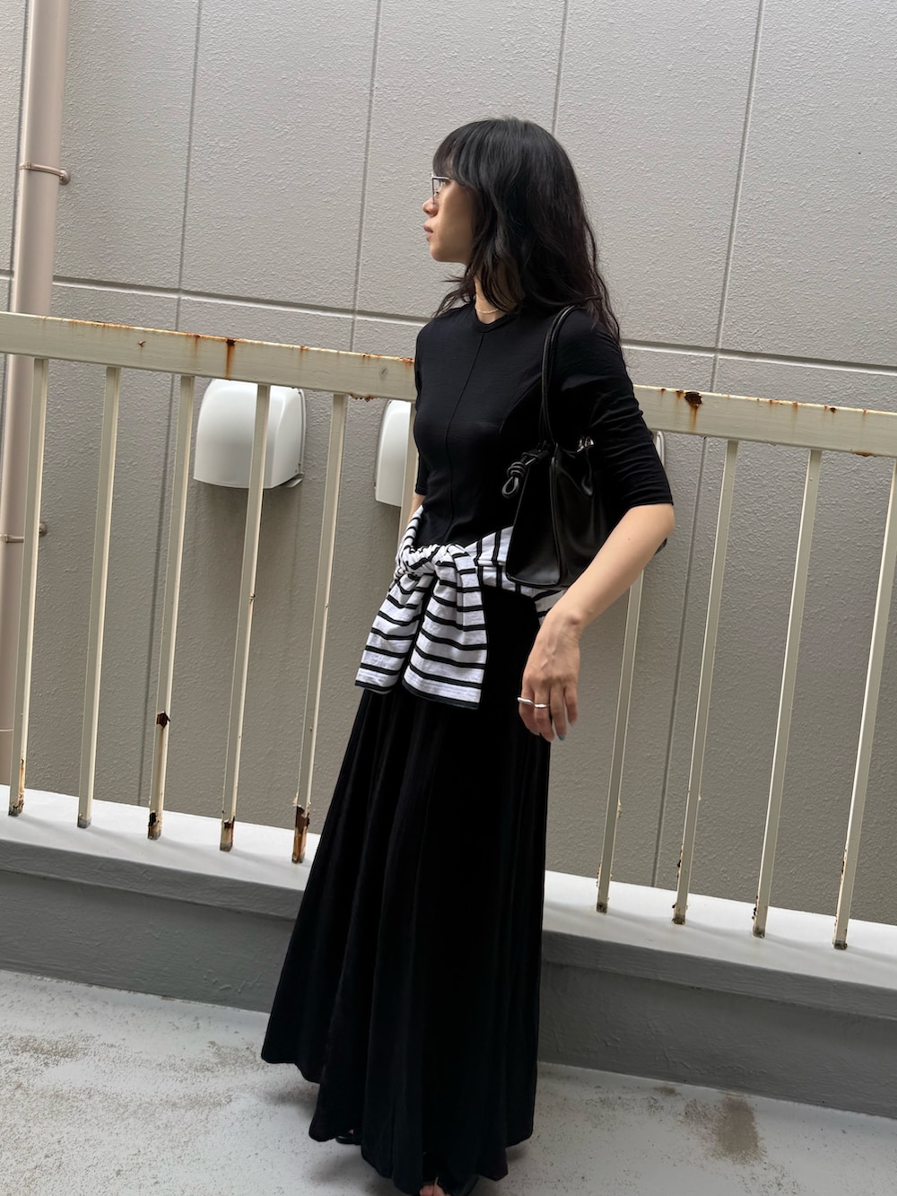 シンプルなので腰にボーダーカットソーを巻いてみました。
