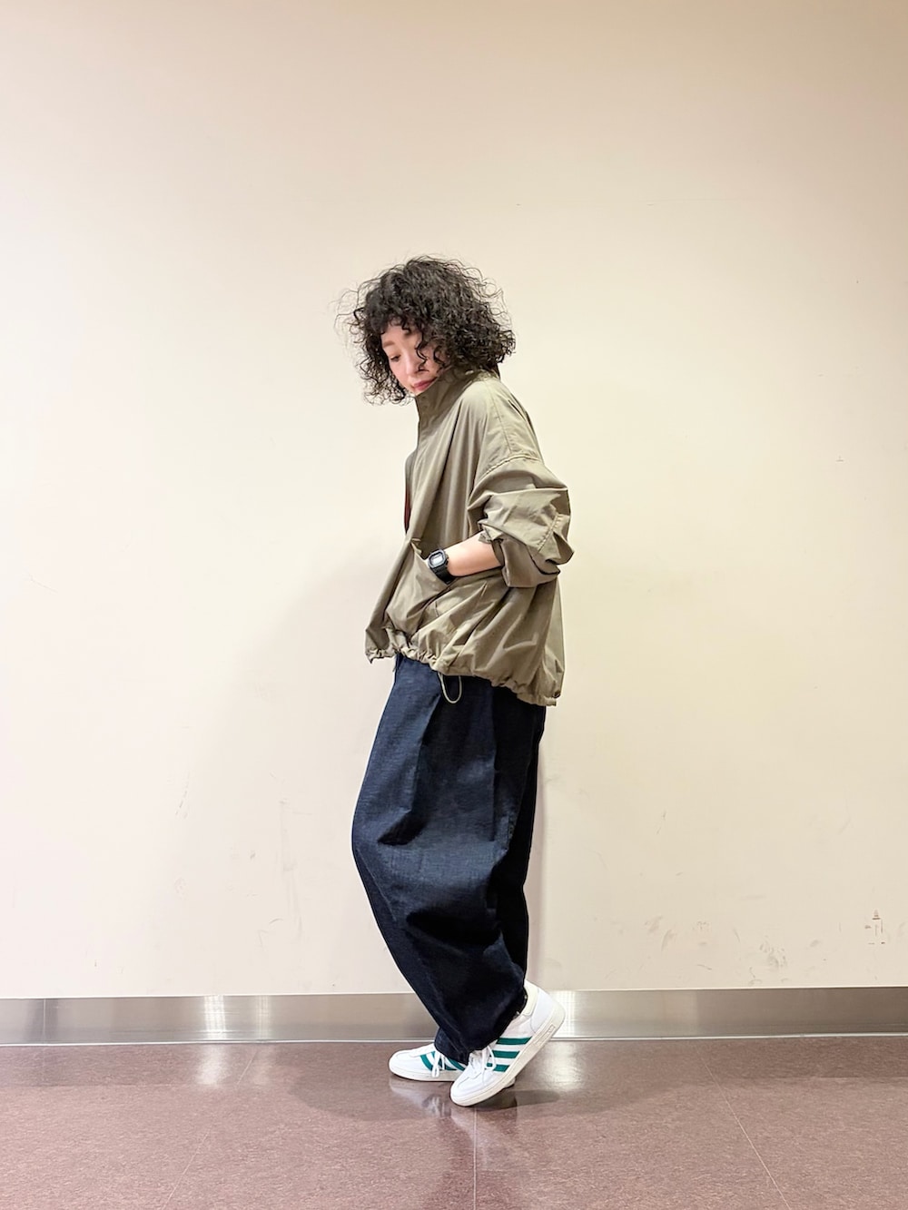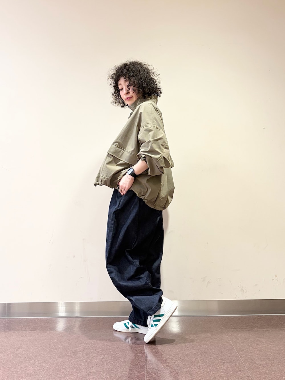裾のドローコードを絞って丸いシルエットにすれば、丈感も相まって女性らしさもちゃんとあります♪