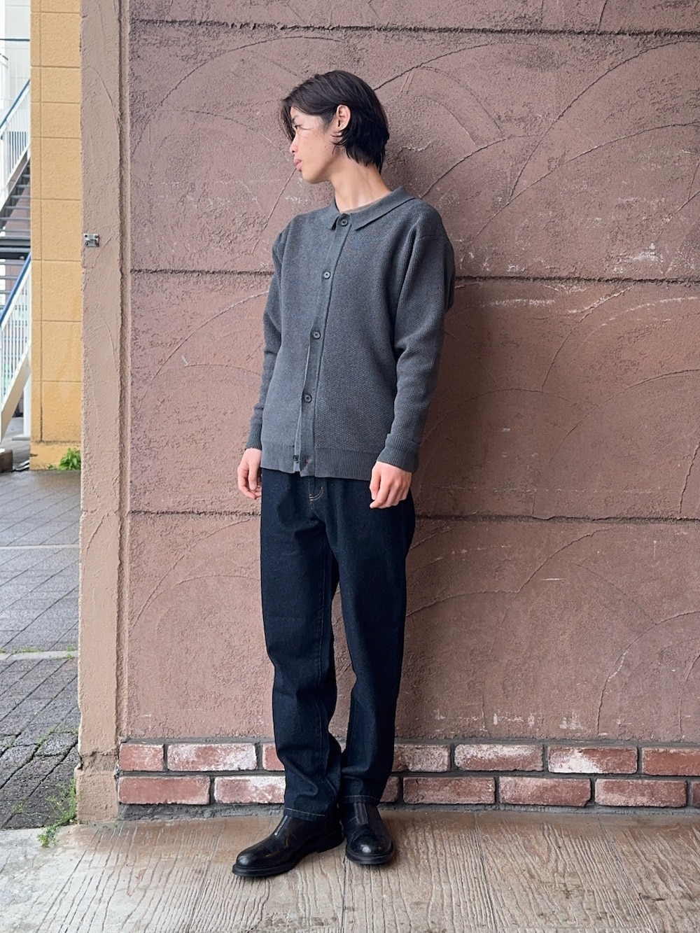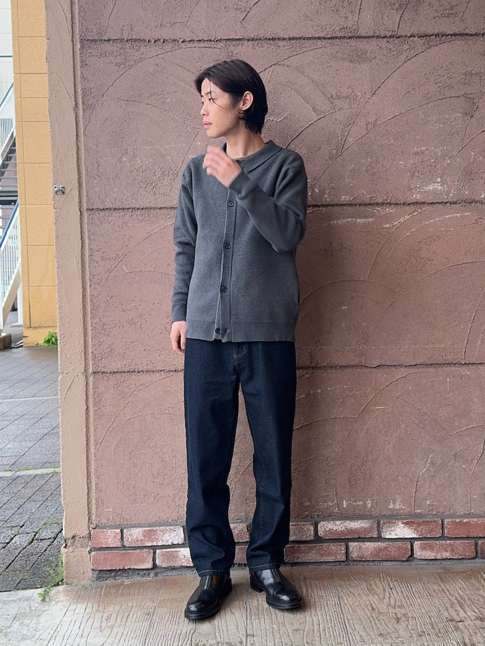 今回のコーディネートはチャコールのポロカーディガンにインディゴのデニムパンツを合わせました!ポロカーディガンは1枚で楽にオシャレなアイテムです!夏以外使っていただけます!デニムパンツはシンプルなストレートのシルエットです!基本なんでも合わせていただけます!