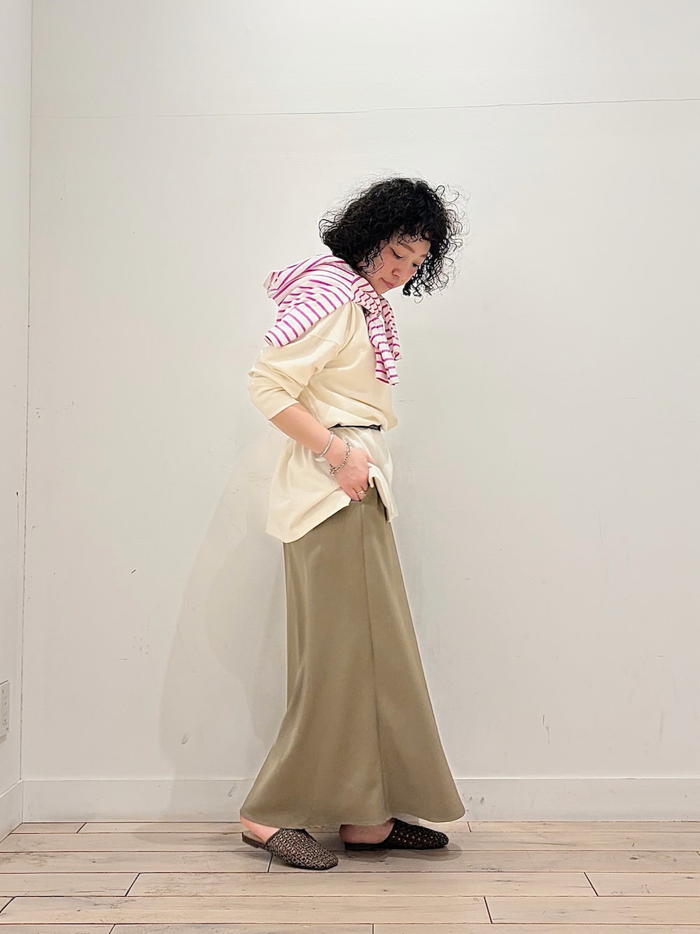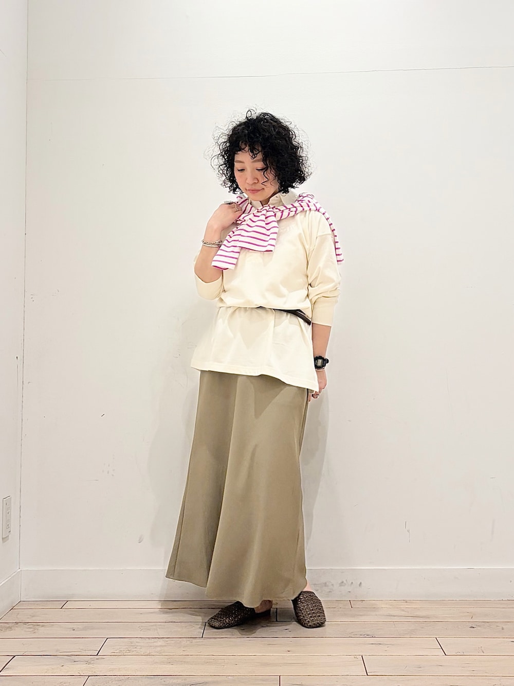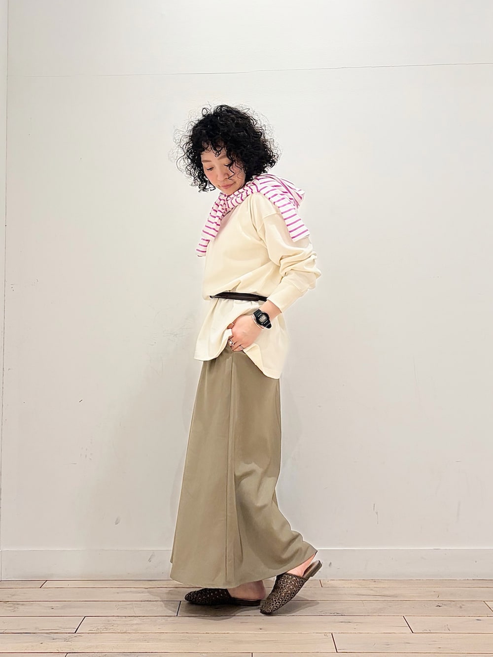 オーバーサイズのトップスをブラウジングして、キレイめスカートに寄せた気取りすぎない、ちょっぴりラフさもあるコーデ