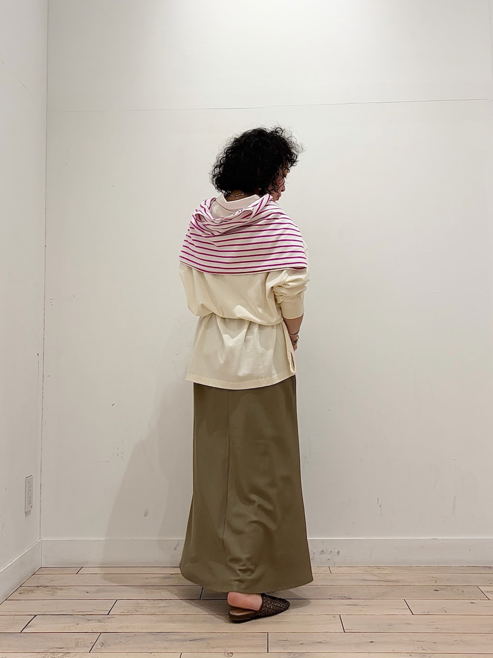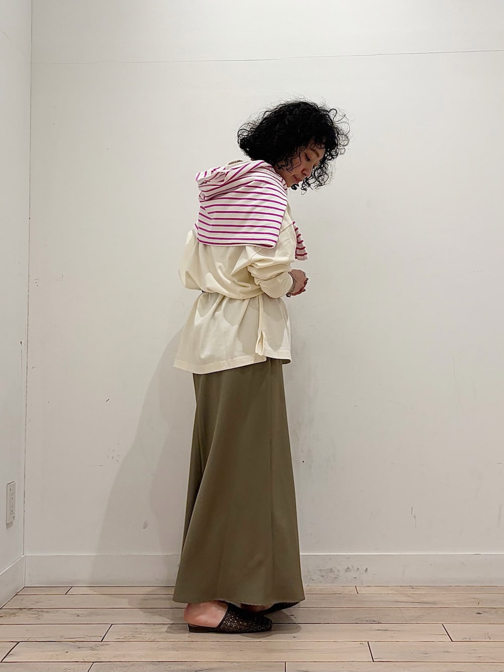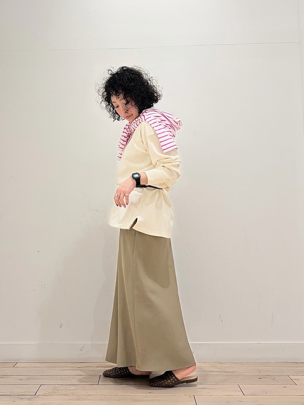 オーバーサイズのトップスをブラウジングして、キレイめスカートに寄せた気取りすぎない、ちょっぴりラフさもあるコーデ