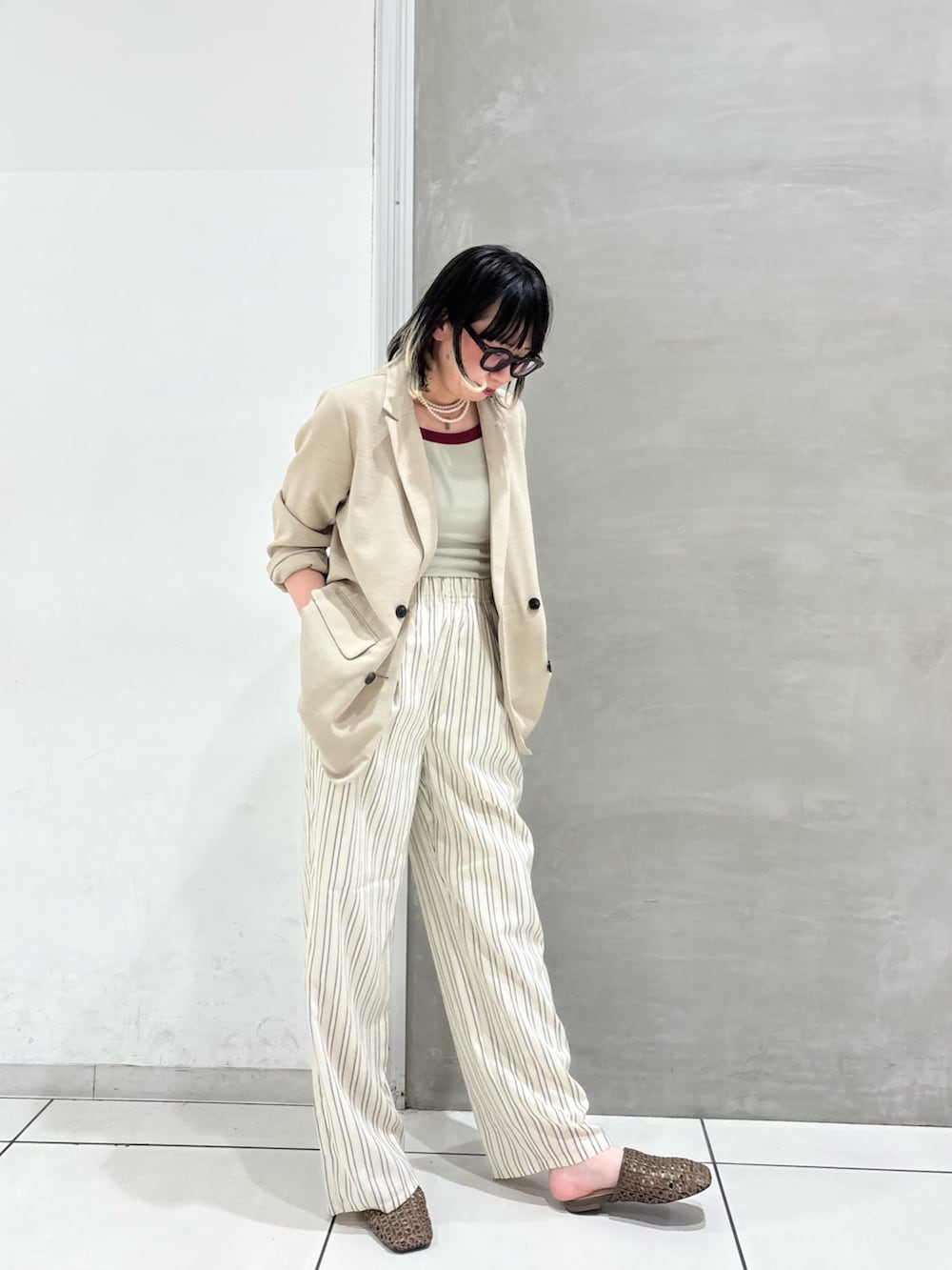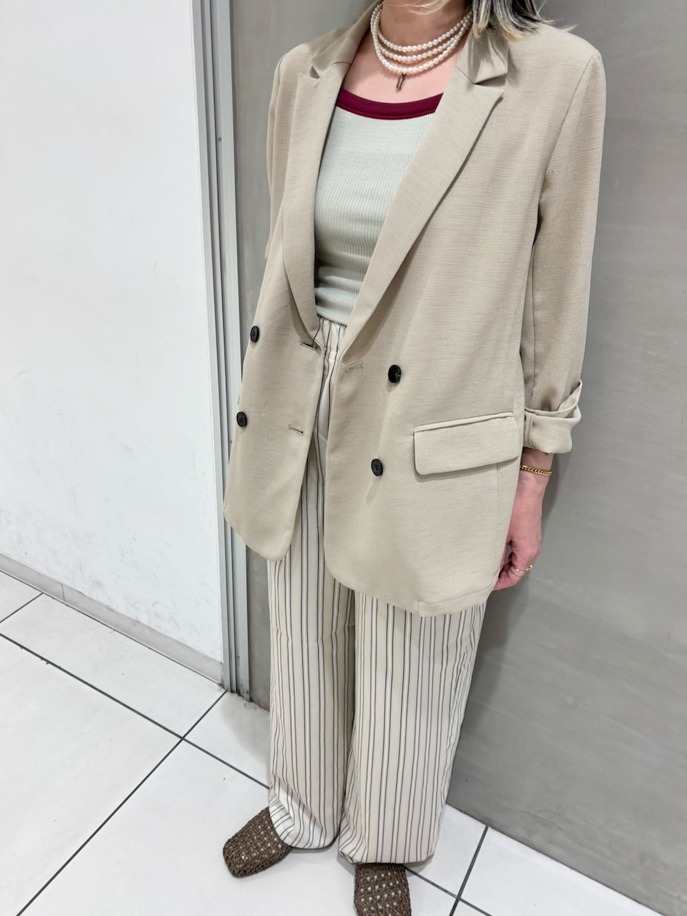 リラックススタイルですがジャケットとパールネックレスで上品でキレイめスタイルに変身🥷