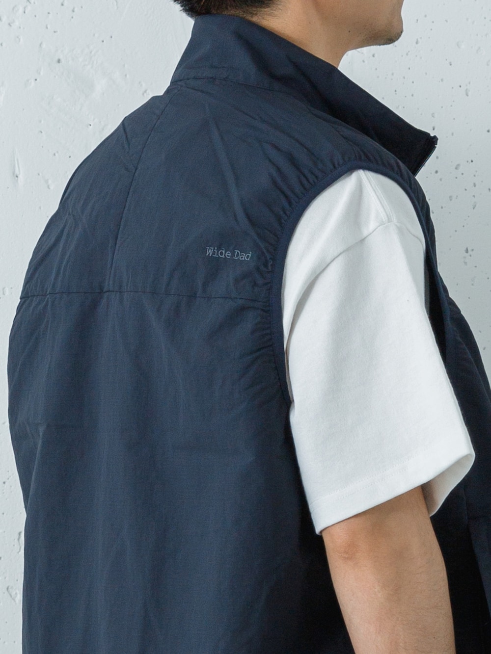 Wide DadのベストとイージーパンツにLOTTOのTシャツを合わせたレイヤードコーデ。