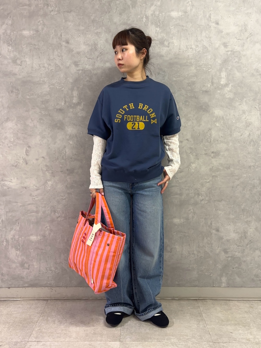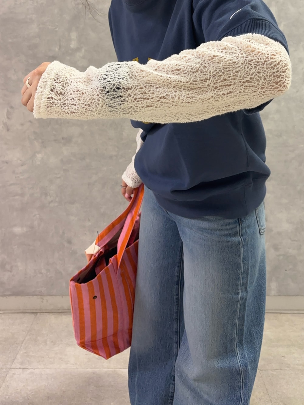 半袖スウェット×ジーンズのカジュアルスタイルにも、この時期だからこそ楽しめるレイヤードでレース素材をチョイス。