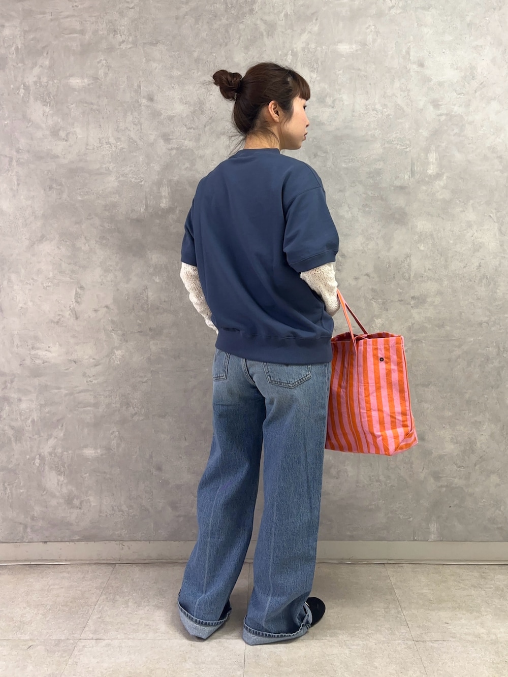 下半身がデニムなどシンプルな時はバックに色物を選ぶと映えるコーディネートになります✨