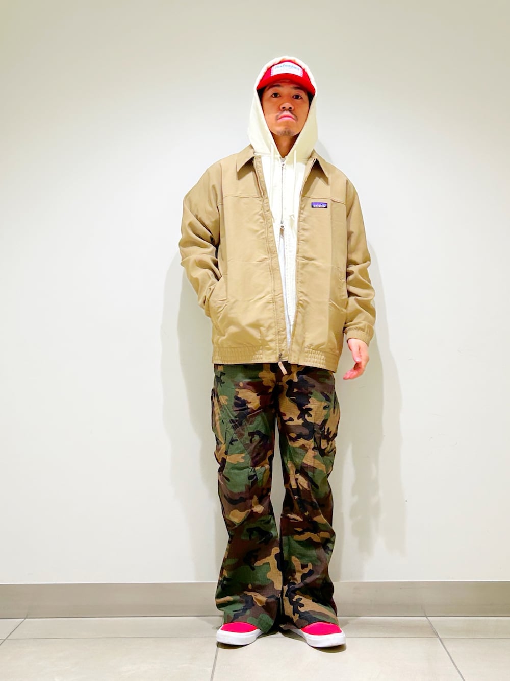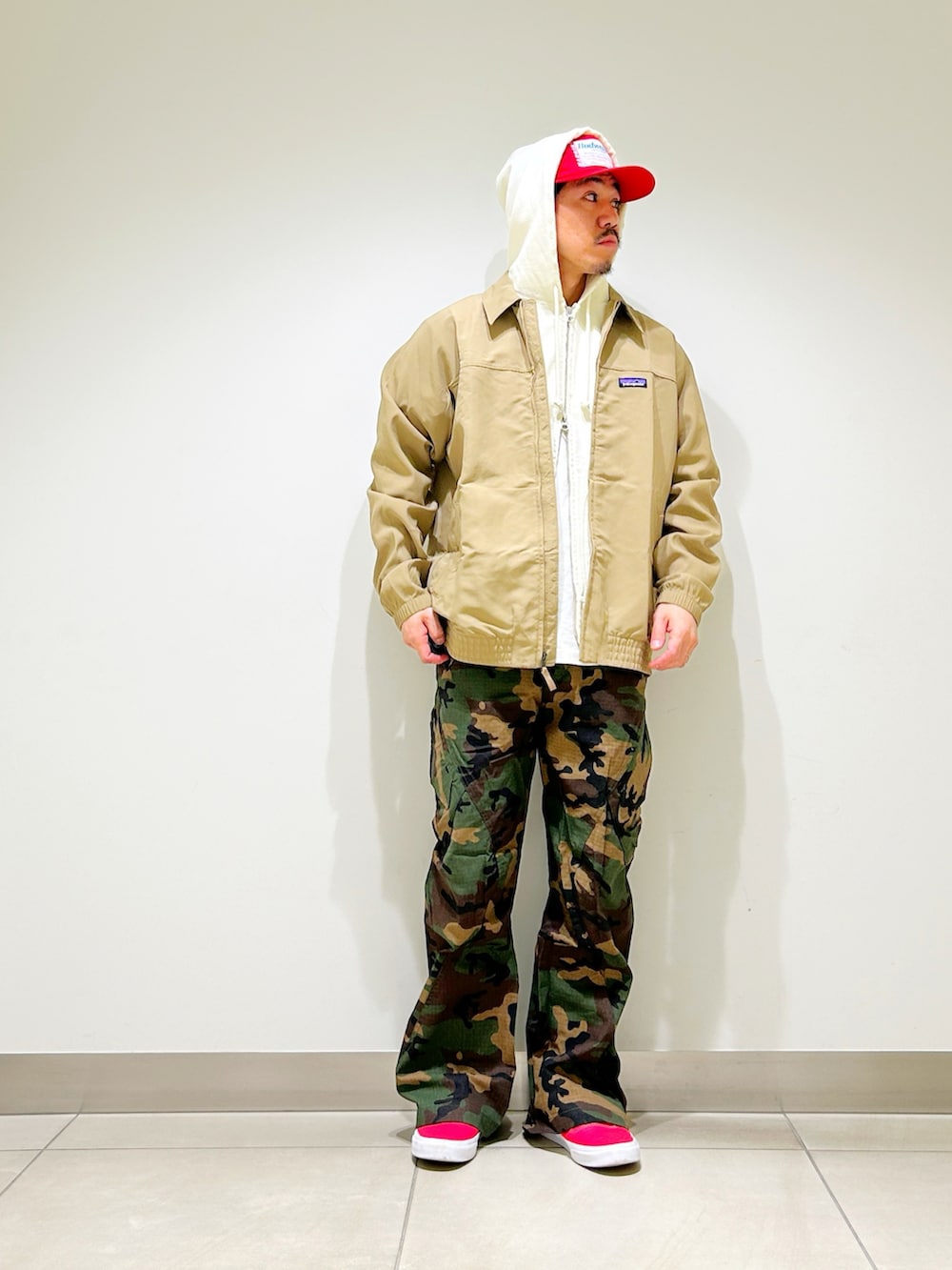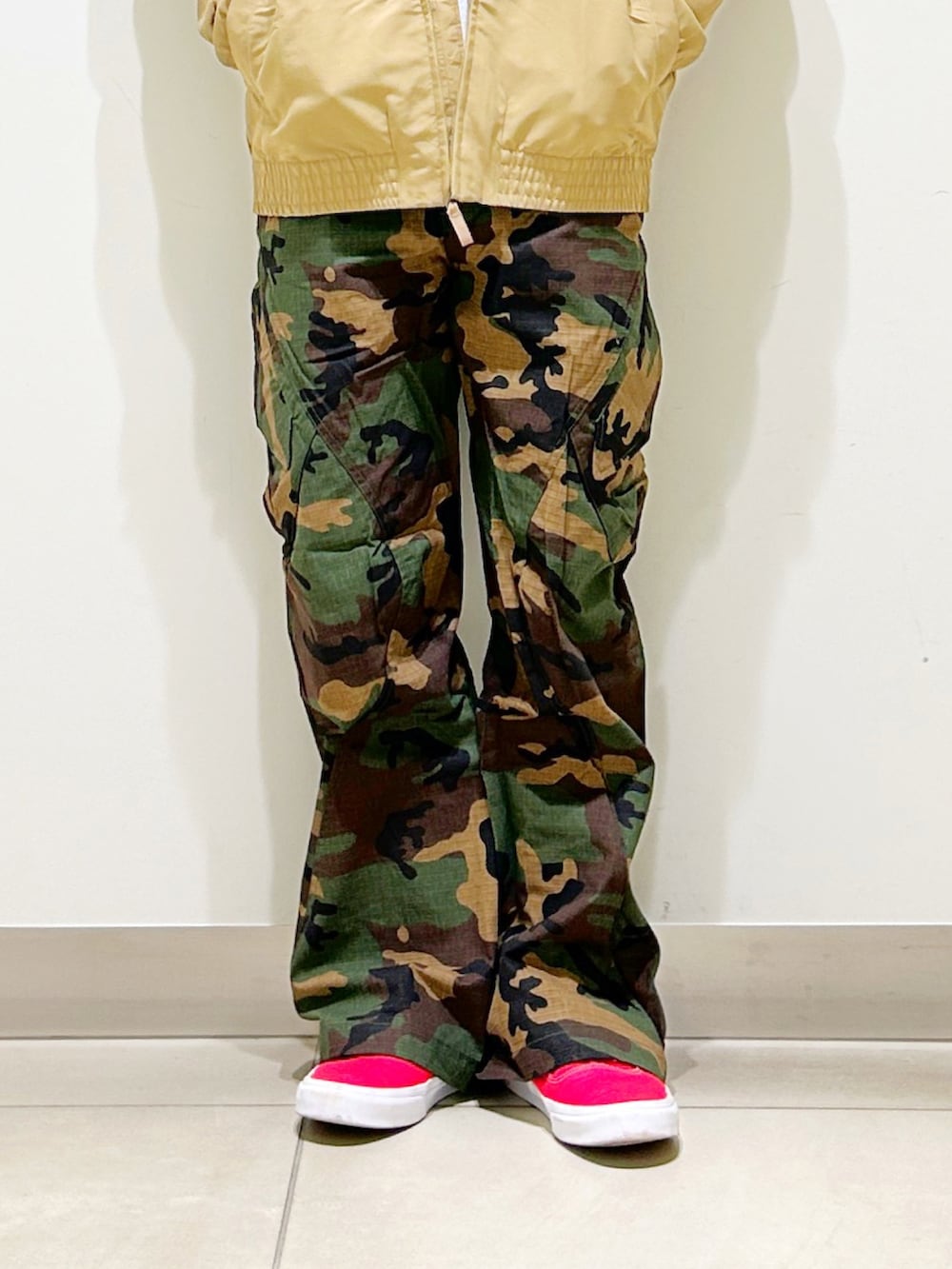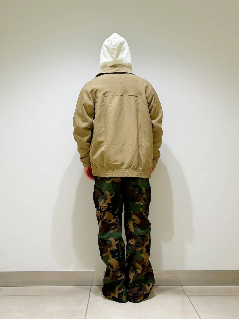 ベージュのブルゾンにウッドランドカモのパンツを合わせたカジュアルスタイル。