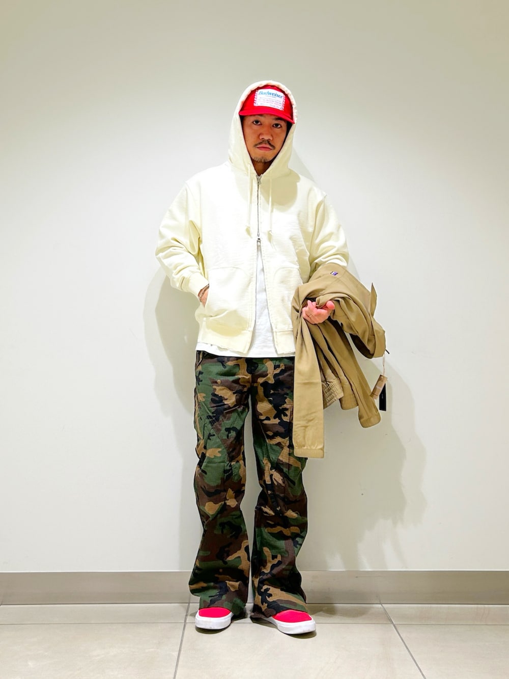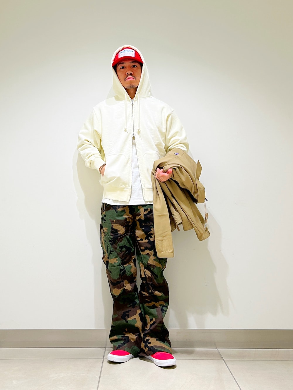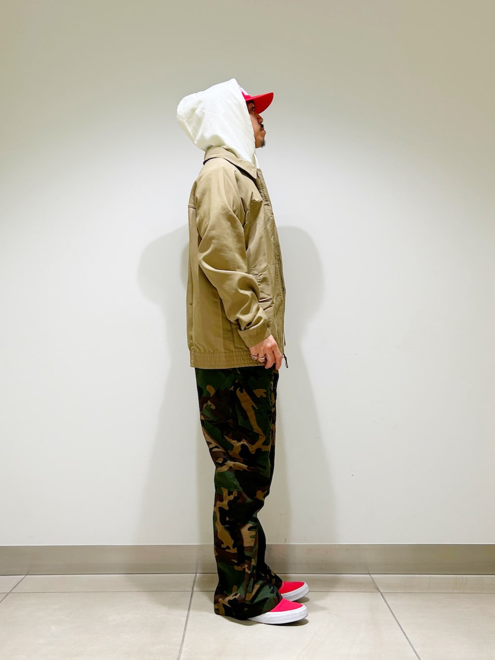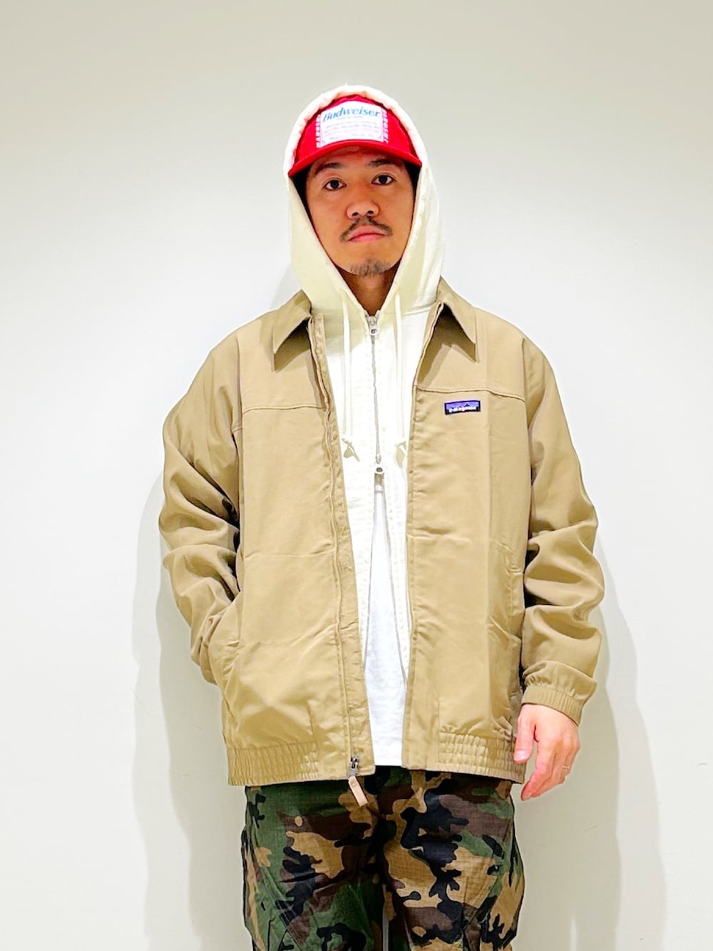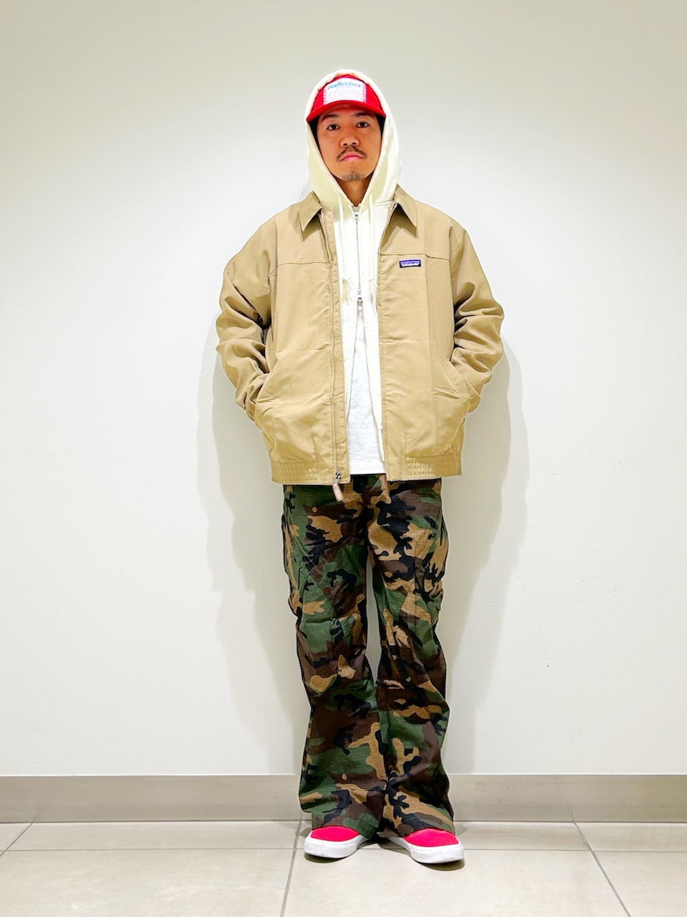 ベージュのブルゾンにウッドランドカモのパンツを合わせたカジュアルスタイル。