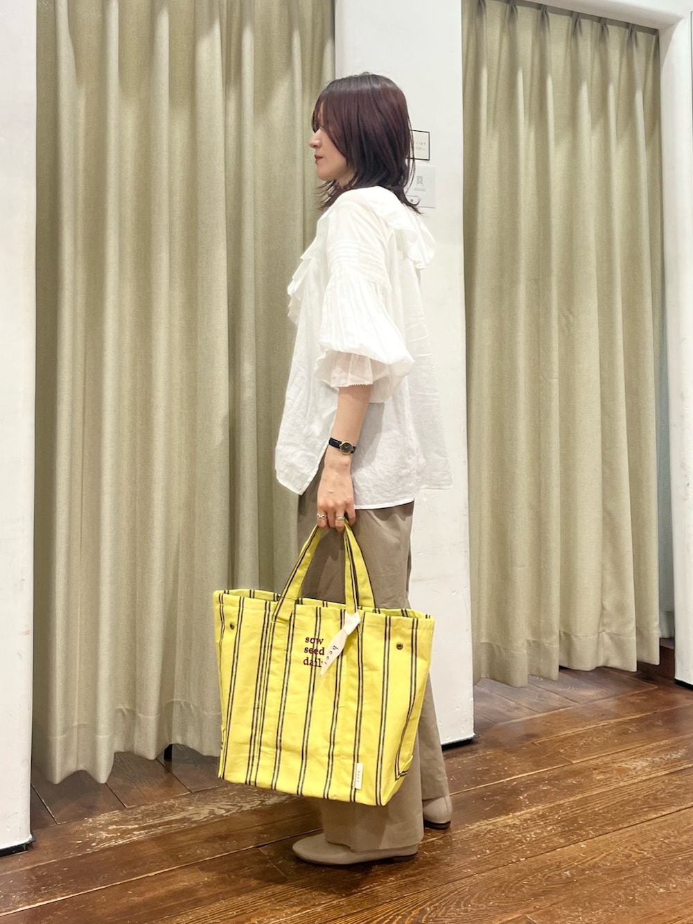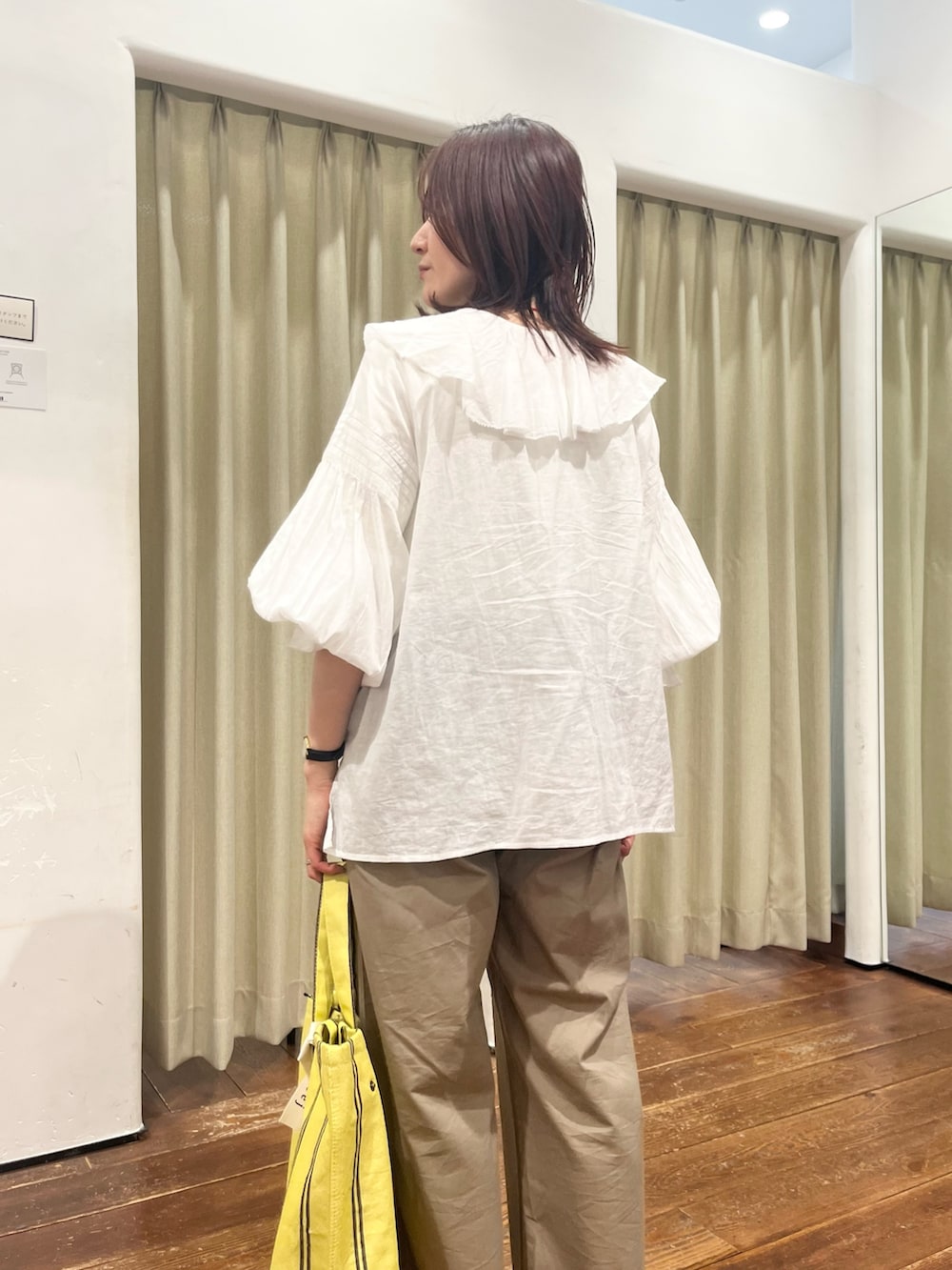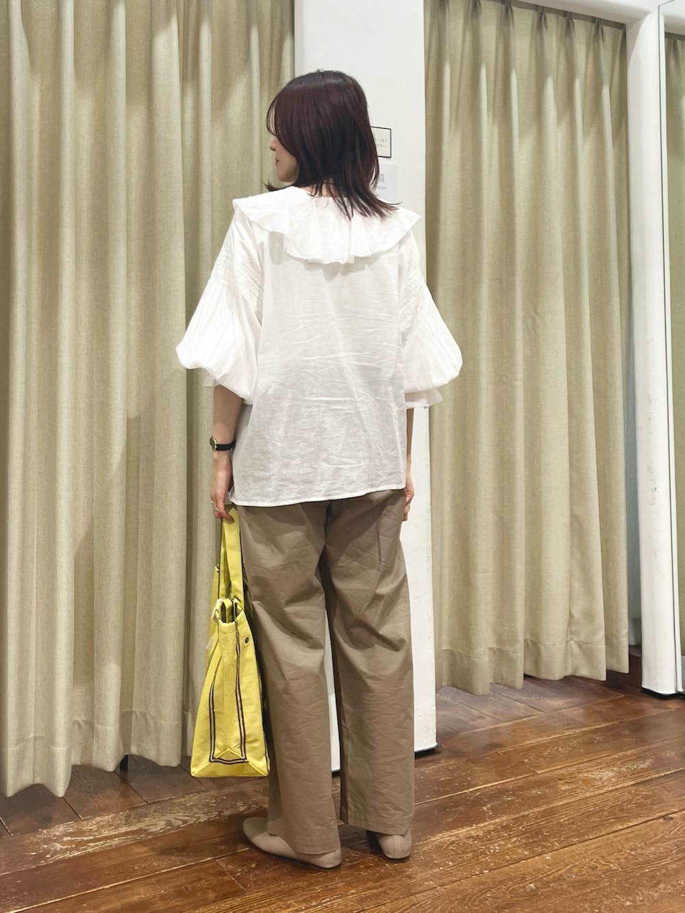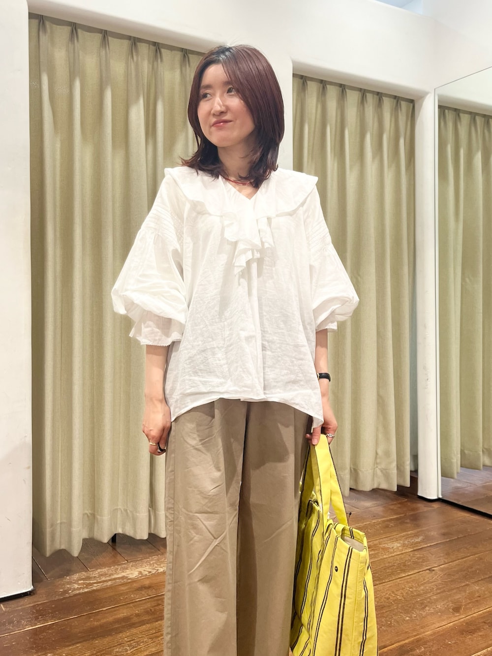 合わせたパンツはコットンとレーヨン素材で薄手ですが透け感も無く、夏まで使える万能なアイテムです。ハリ感もあり、オンオフ兼用でお使いいただけます。156㎝でSサイズを着用しております。