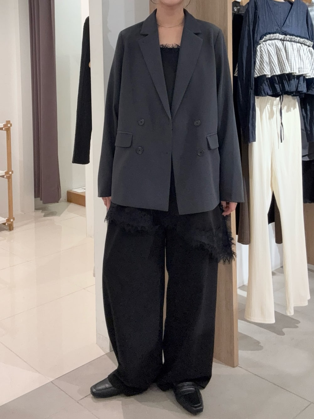 ボトムはゆるっと、ジャケットでカチッと全体を閉め、腰回りにくるレースデザインがふと見えた時に可愛い、となるコーデにしてみました。