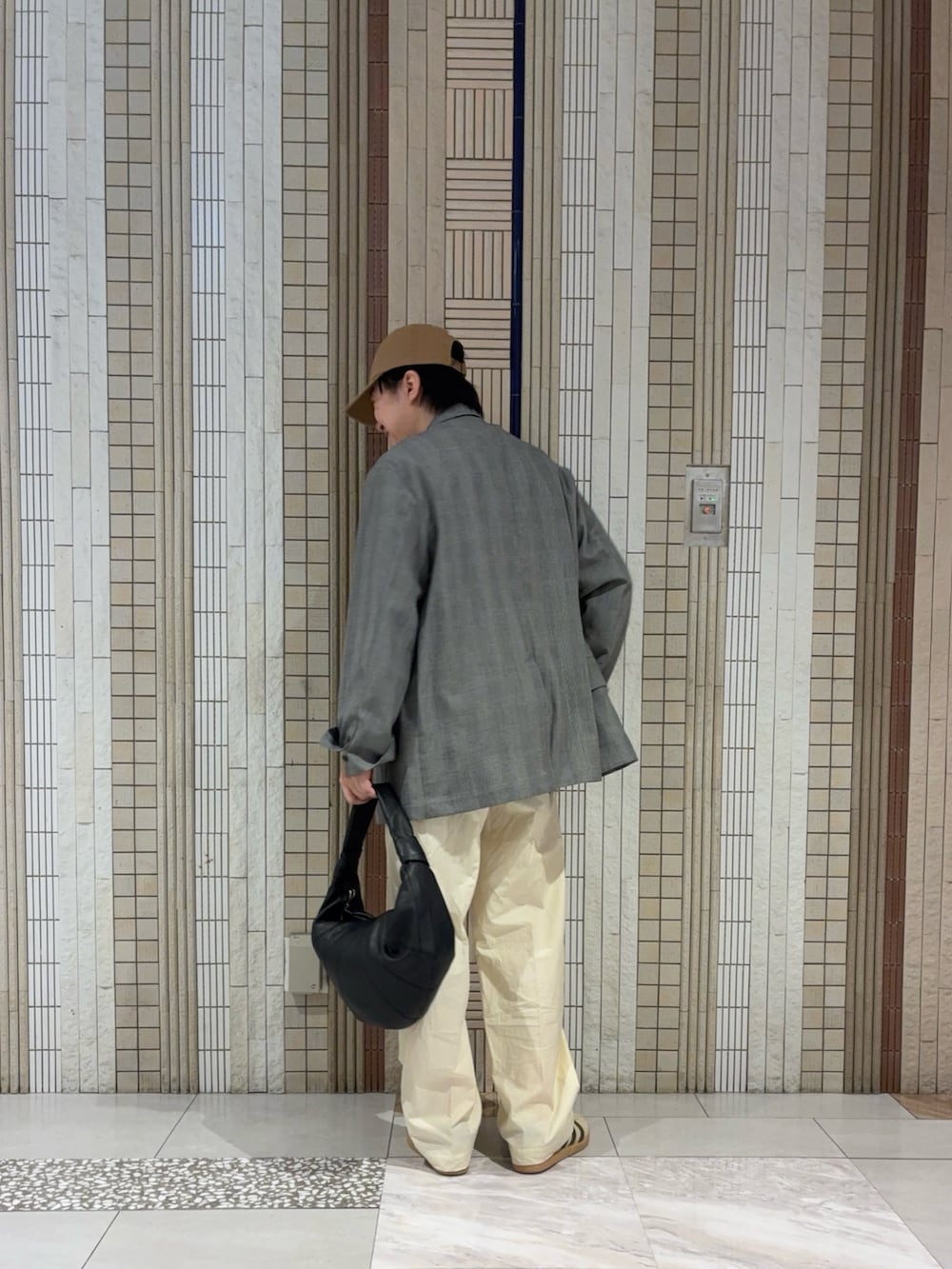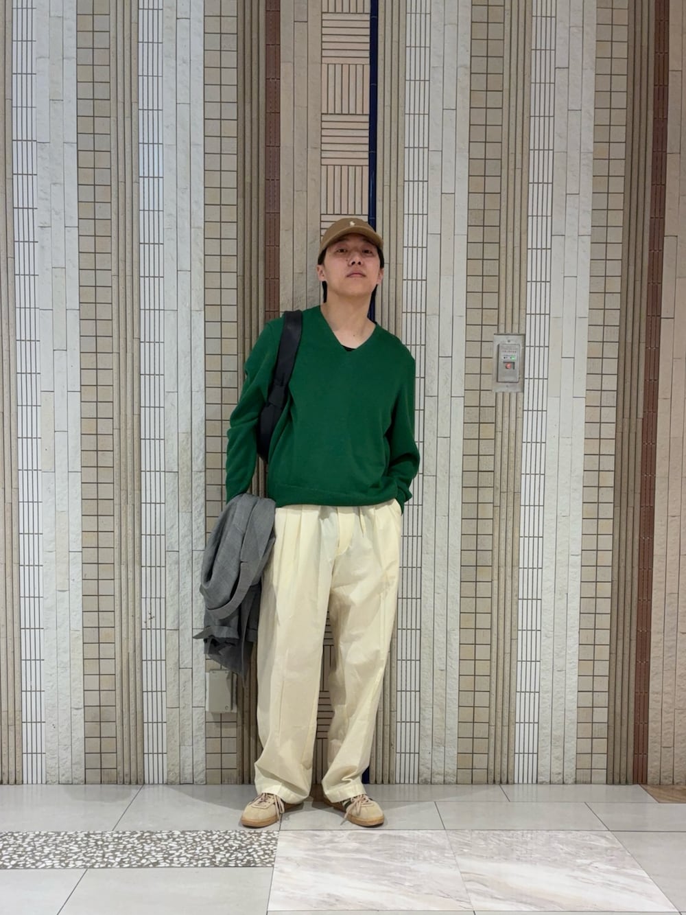 さて、なんか良い感じになりました。インナーは白を買ったんですが最初から気になっていたのは緑でした。もう一枚追加も視野に入ってます。アイテムのニュートラルさが迷走する私の気分に寄り添ってくれます。「好きにしたらええんやで。」と実家の両親の声が聞こえてくるかのようです。パンツは紐パン。ジャケットは大きめ。全体的にだいぶとリラックスした雰囲気です。寝癖は帽子で隠せば寝坊もバレません。
