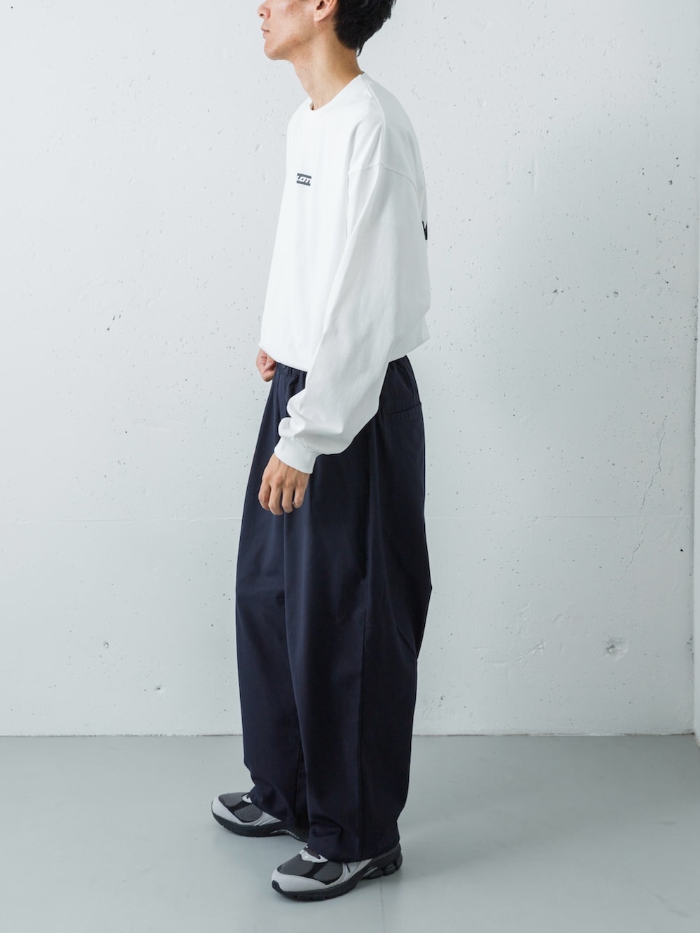 腰回りをスッキリと見せることで、スポーティーなアイテムを使いながらも、どこか上品でクラシカルなシルエットを構築しています。機能的なテック素材のスラックスは、リラックスした穿き心地ながらもセンタープレスのような端正な表情を保ち、都会的な清潔感を演出します。