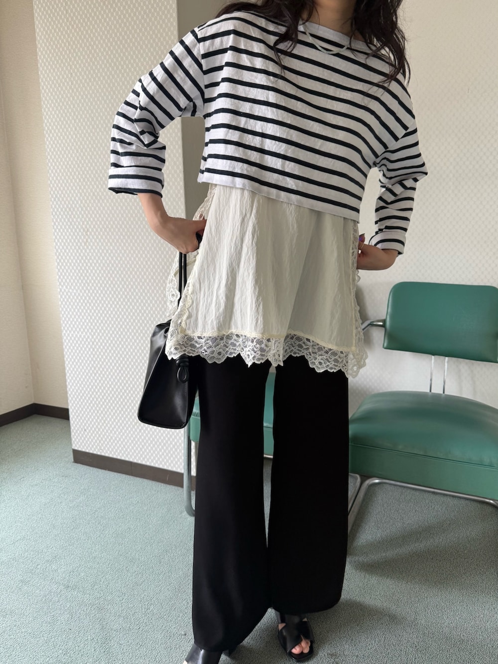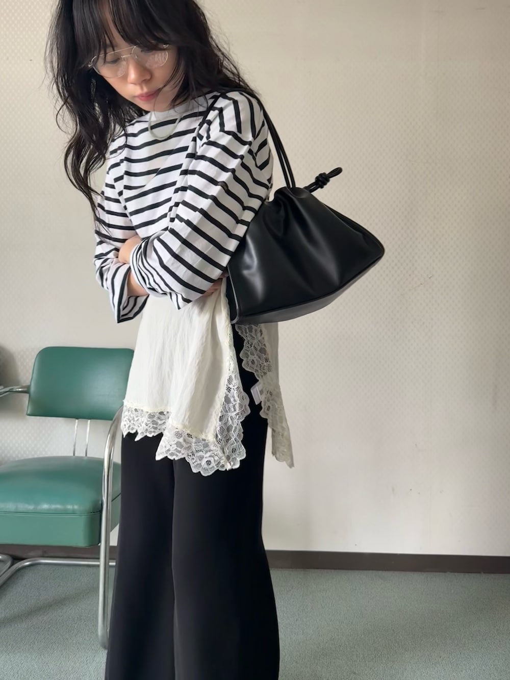 甘いアイテムなので、他はモノトーンでまとめて、大人っぽくコーディネートしました。