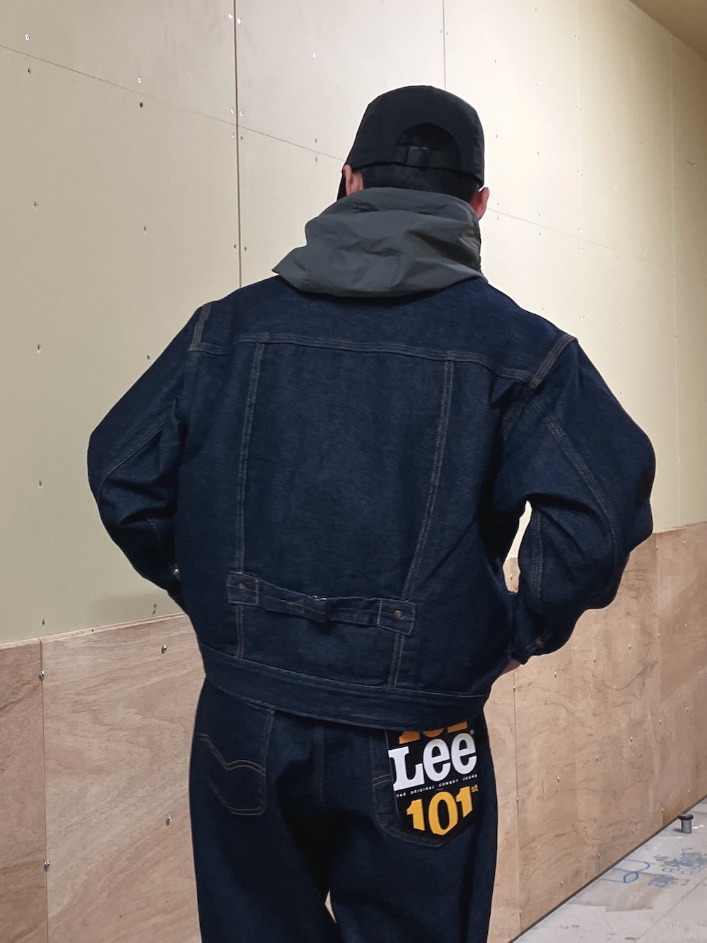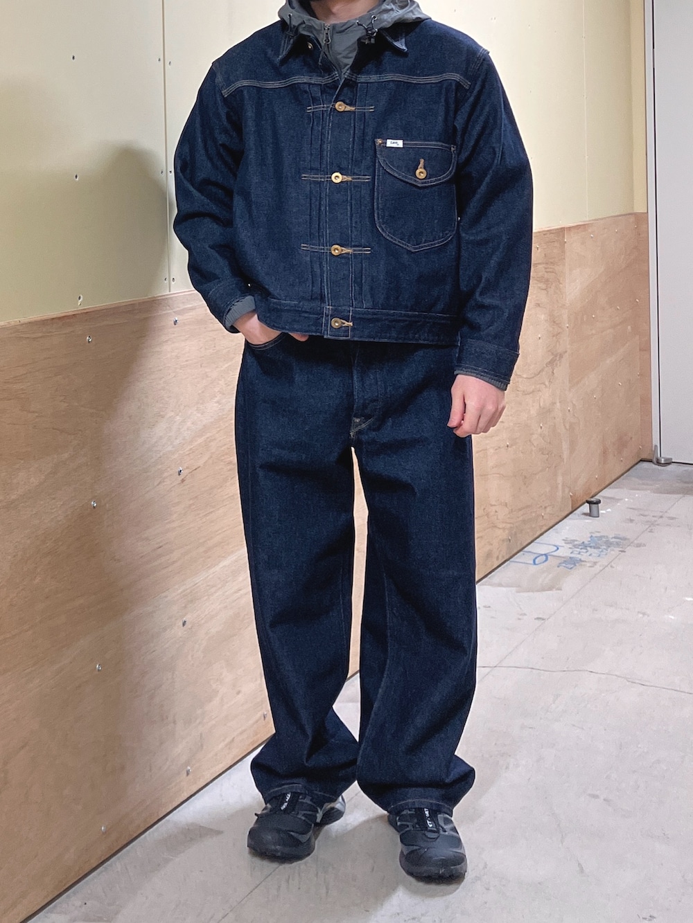 Lee別注のデニムセットアップにテック系のアイテムを合わせてみました。遊び心のあるコーディネートが好きです。
