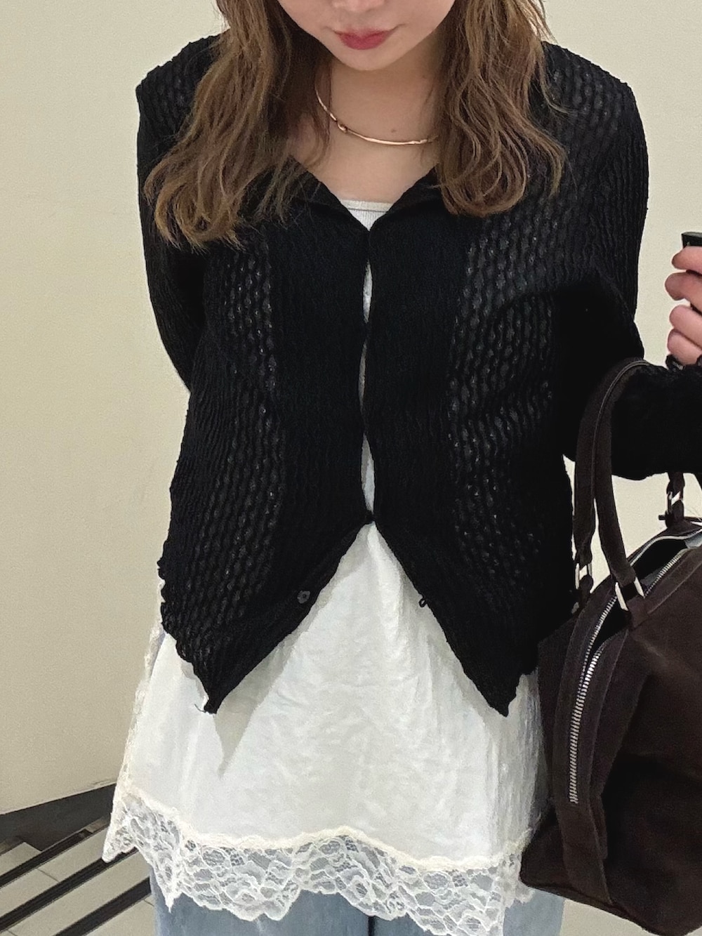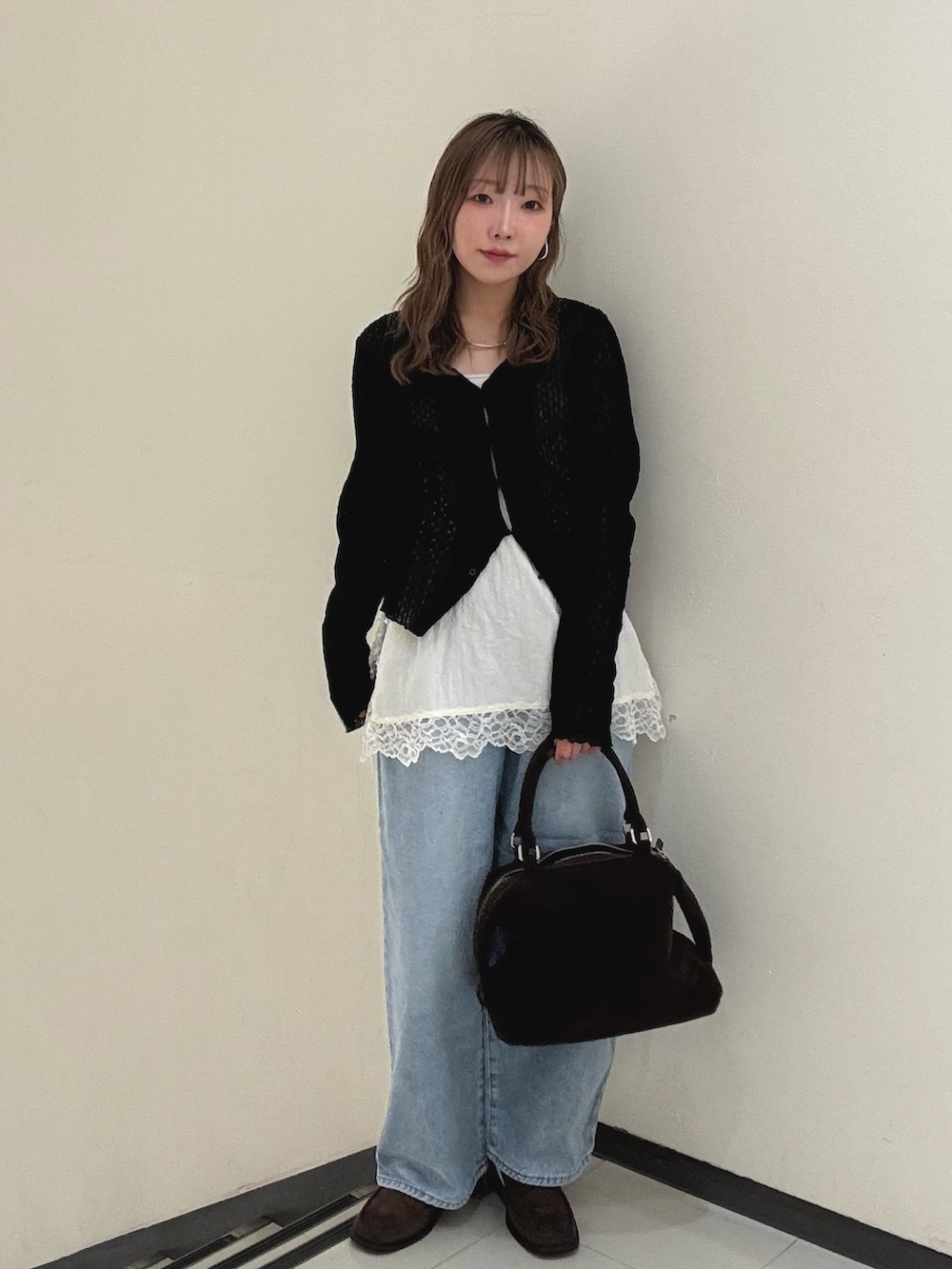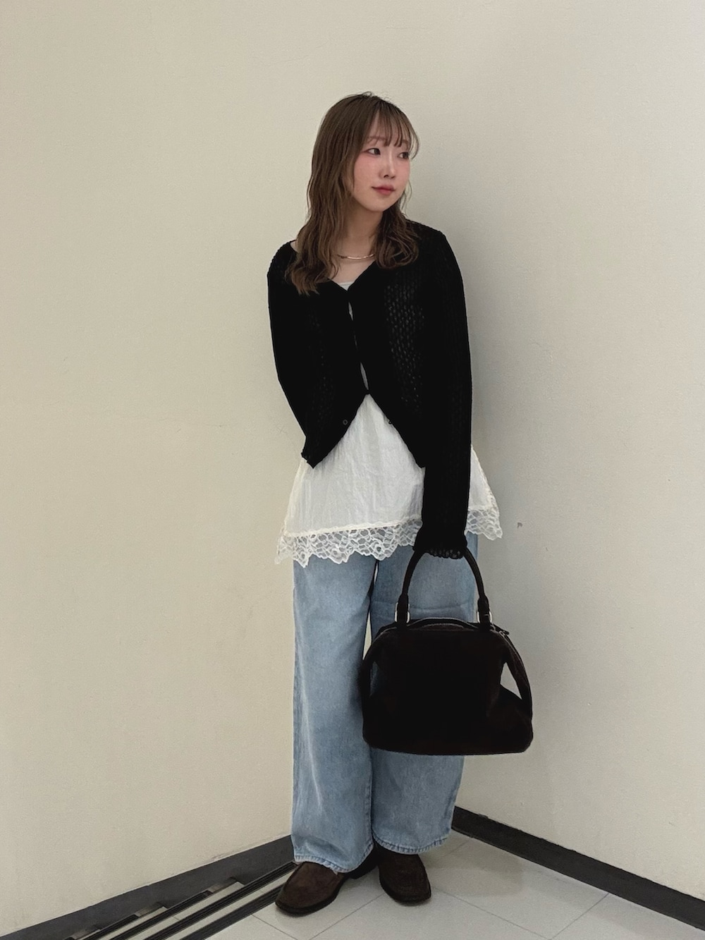 黒のカーデで全体を引き締めて、カジュアルすぎないバランスに仕上げました✧︎*。