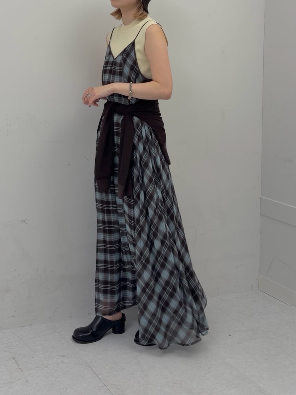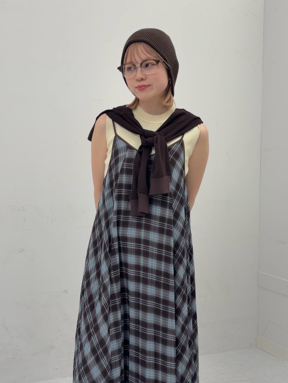 1枚で目を惹くチェックのキャミワンピース。