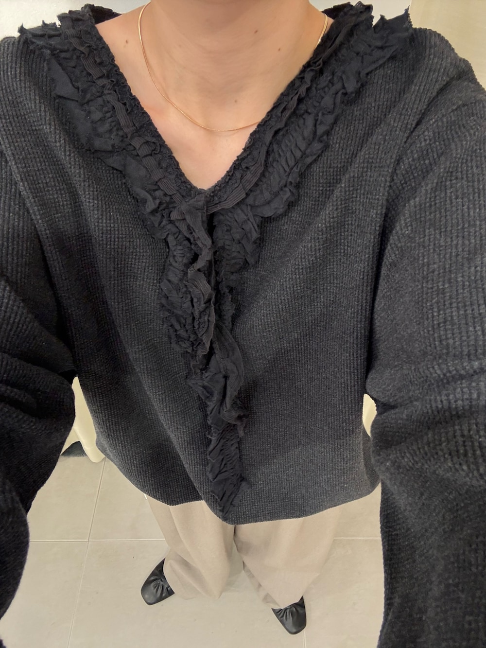トップスも、フリルにワッフル時のカジュアルさがうまく混ざって甘すぎず、色んな系統の方にオススメ!