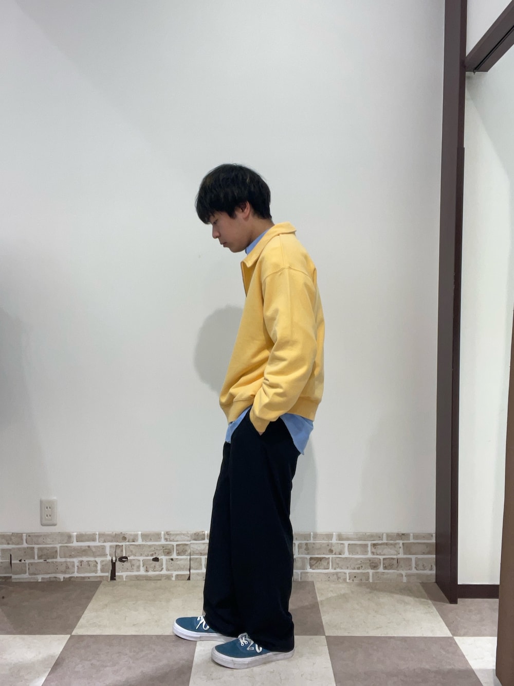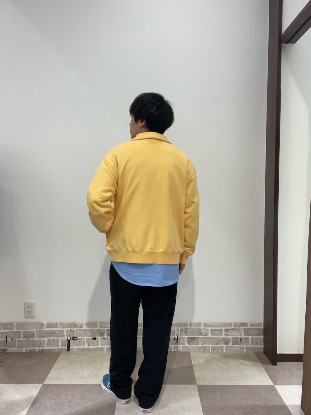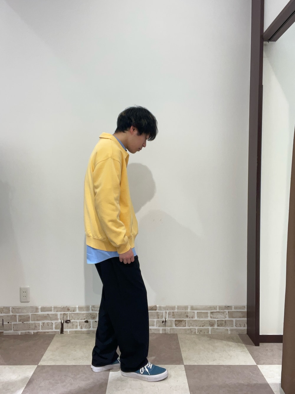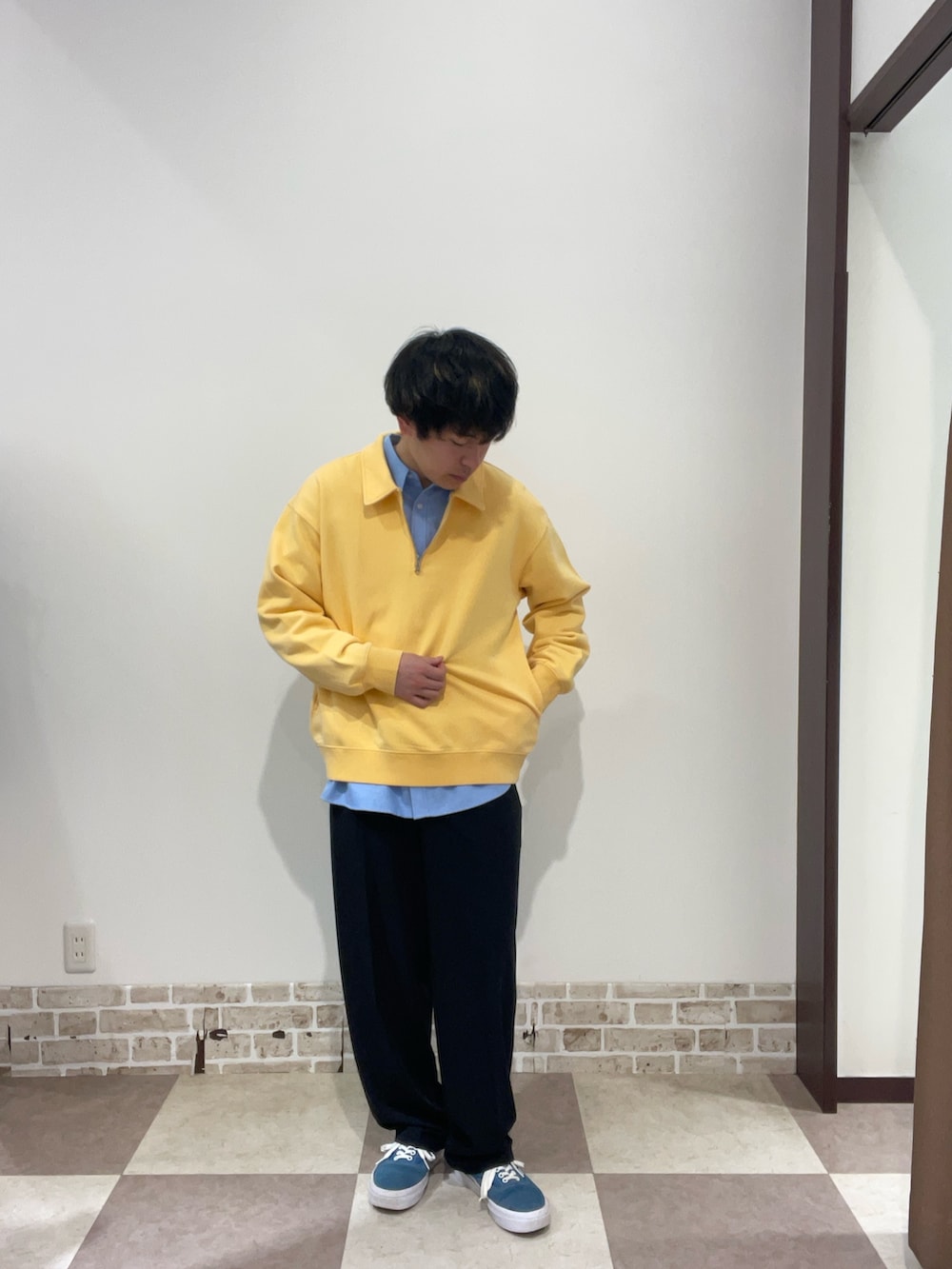 フェードがかかったカラー物のハーフジップスウェットのインナーに知的のあるシャツの相性抜群!違和感全くなしです。