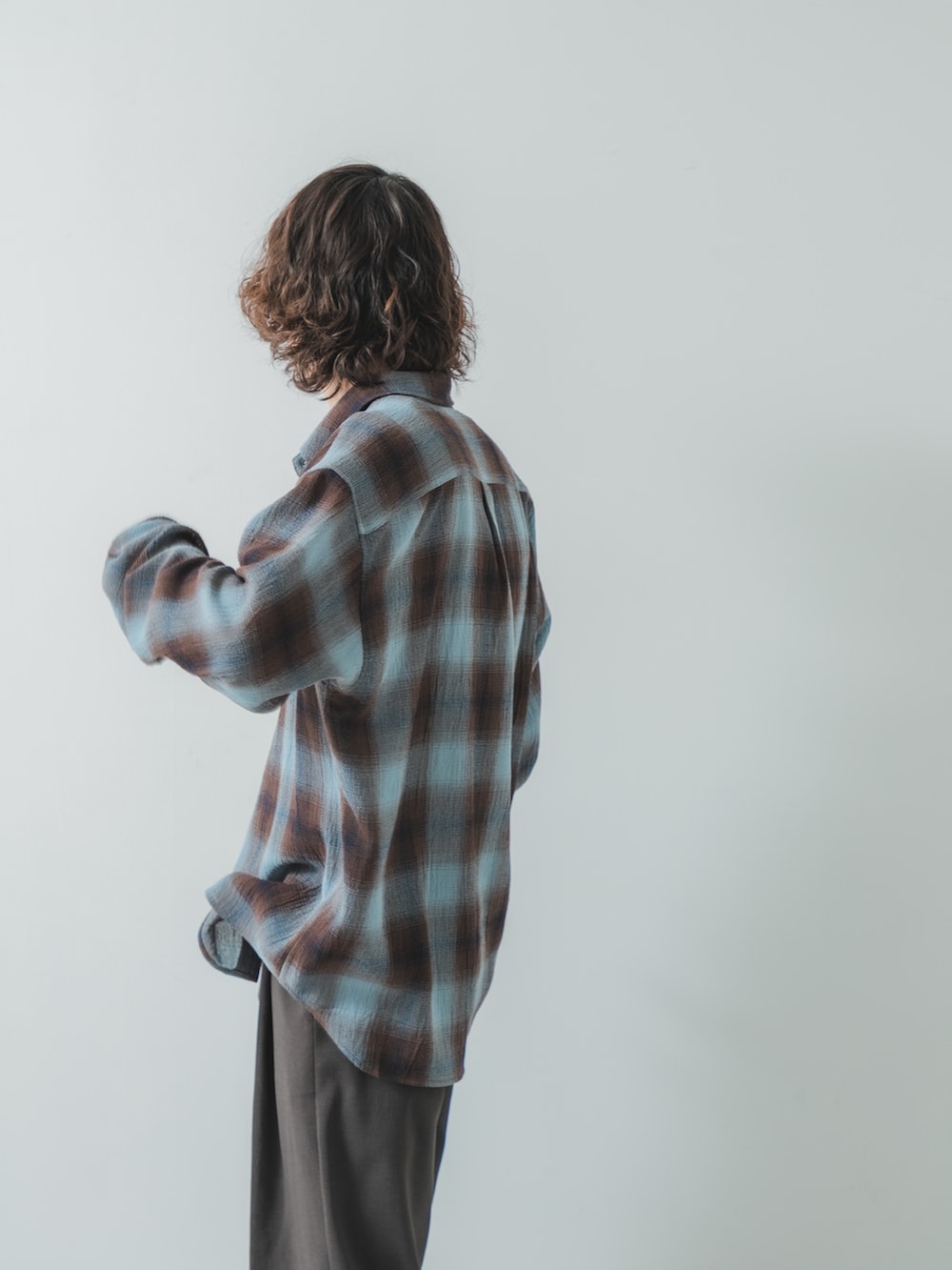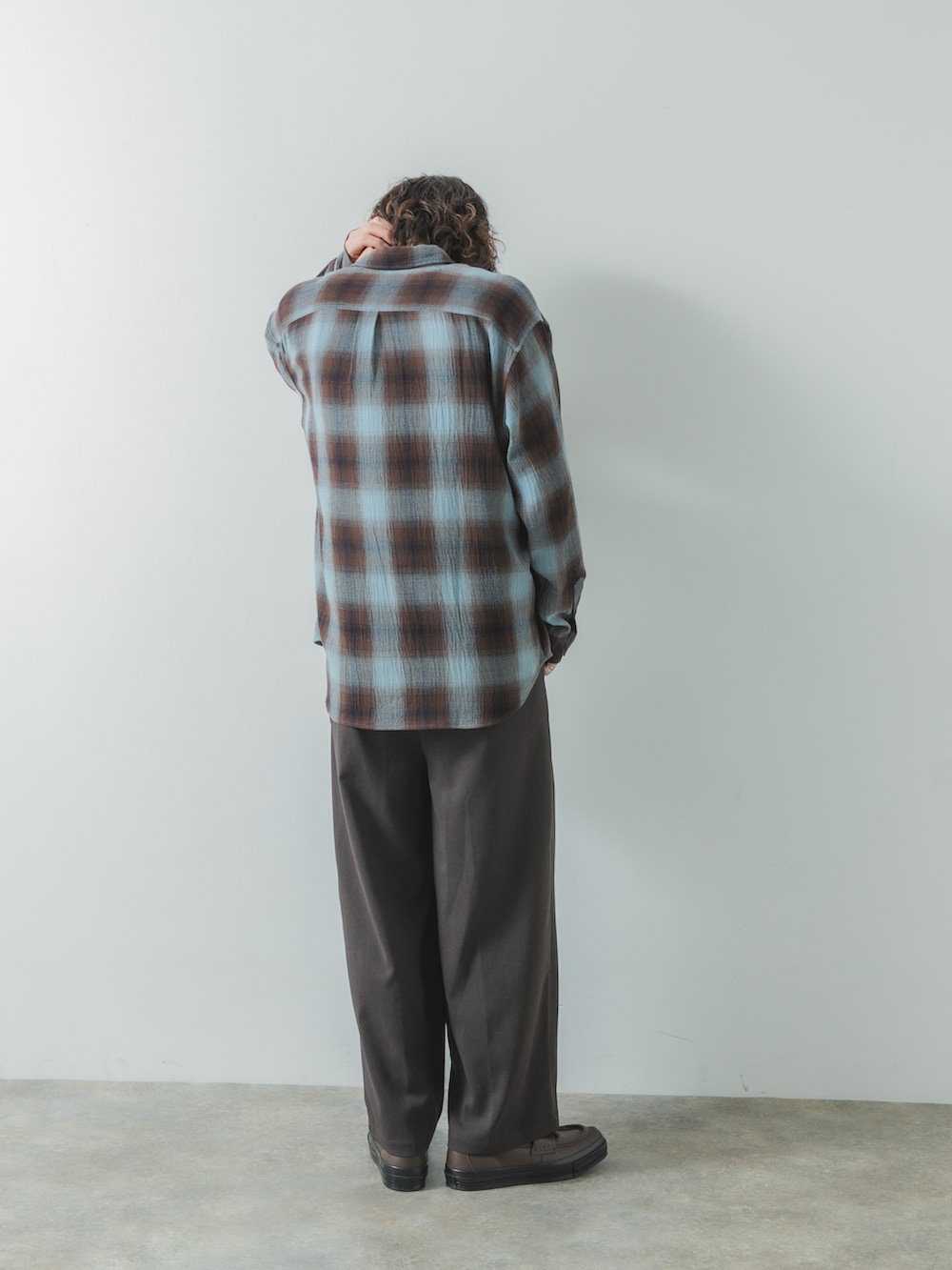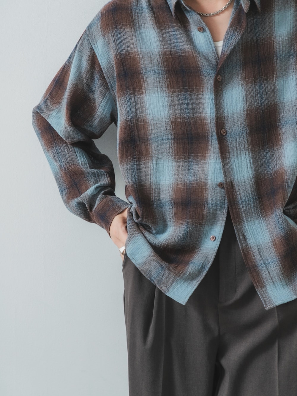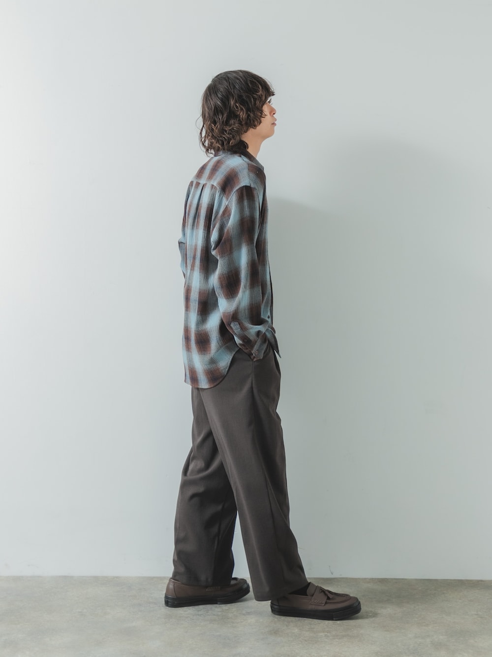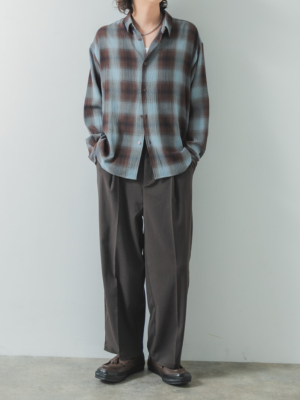 カジュアルになりやすいチェックシャツもスラックスに合わせると