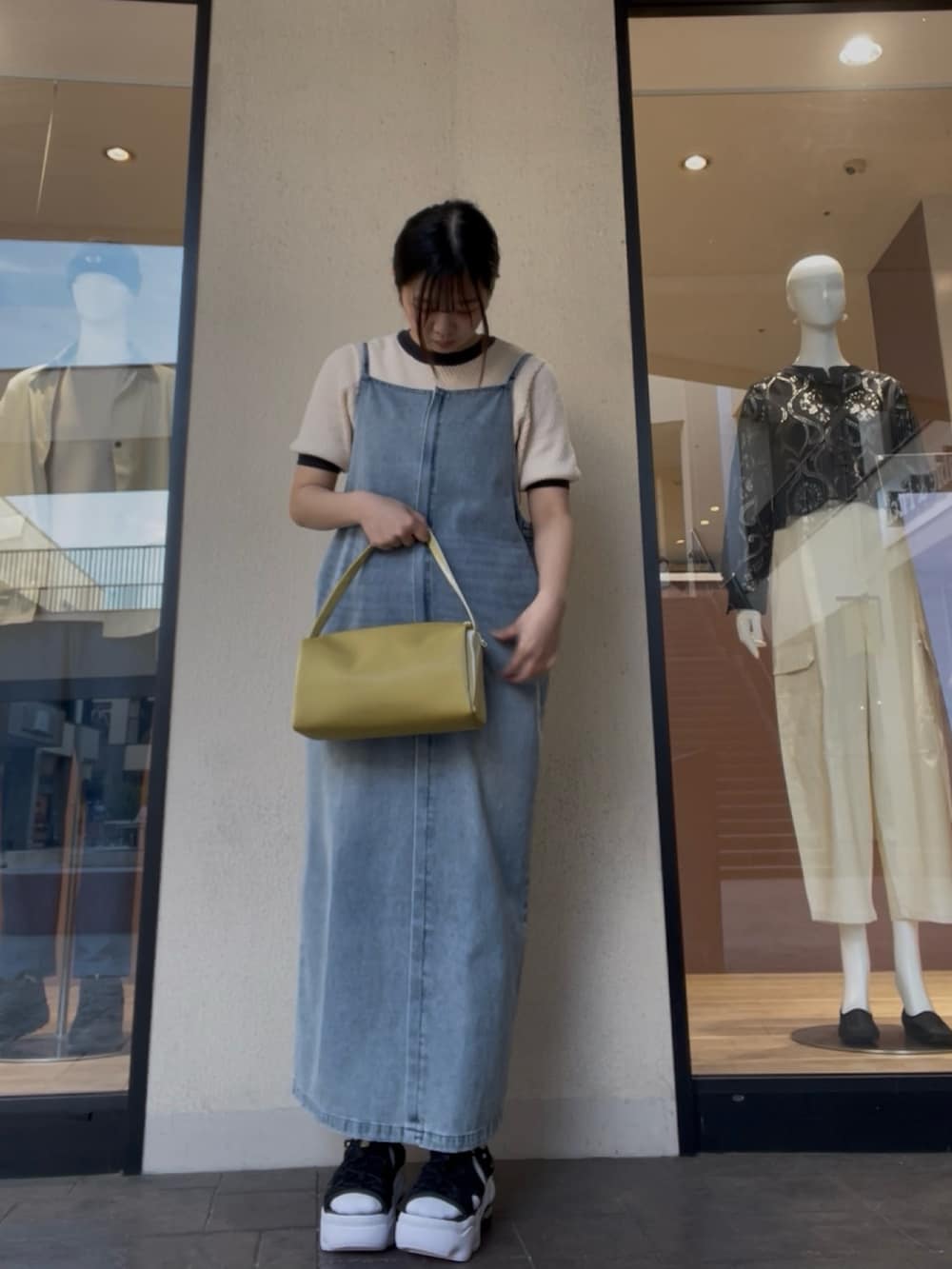 差し色にイエローのバッグを入れて、ぐっとこなれた印象に。