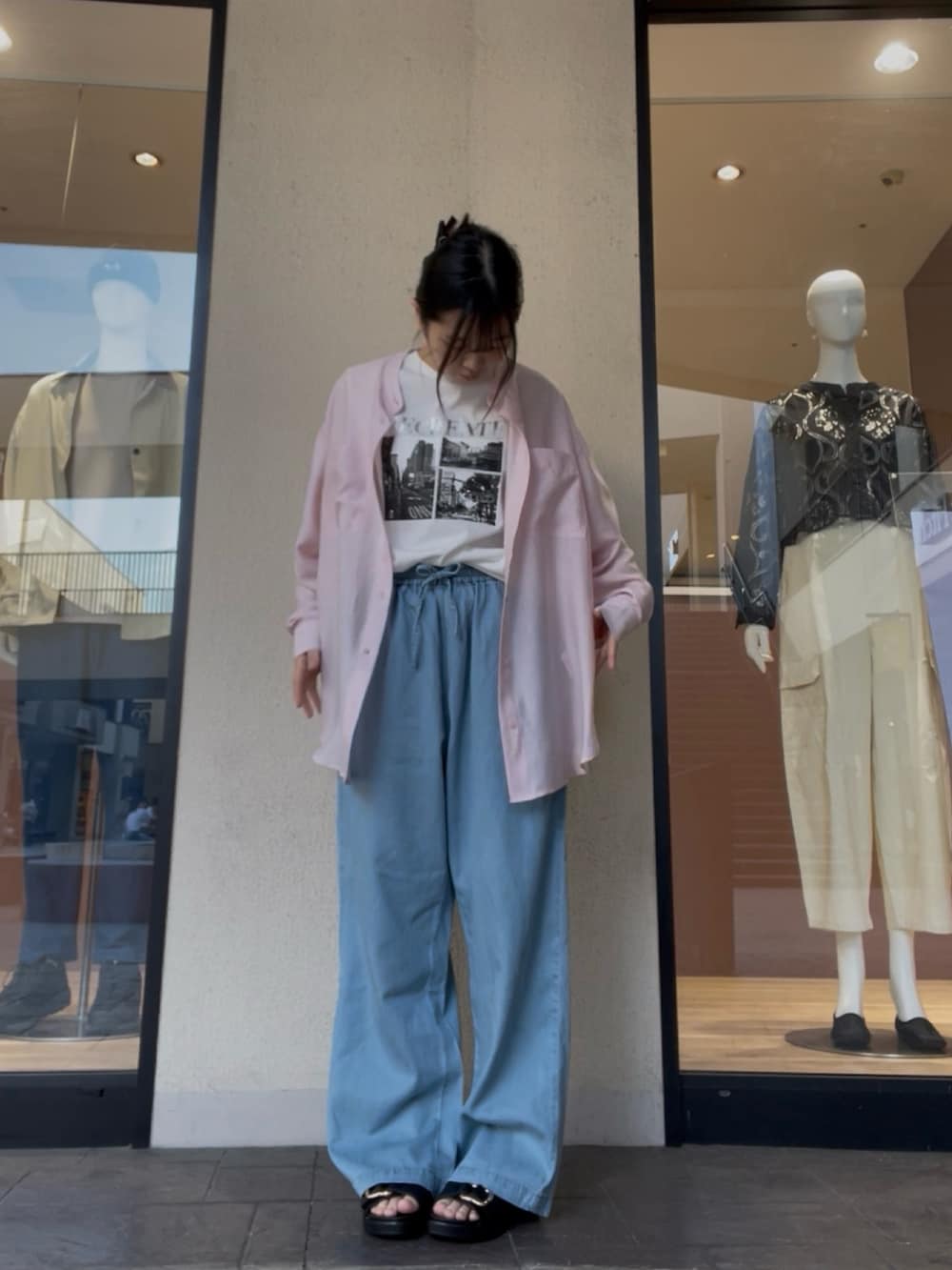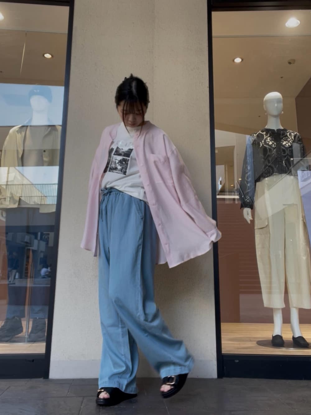 ゆるっとしたワイドパンツに、さらっと羽織ったピンクシャツで柔らかさをプラス。