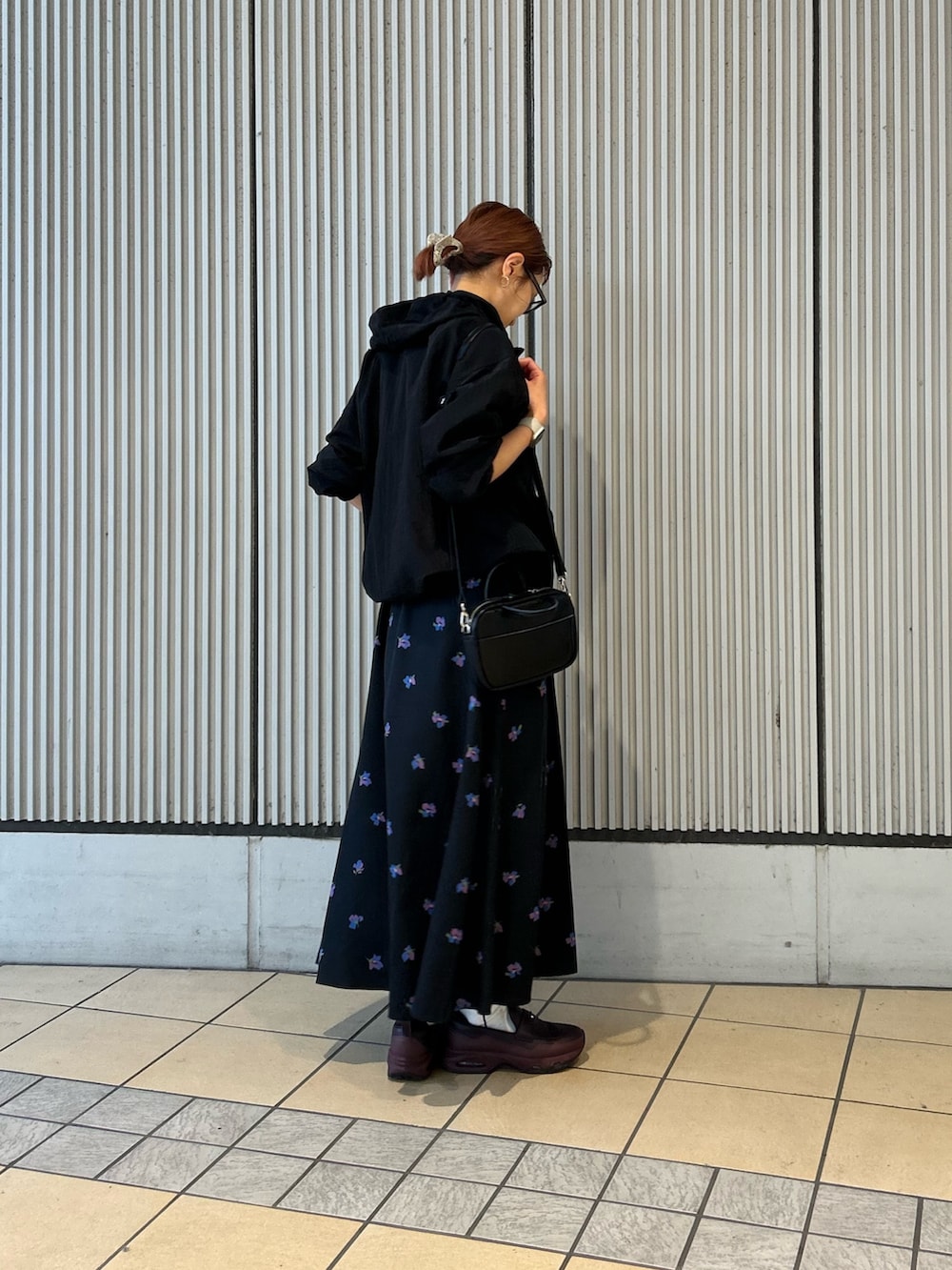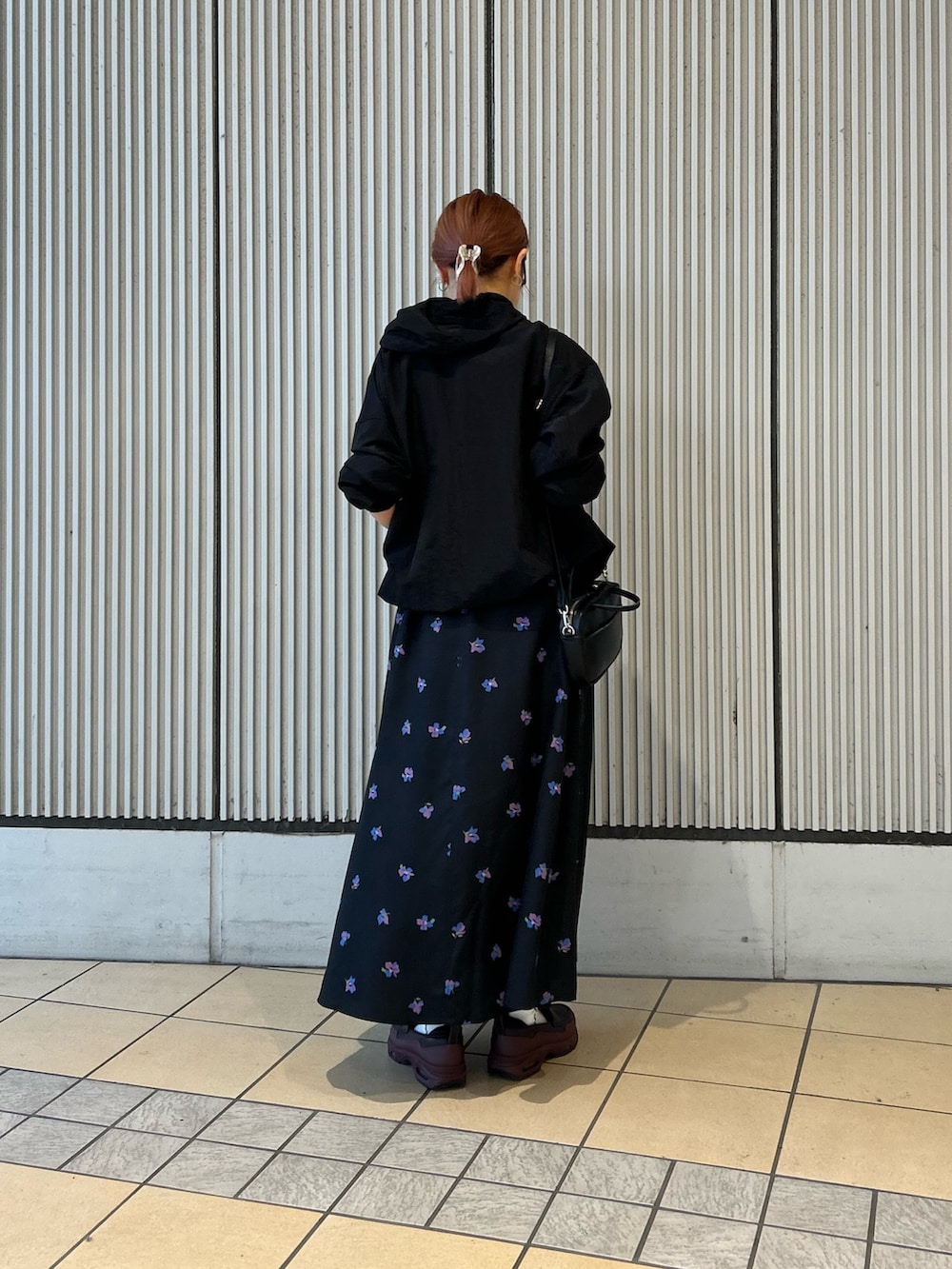 花柄ワンピにアノラックパーカーを合わせたカジュアルコーデです。