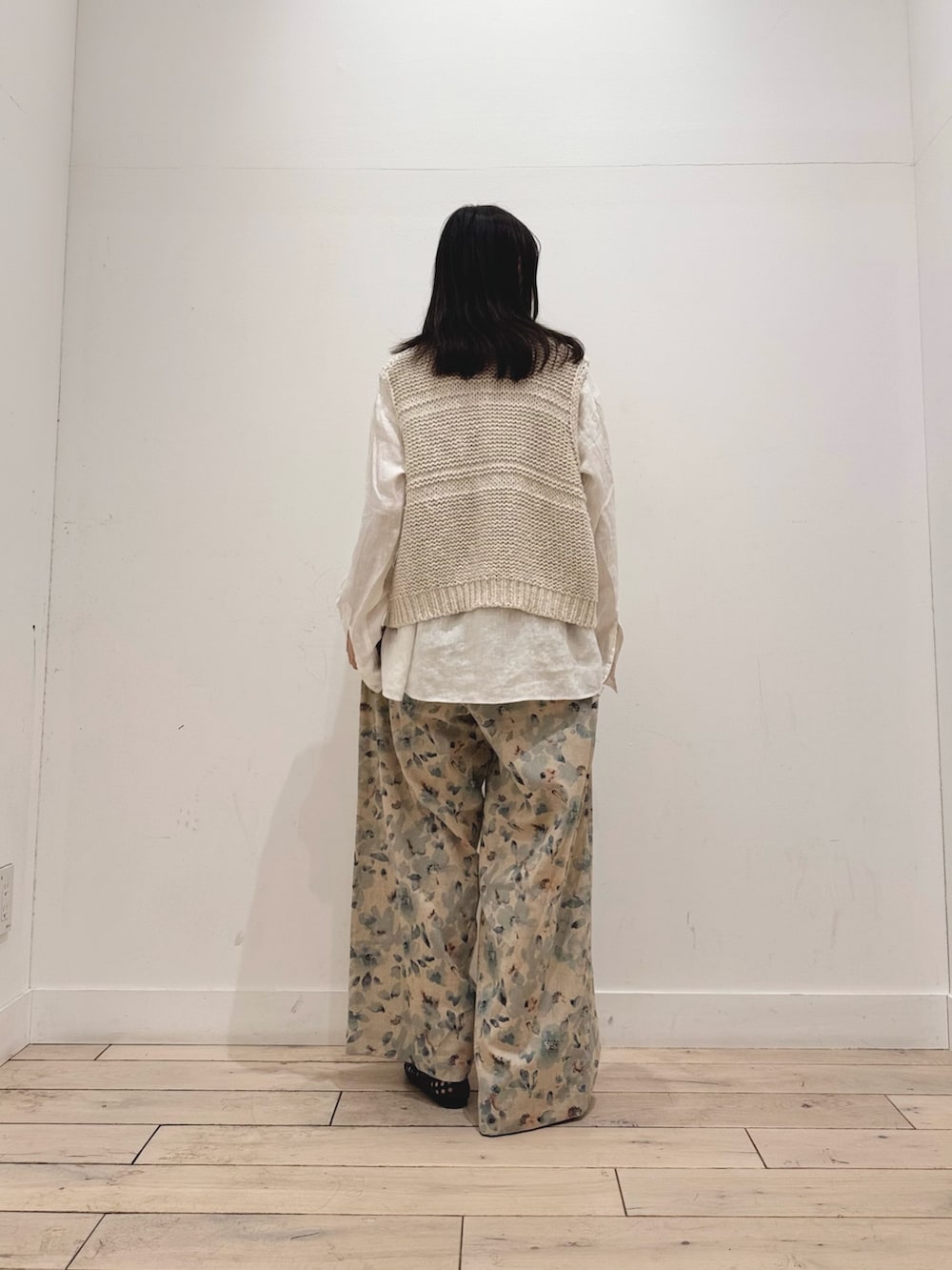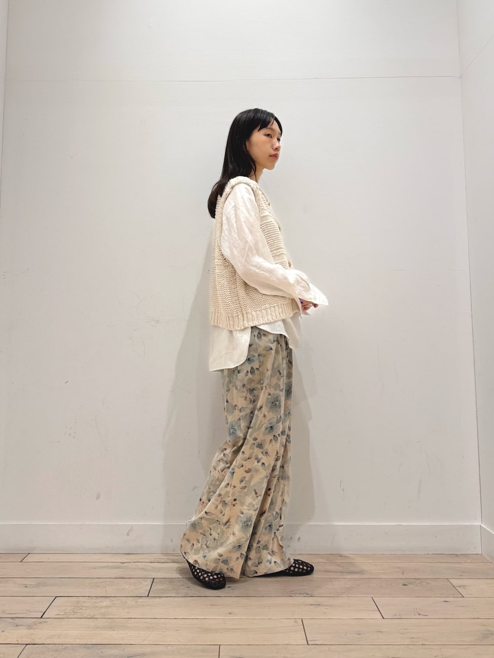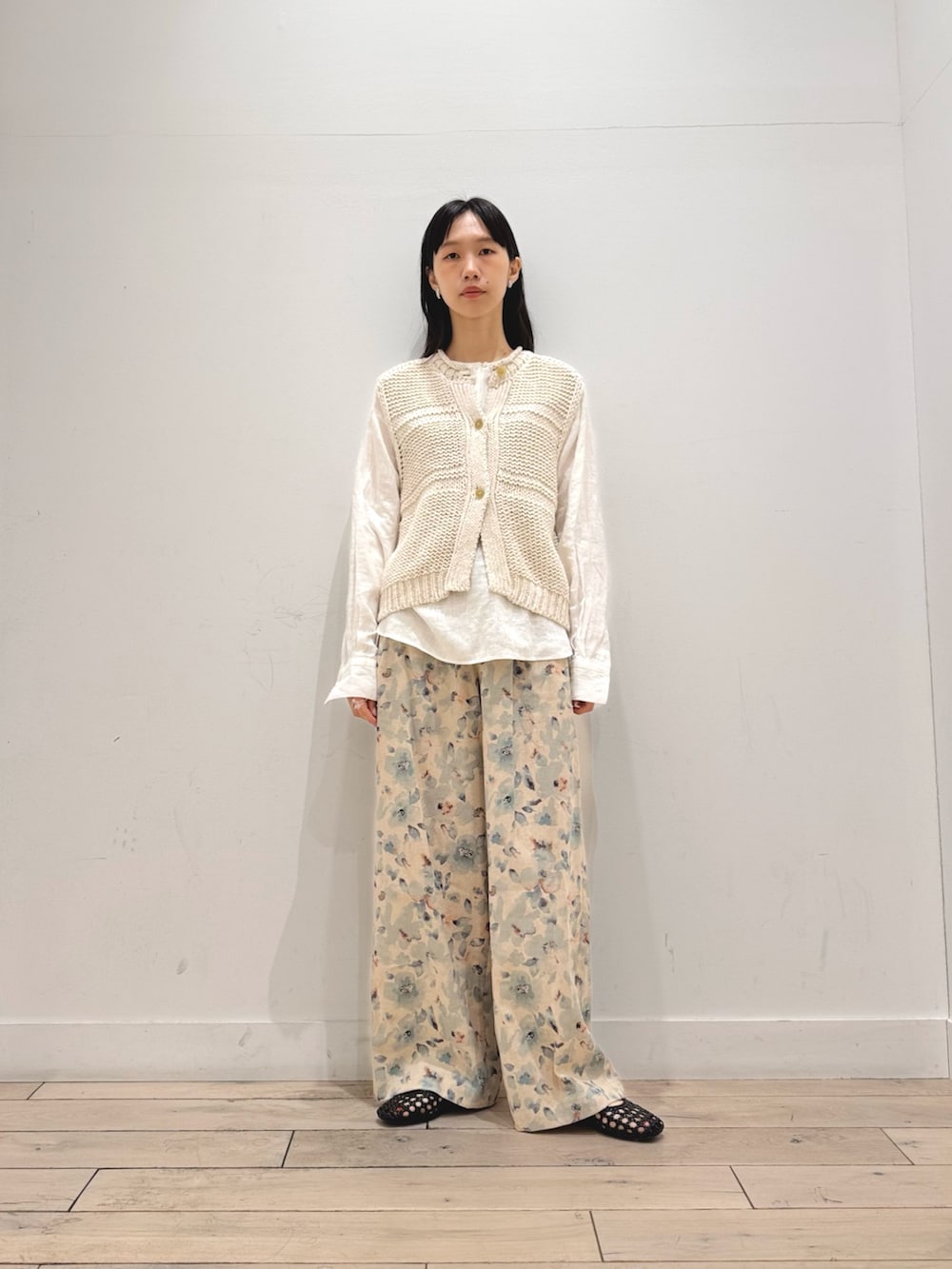 リネンシャツとリネンパンツで組み合わせ、ニットベストで異素材感も加えました☺️