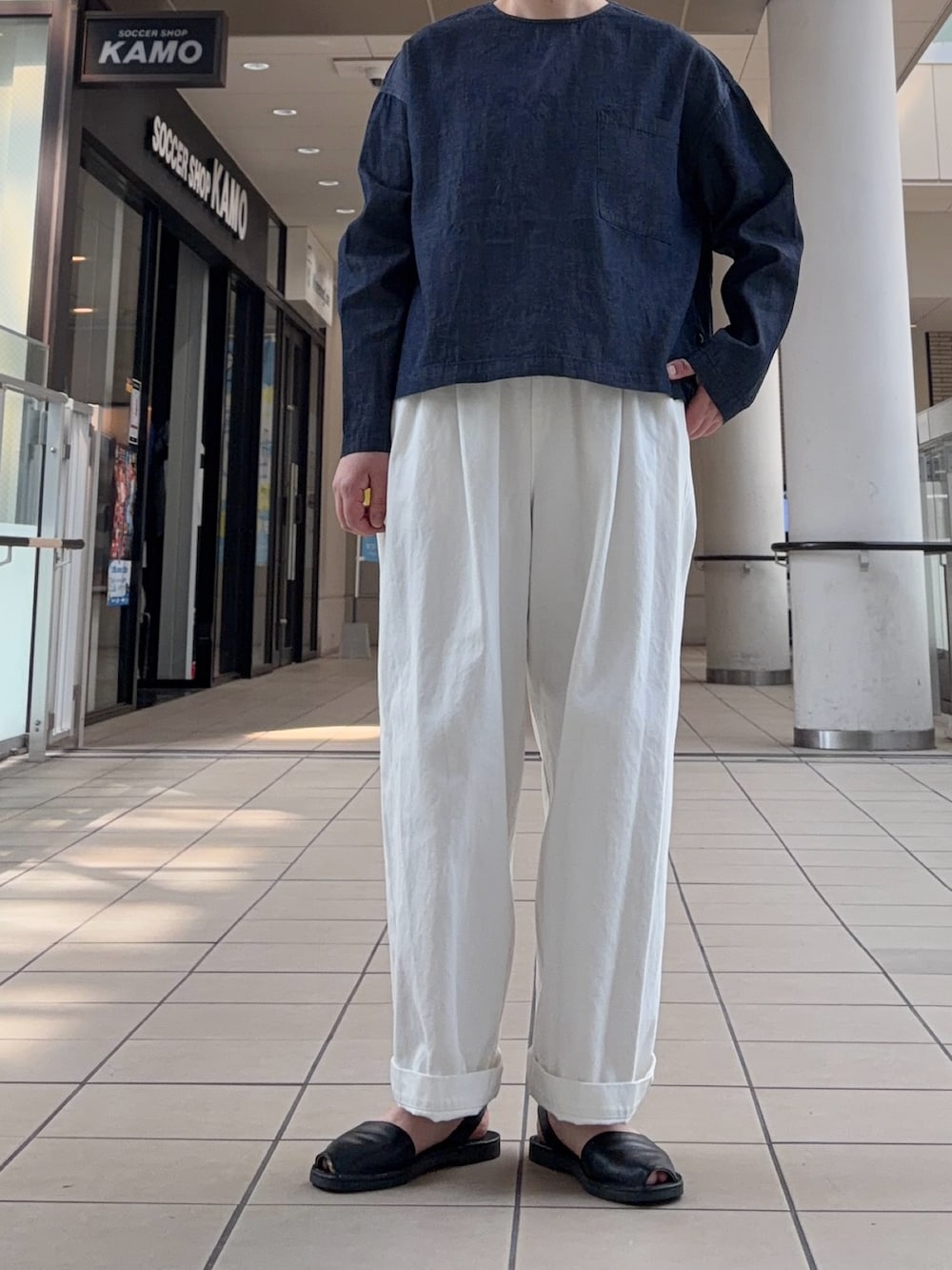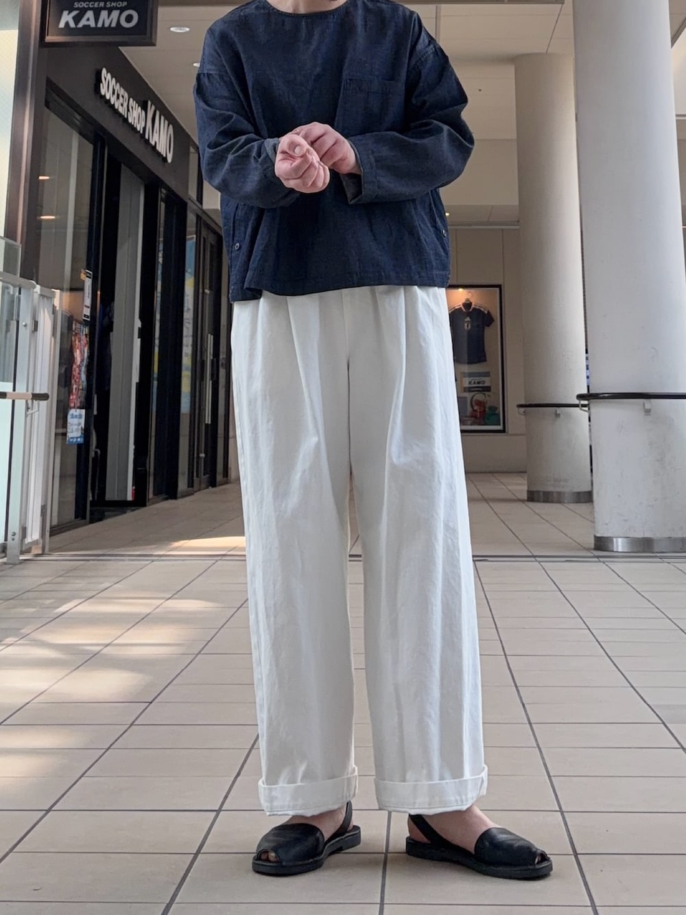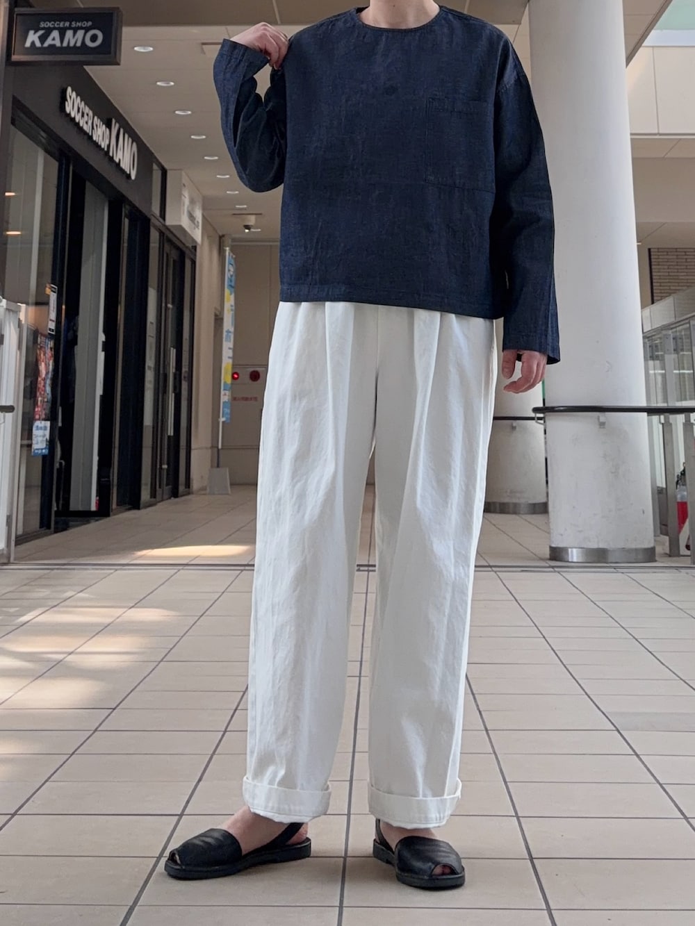 カジュアルになりすぎないINDIGOカラーは、様々なボトムと相性が良いです。今回は白のボトムで爽やかな春のお出かけスタイルです。