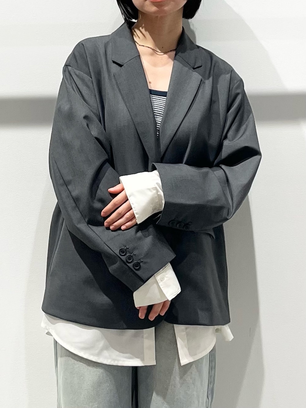 レイヤードになっており、1枚で映えるジャケットです。少しメンズライクな印象です。