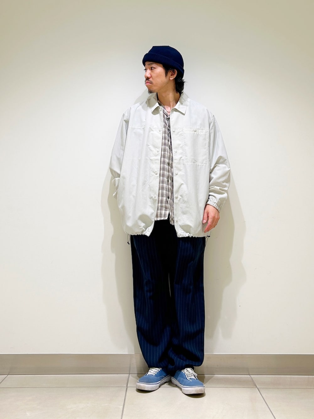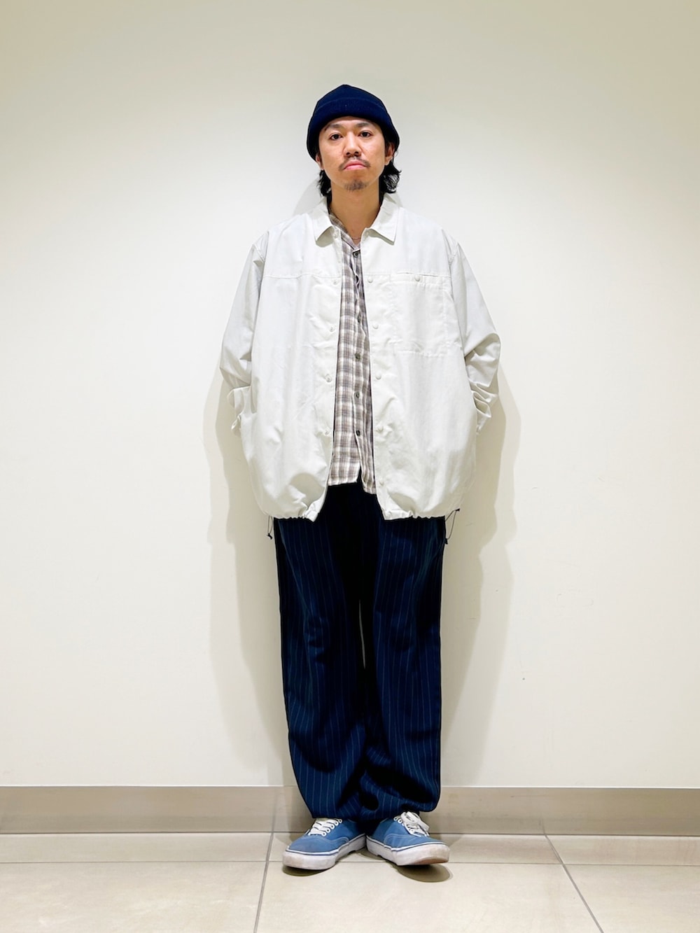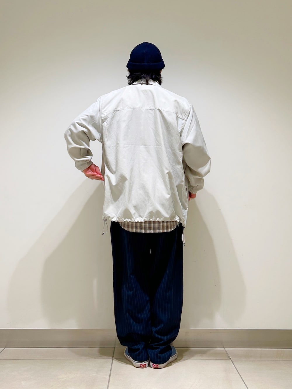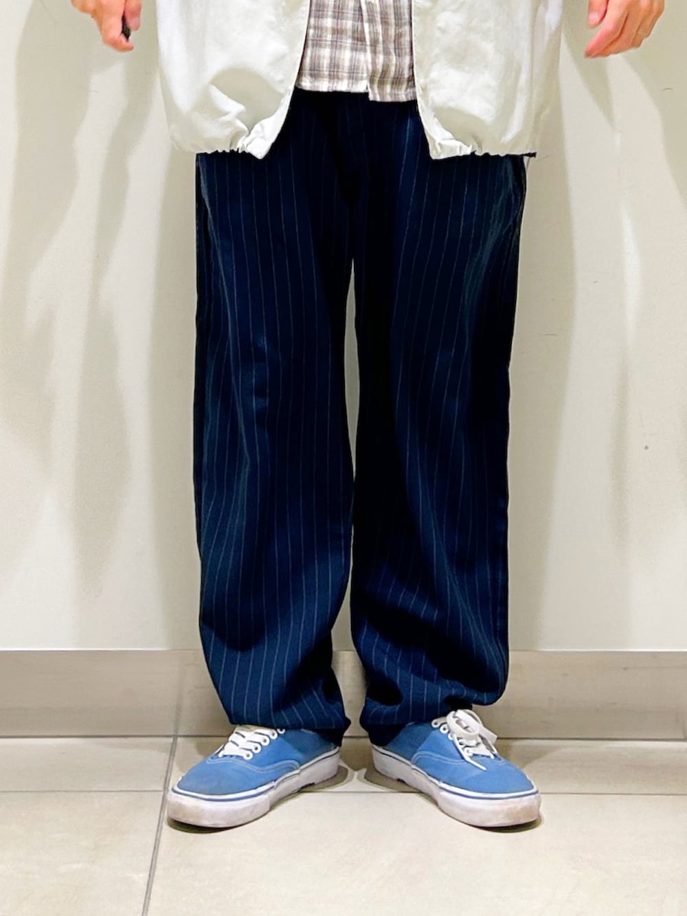 ボトムはストライプトラウザーを合わせ、大人なアメカジスタイルを意識しました。