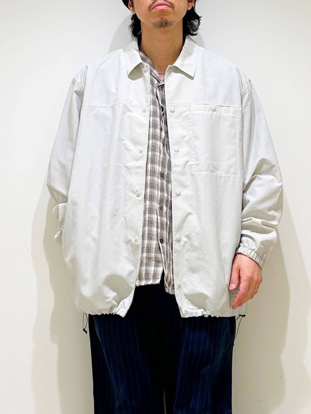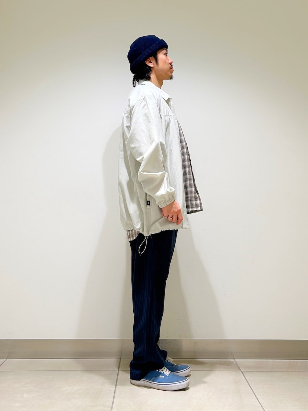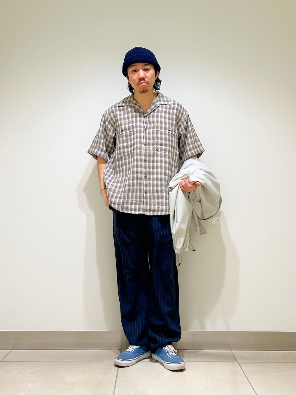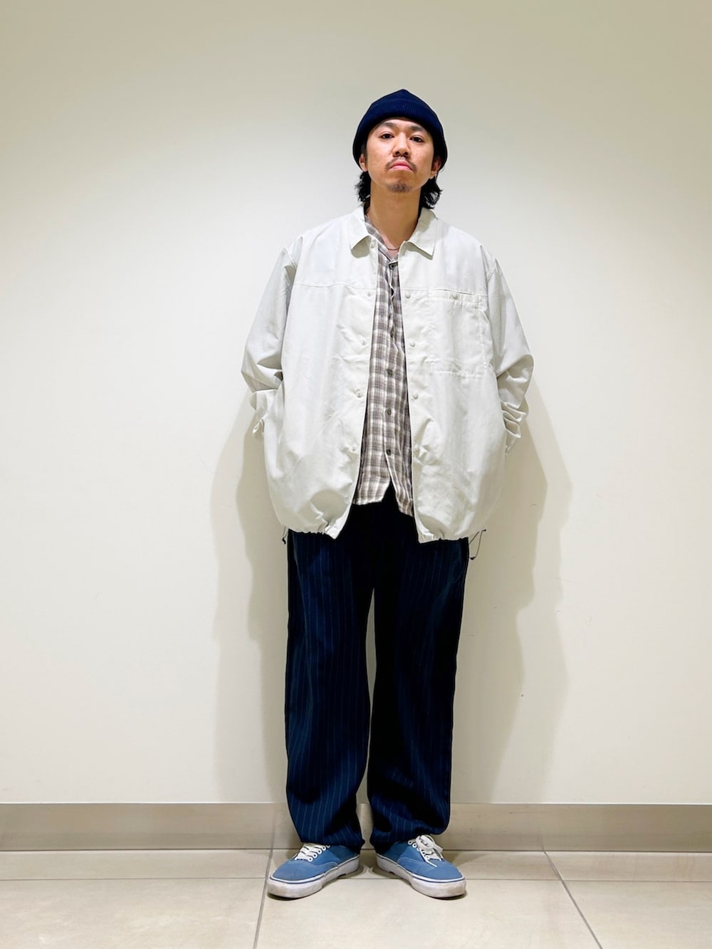 ボトムはストライプトラウザーを合わせ、大人なアメカジスタイルを意識しました。