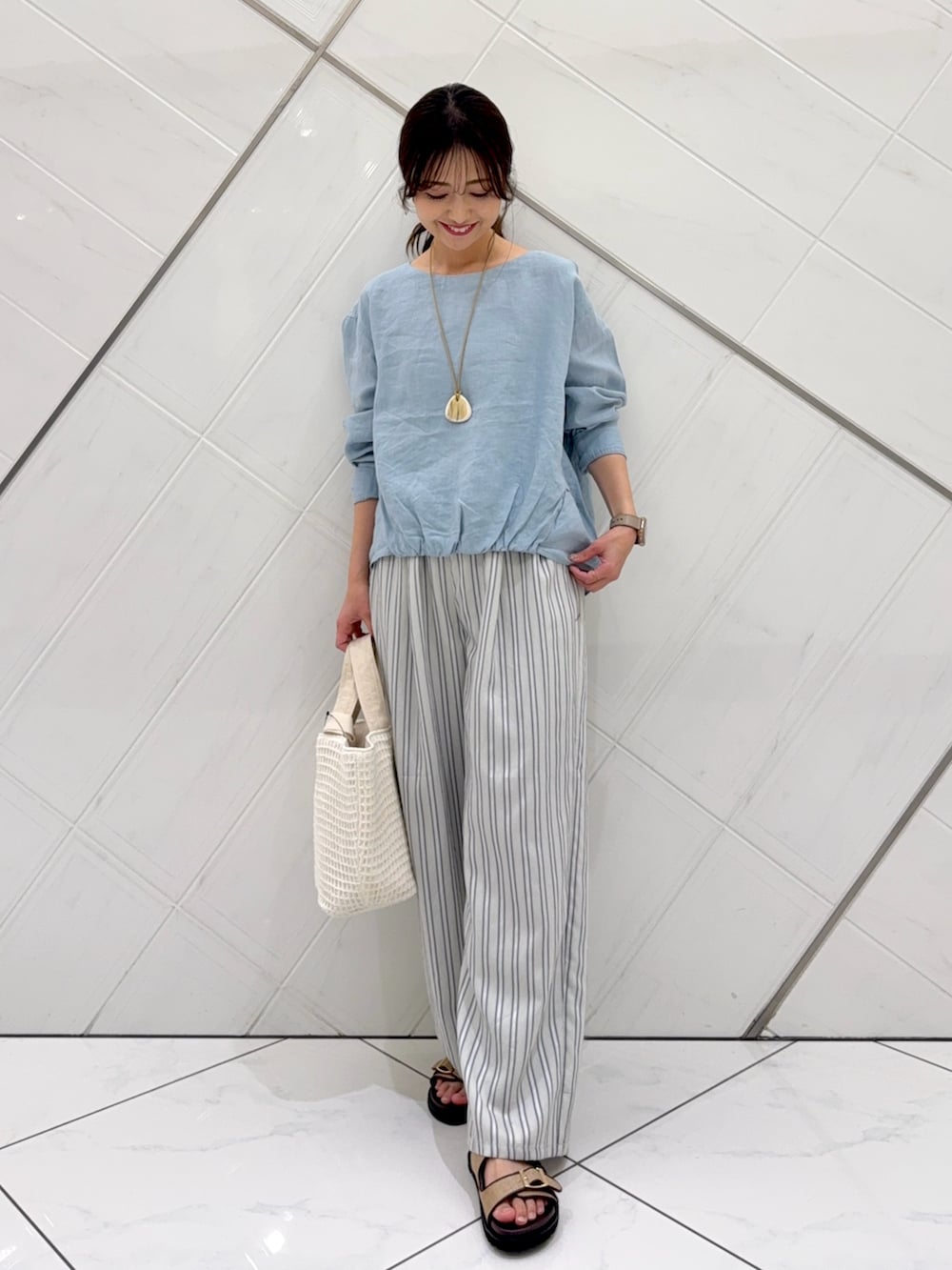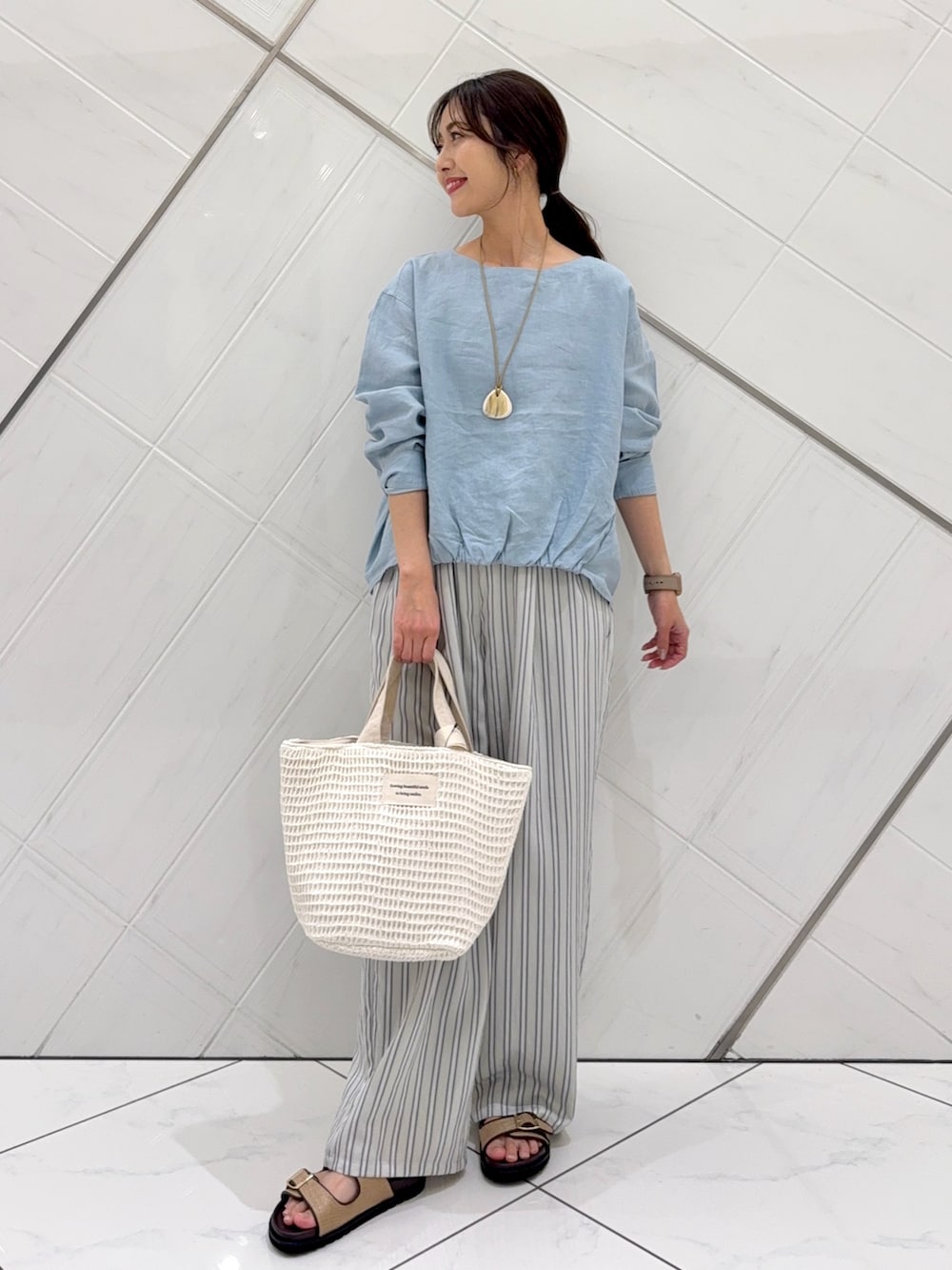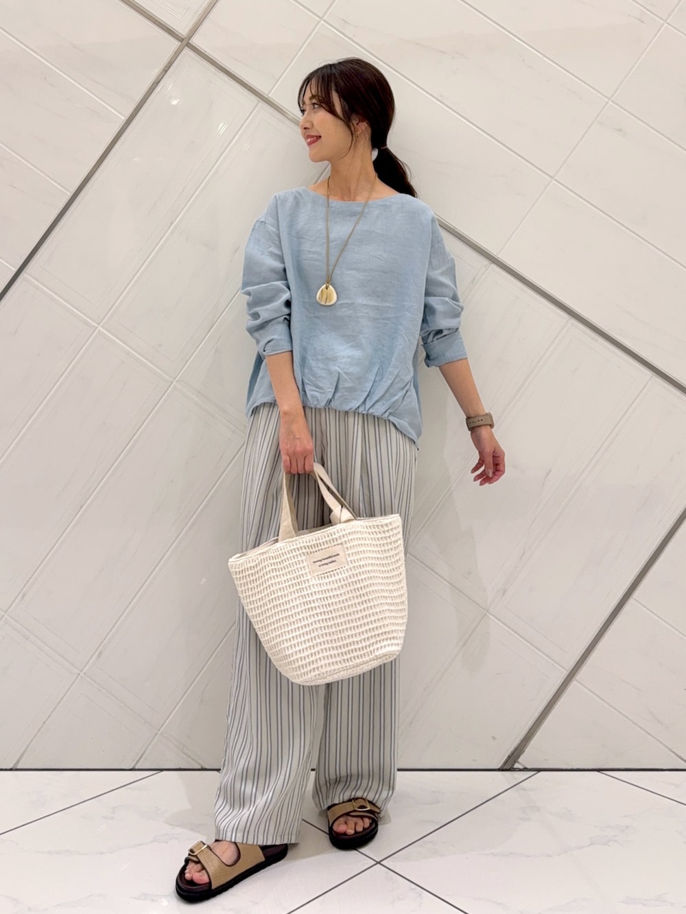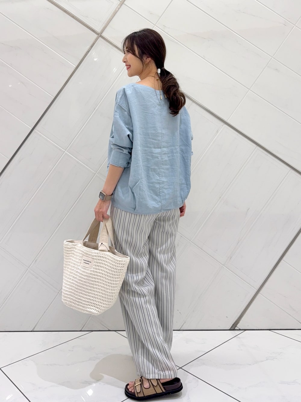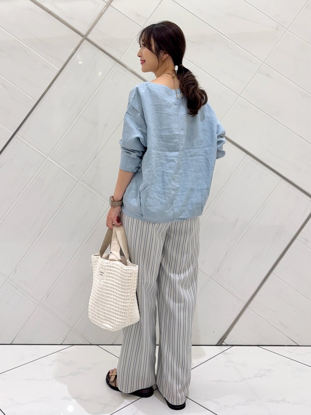 トップスは柔らかな肌触りのリネン素材で着心地も良く、合わせるボトムスも選ばないので着回しの効くアイテムです。