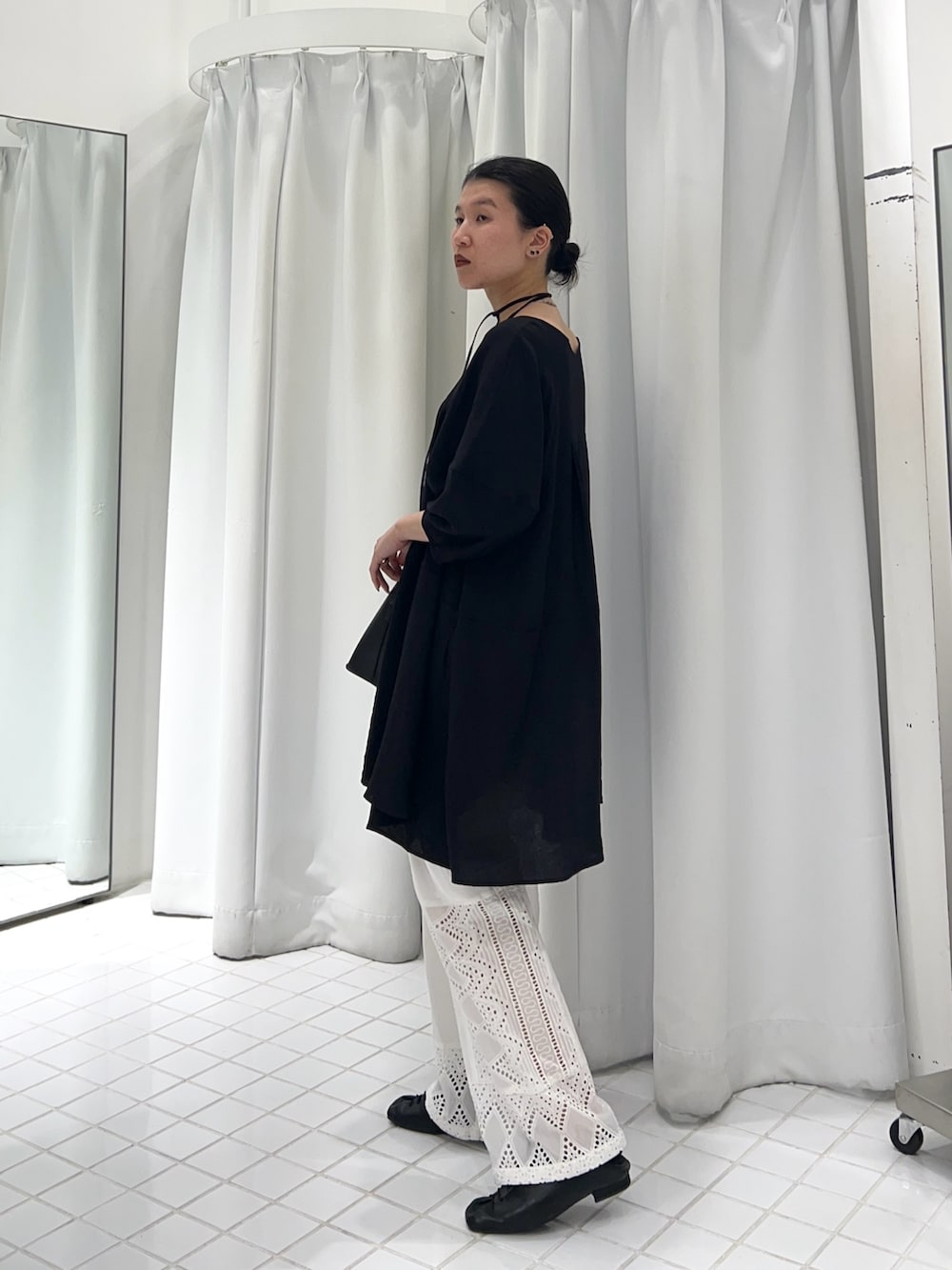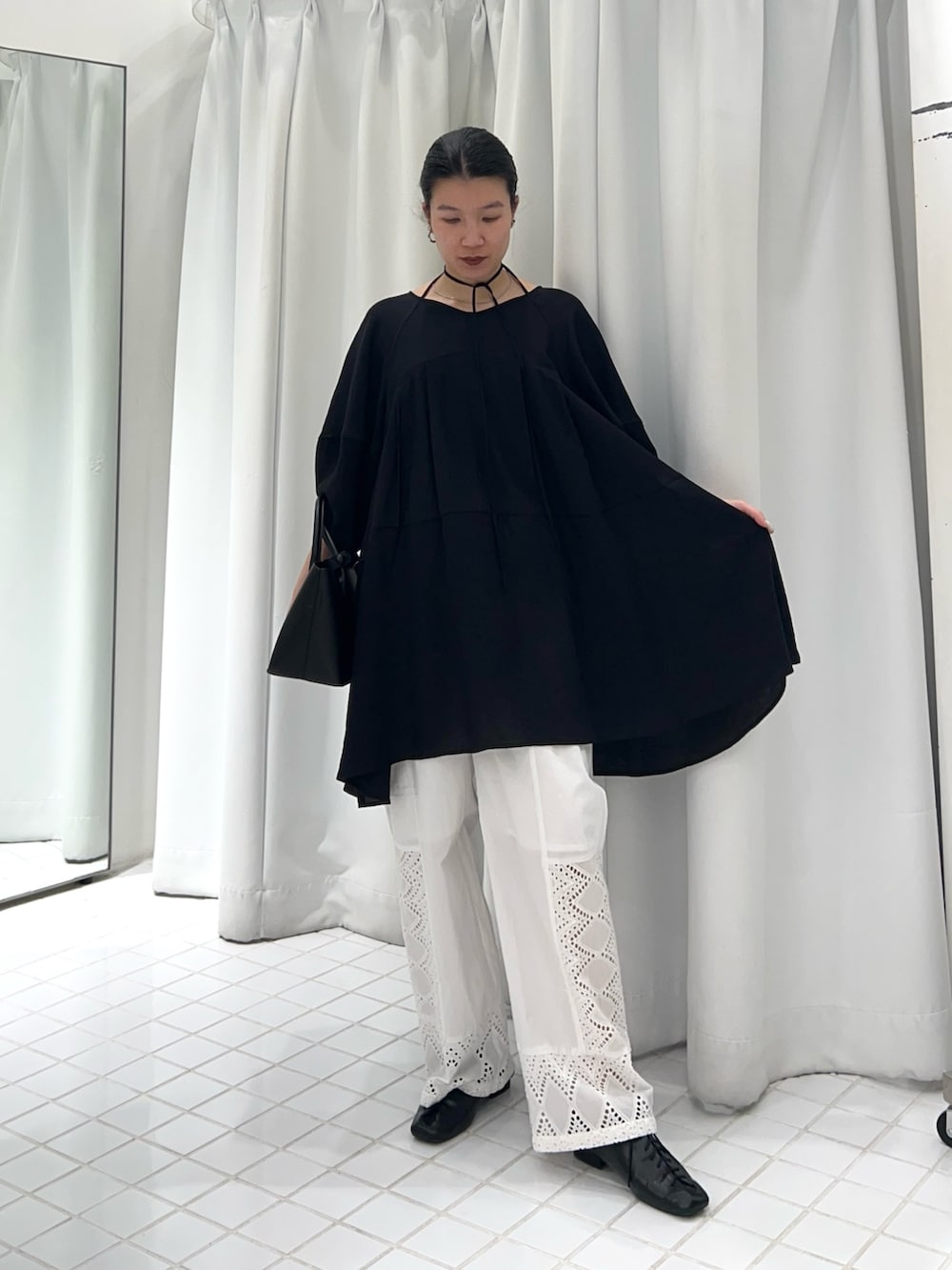 合わせたパンツは裾だけレースなので、透け感が苦手な方も挑戦しやすくワイドすぎないスッキリ目のシルエットなので、小柄な方もダボっとしすぎないところがオススメです◎