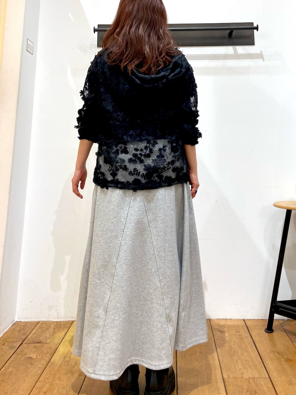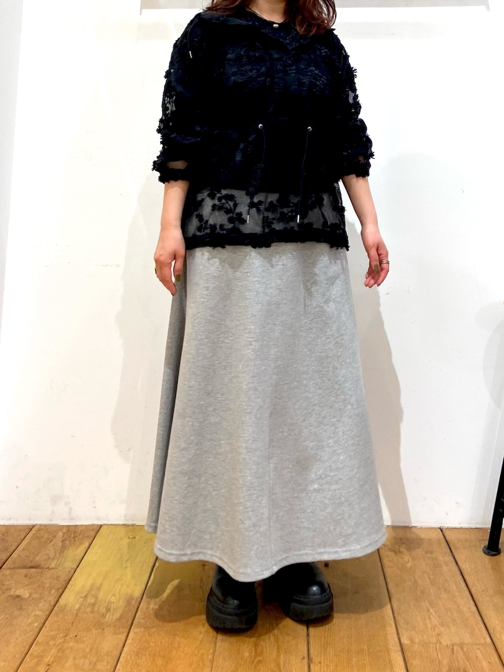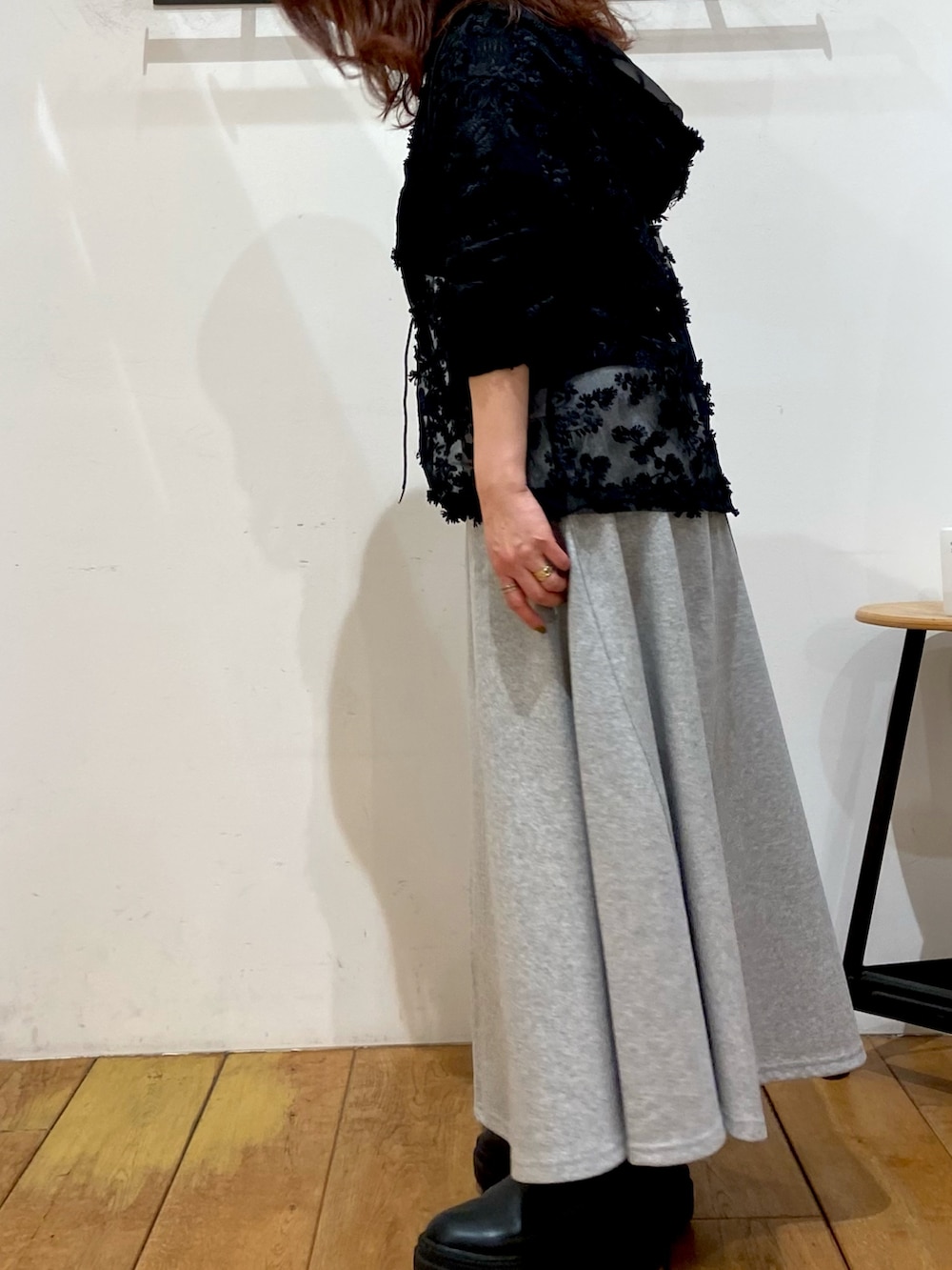 レースで透け感のあるトップスにスカートを合わせた大人ガーリーコーデです