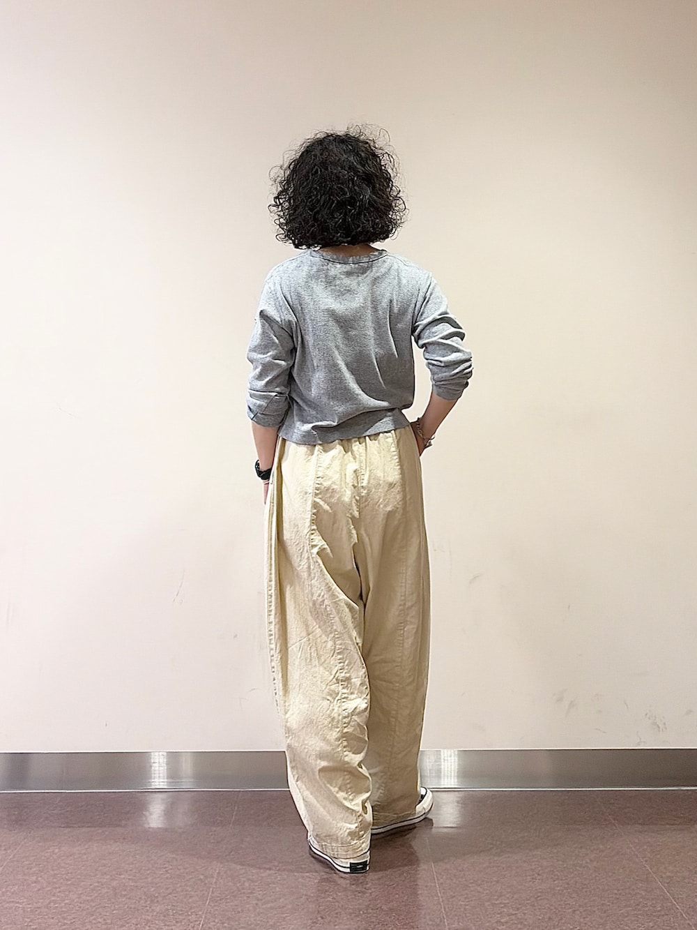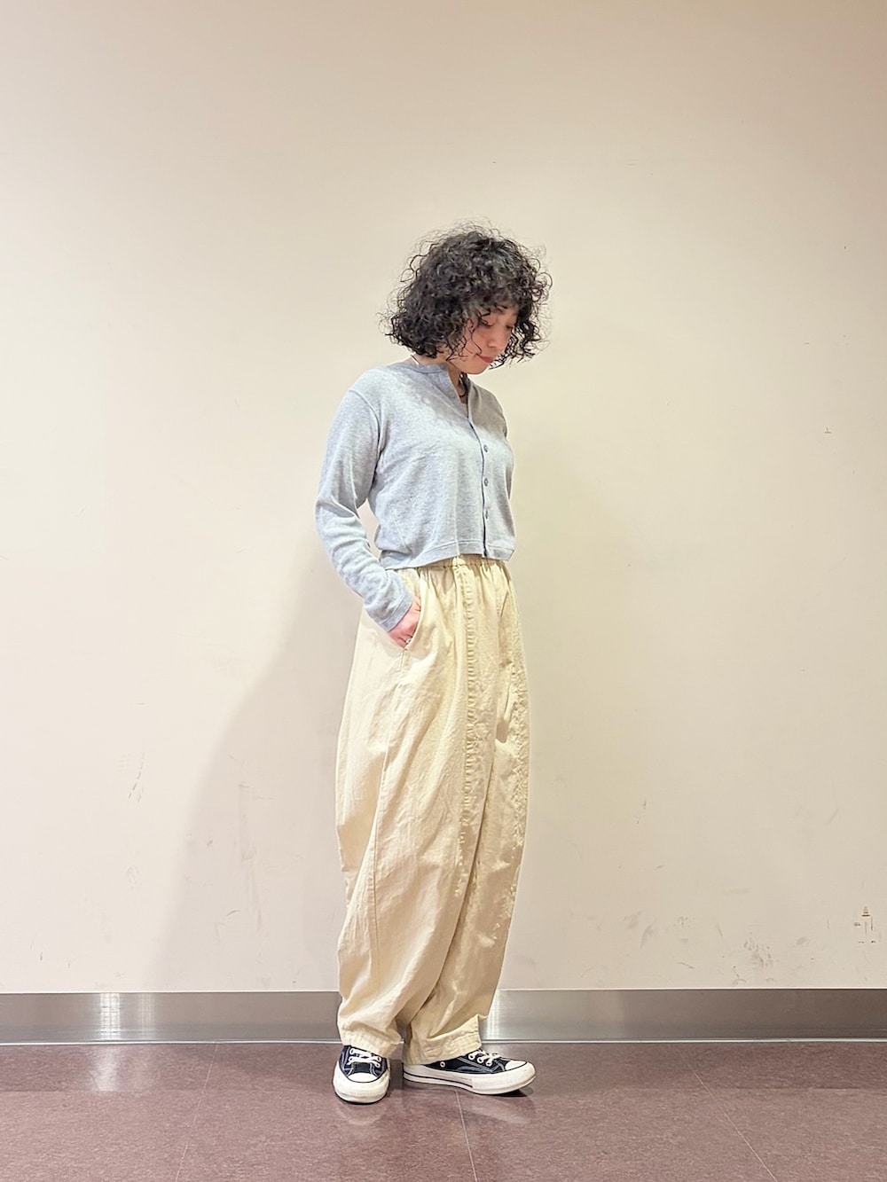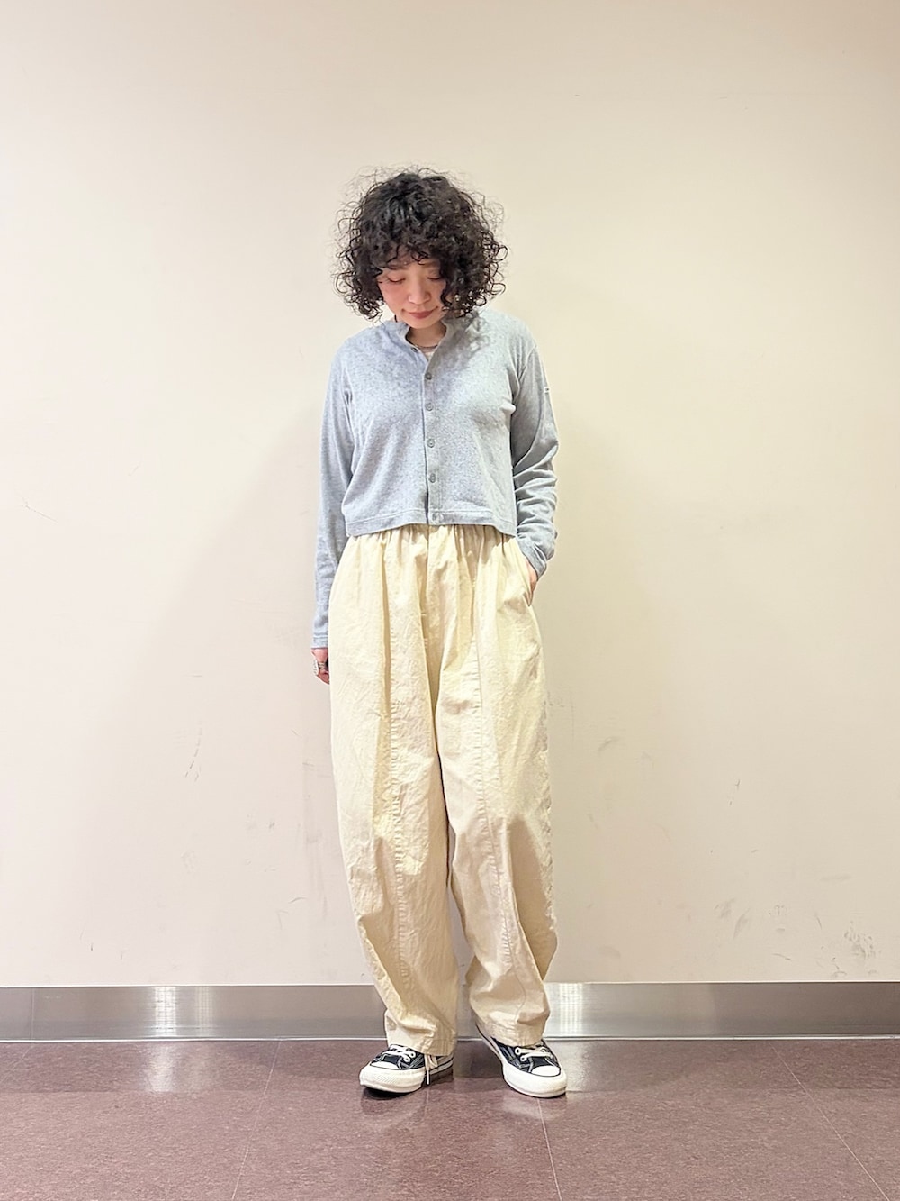 そこに、ザラっとしたかぐれの綿麻のボリュームパンツを合わせ、生地感とバランスでコーデにメリハリを