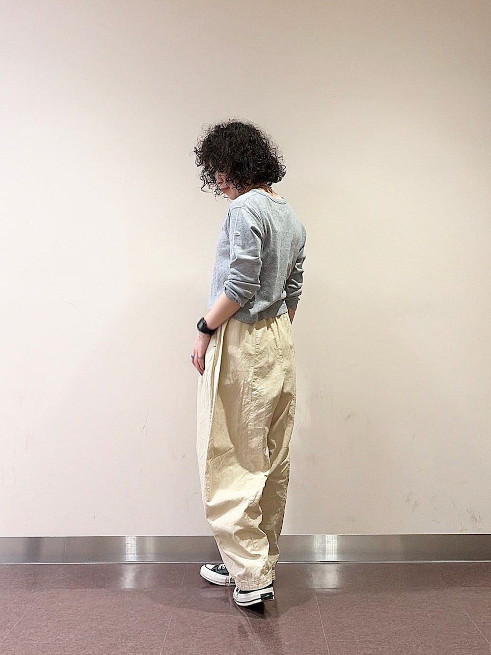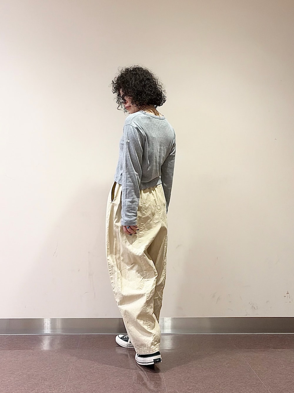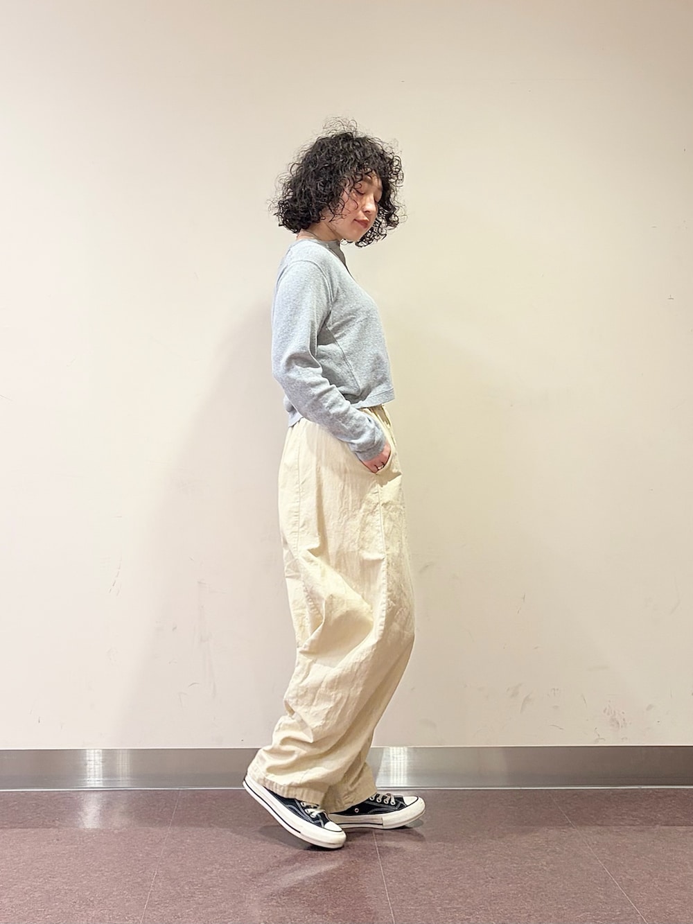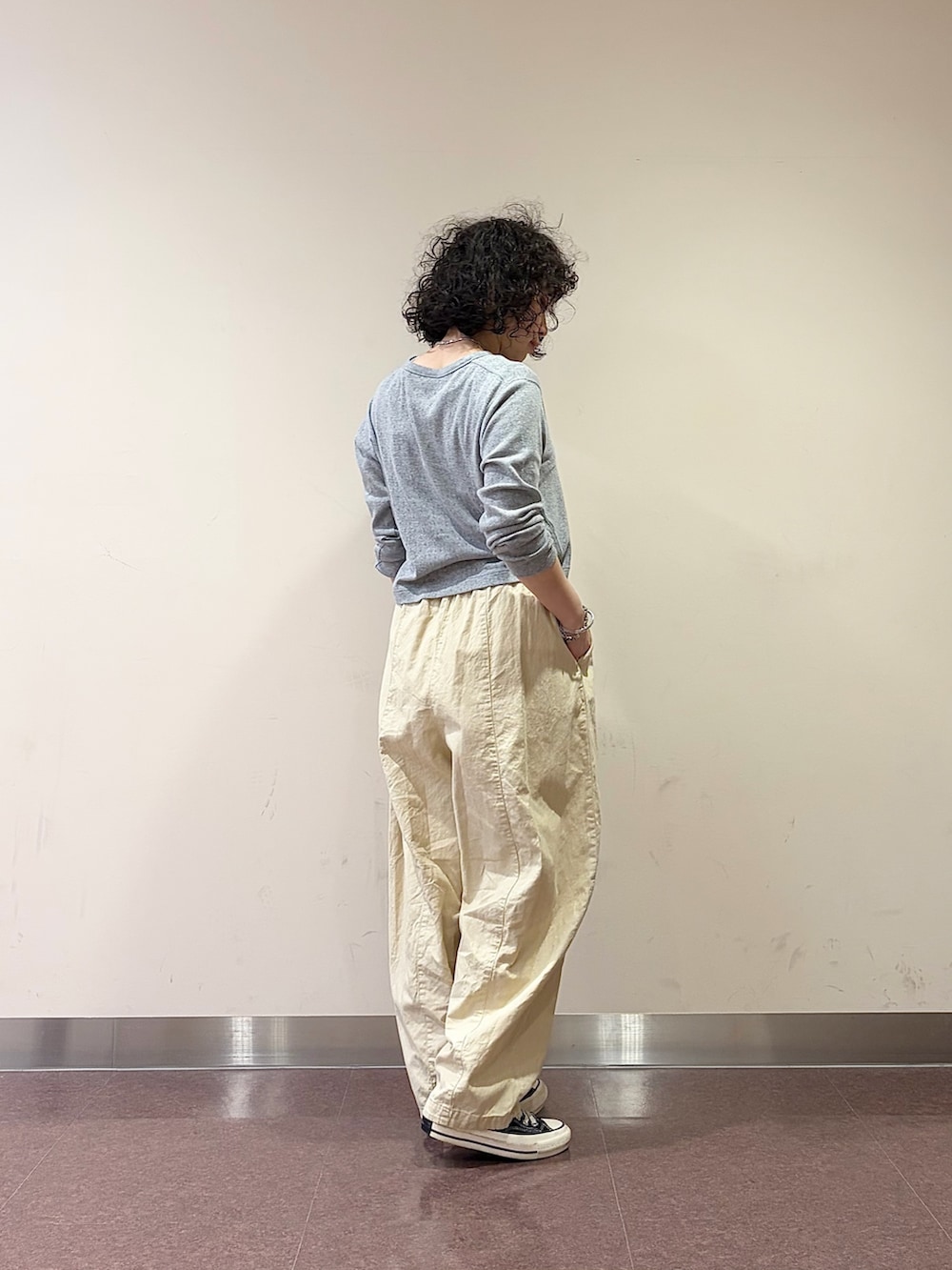 そこに、ザラっとしたかぐれの綿麻のボリュームパンツを合わせ、生地感とバランスでコーデにメリハリを