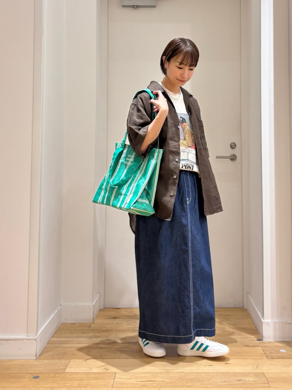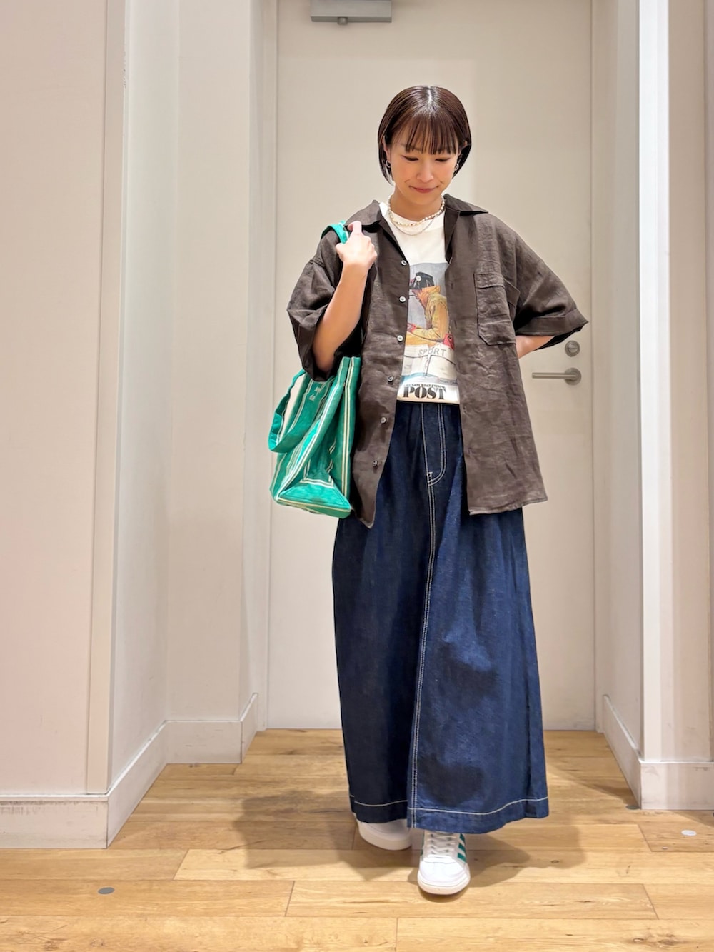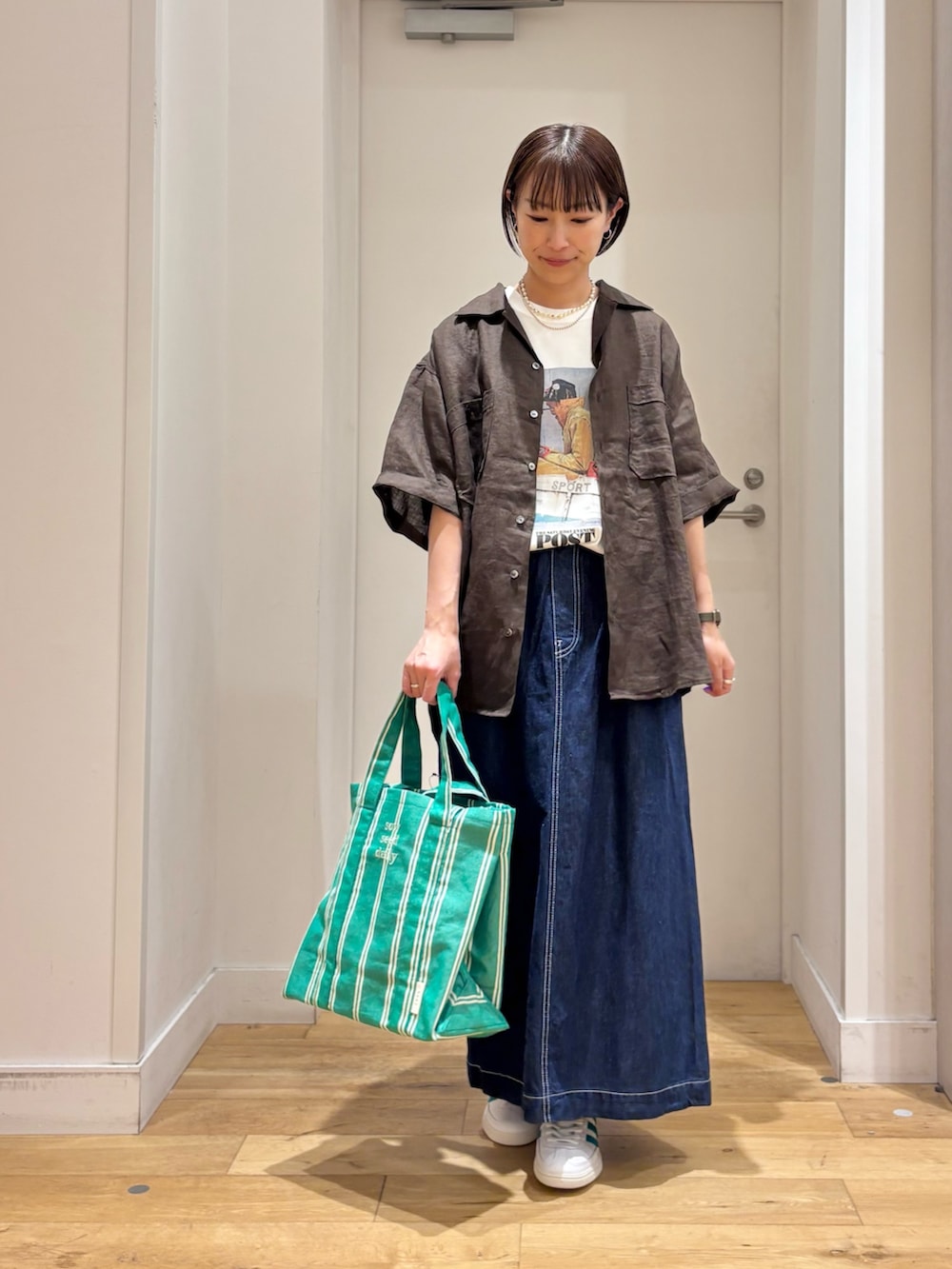今回は、メンズアイテムをプリントTシャツに羽織る形で着用してみました。