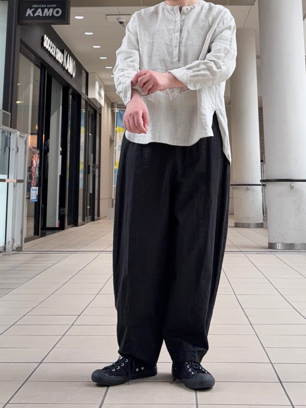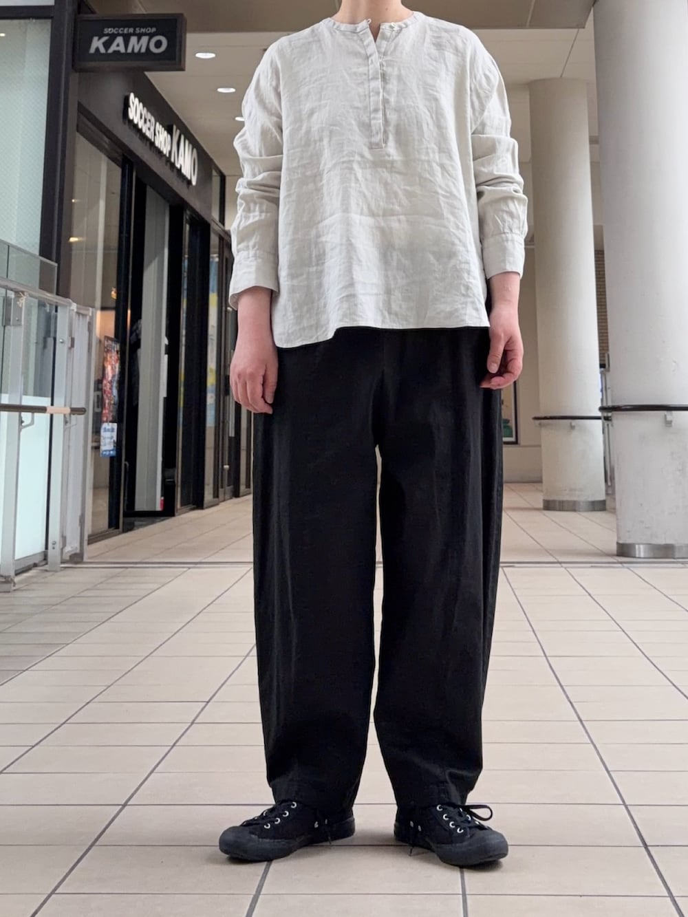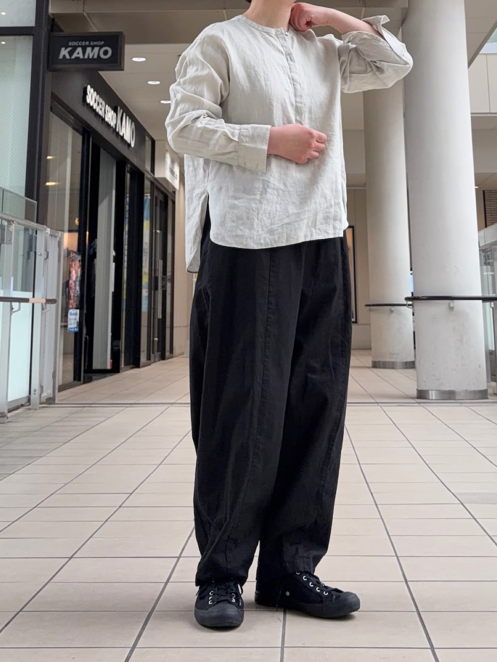 今回はボリュームパンツと合わせてシンプルカジュアルに。パンツは程よいまるみのあるシルエットがかわいいです。