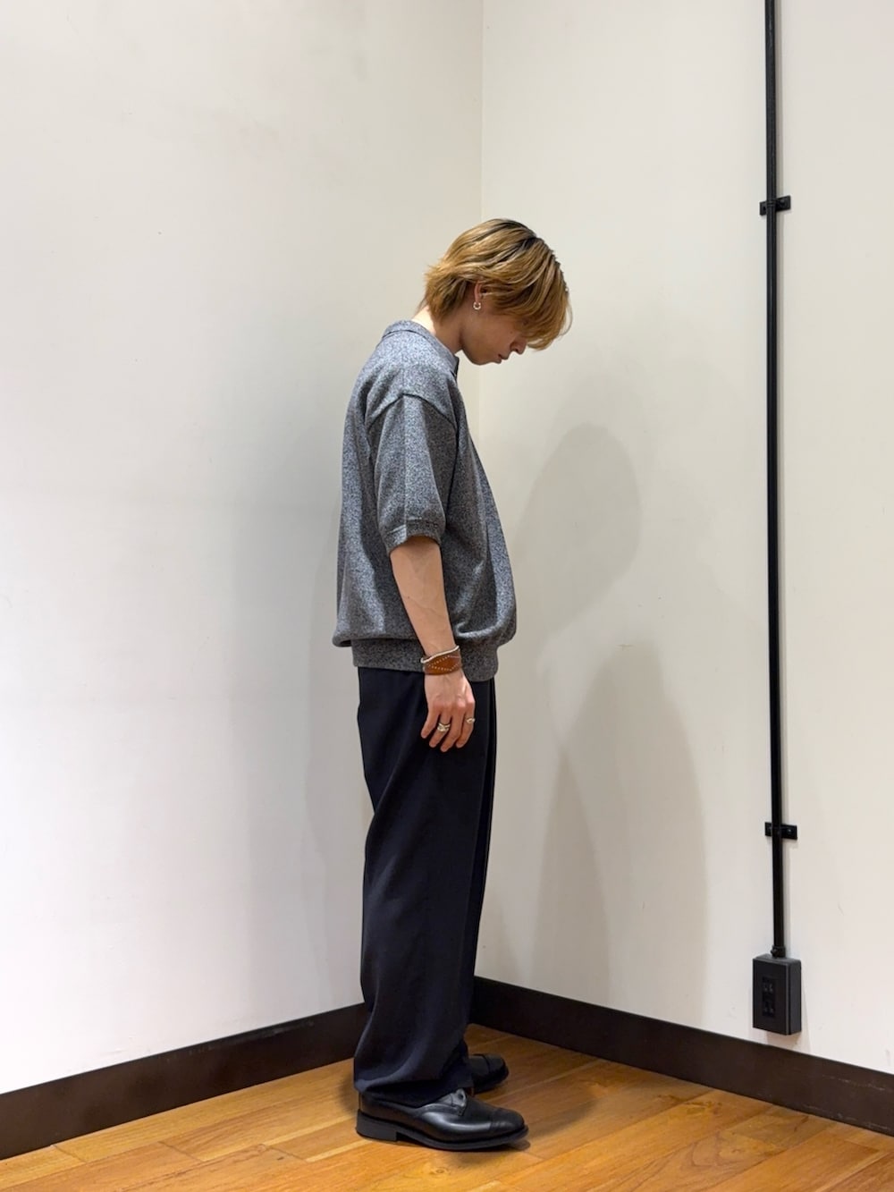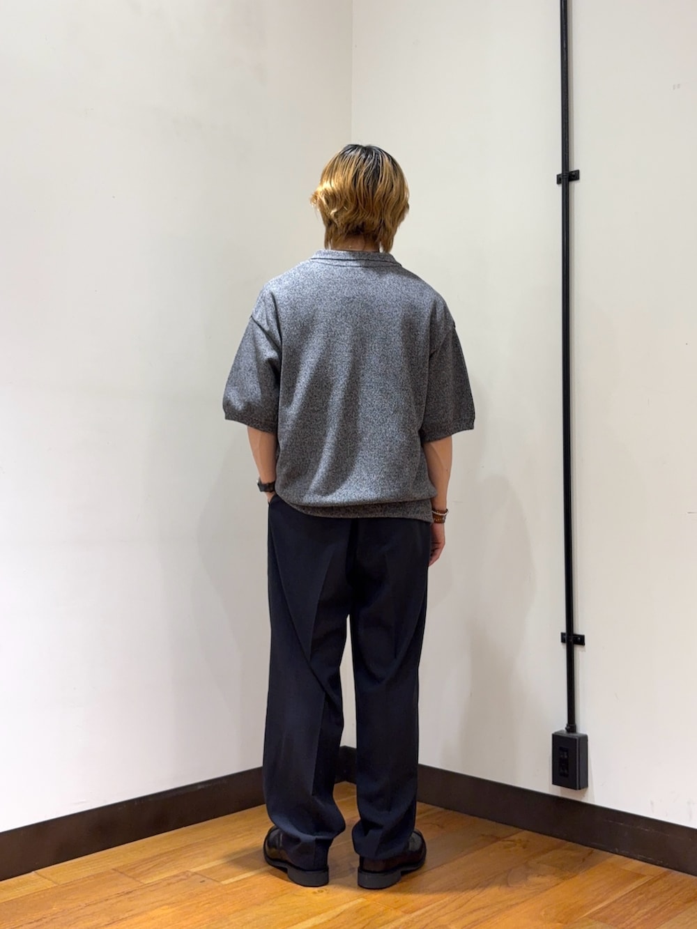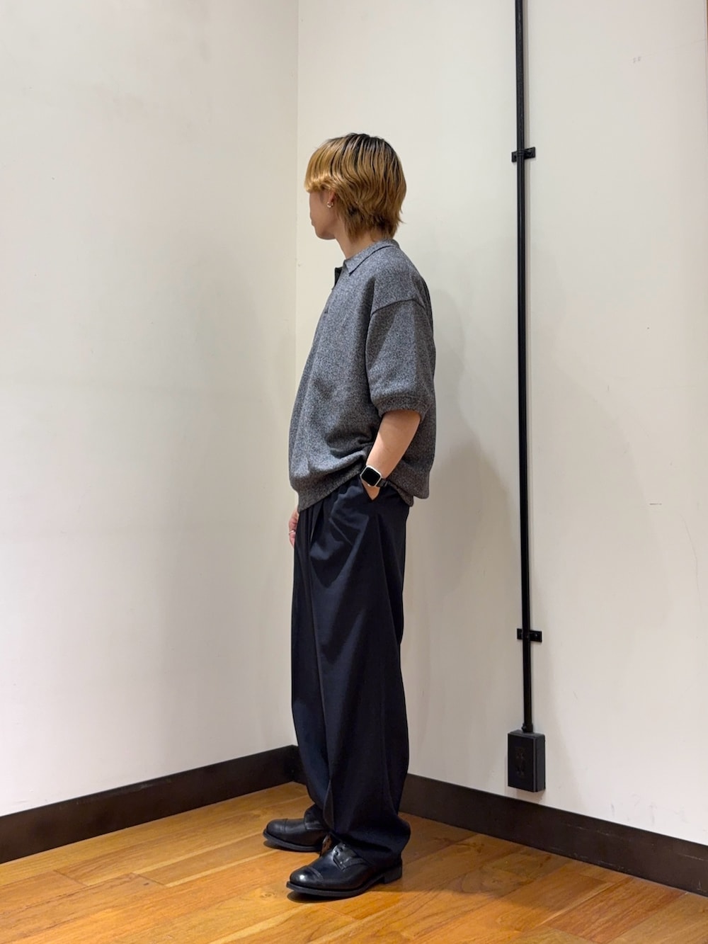 ニットポロはコットン×ラミーの軽やかな素材感で春の一枚着にちょうど良いです。ゆったりとしたトップスシルエットで肩まわりに余裕があり、今回のコーデのようなスラックスでキレイめなコーデでも、デニムやチノに合わせたカジュアルスタイルでも決まります。