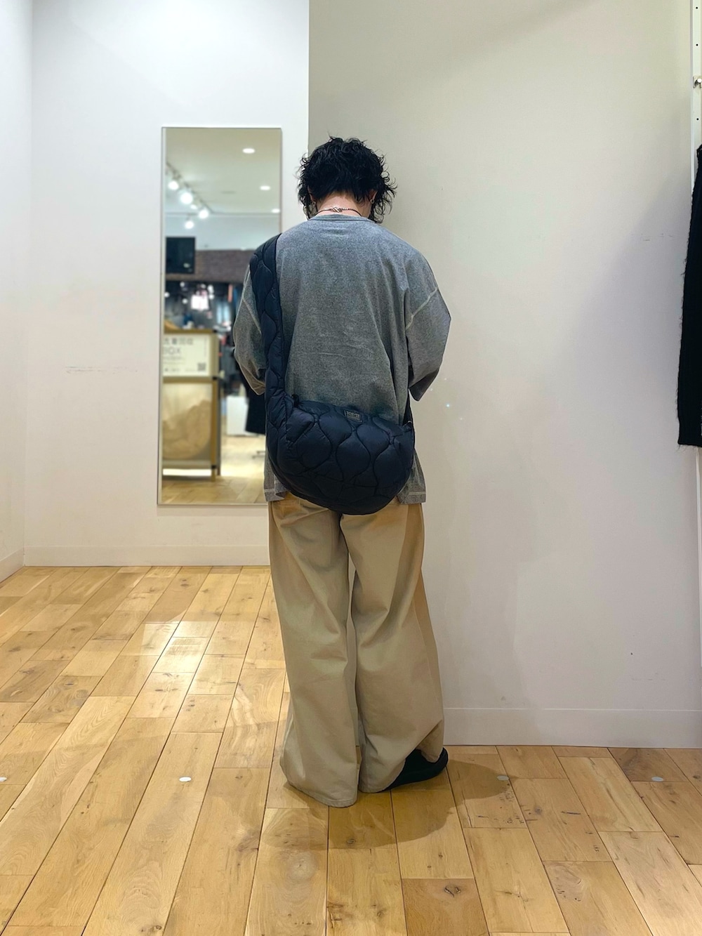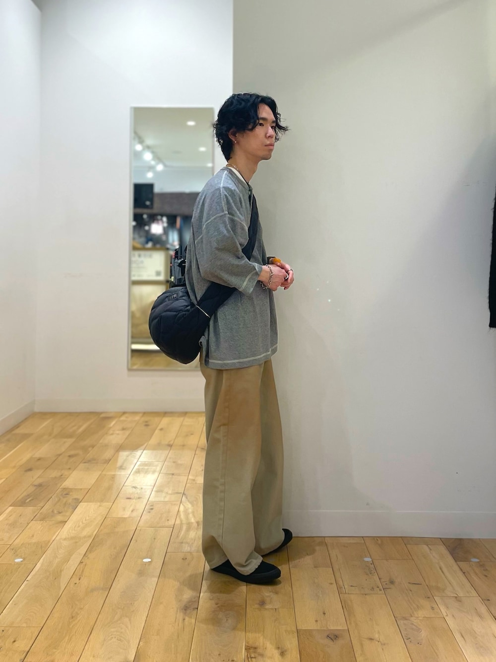 サイズ感かなり大きめなヘンリーネックなので、パンツも太めに。ショルダーバッグもボリューム感のあるものを。