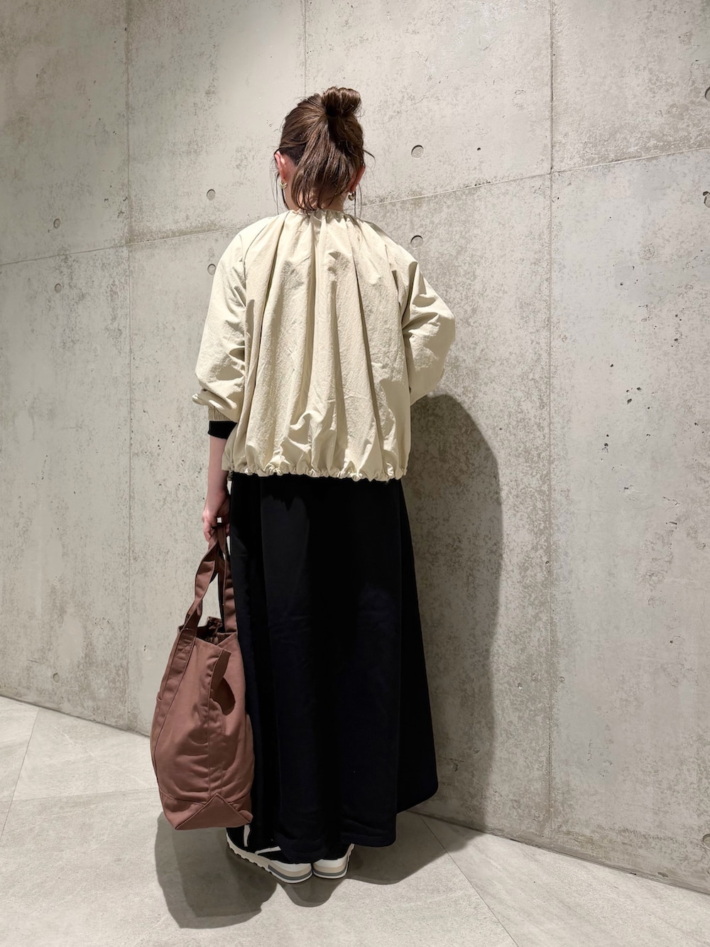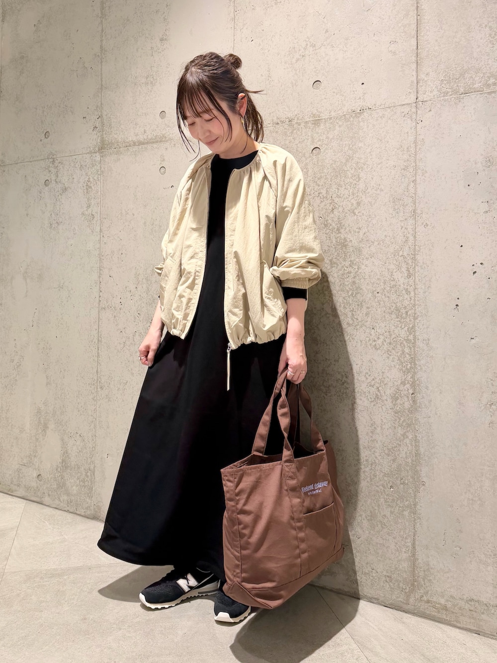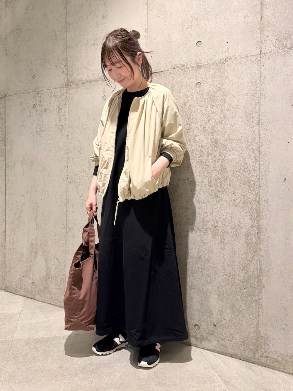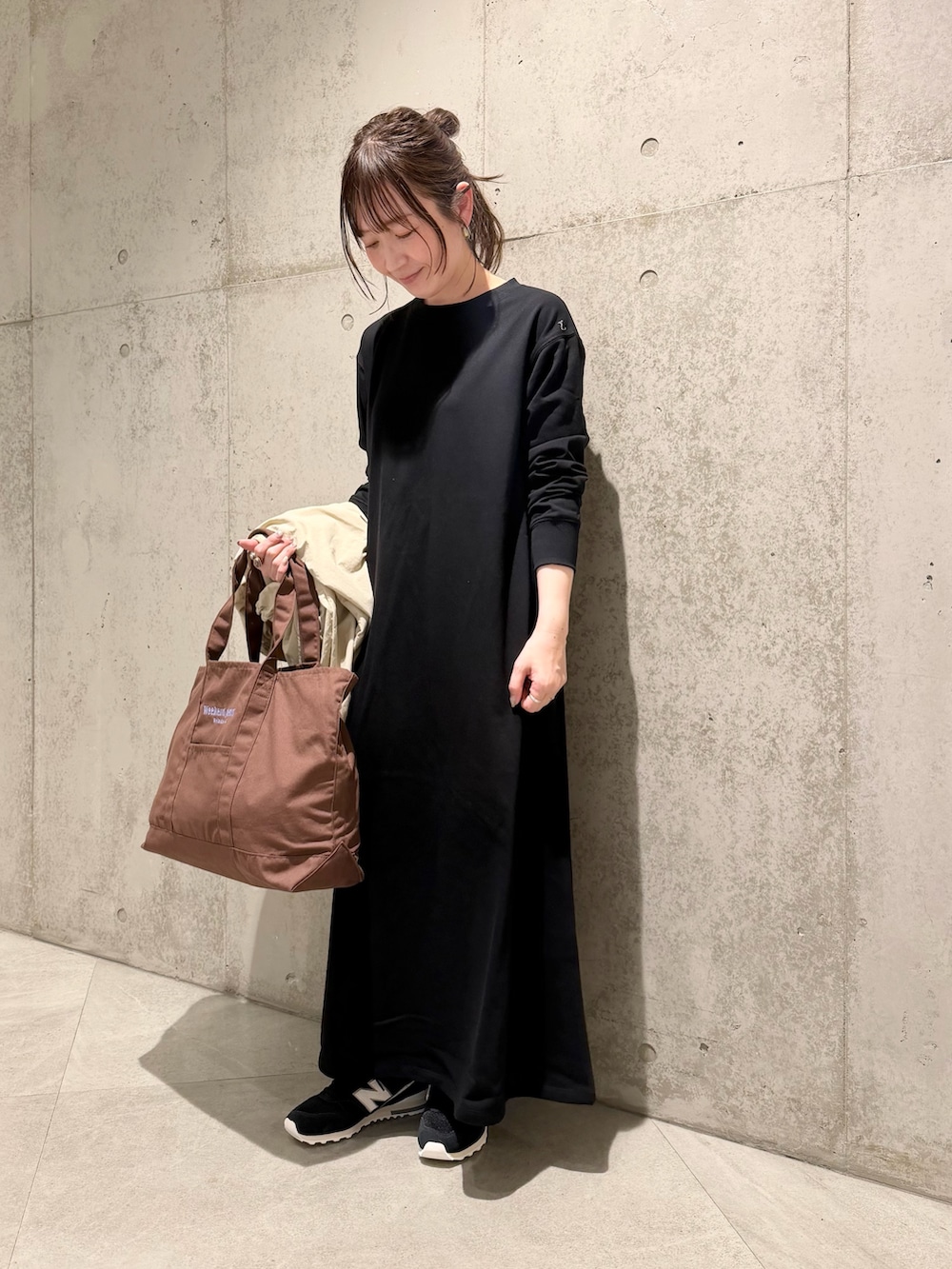 今回は、スウェット素材で着心地の良い、シンプルなワンピースと合わせました。