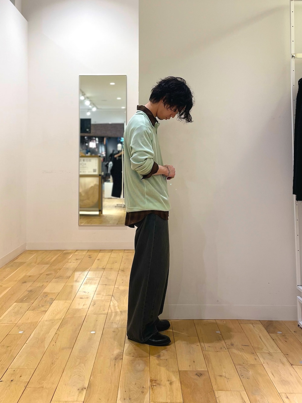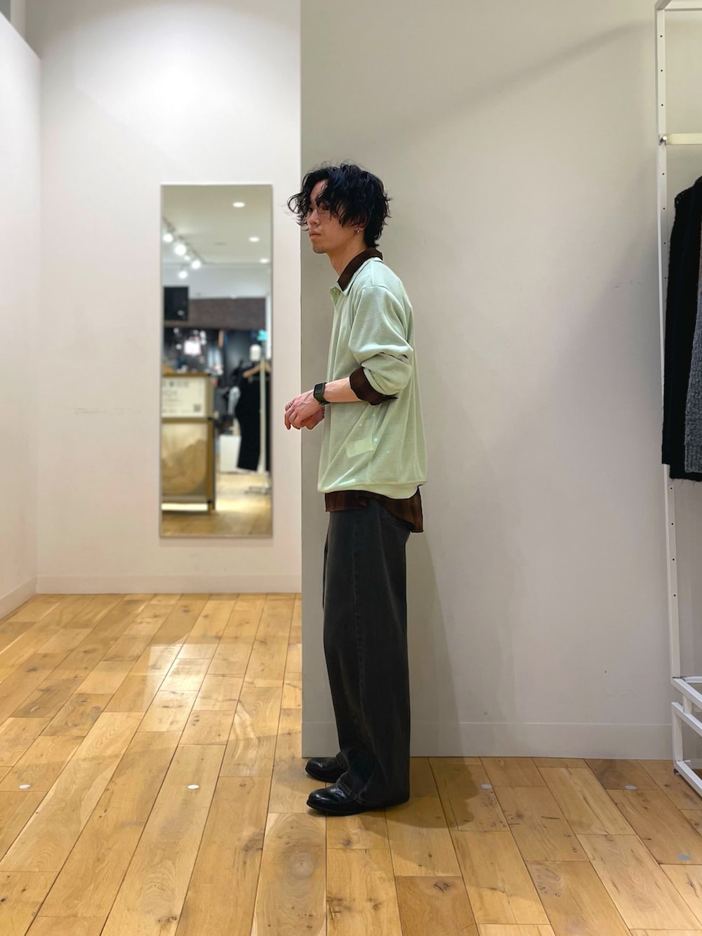 人気のある、シャツ×ポロシャツスタイル。明るめのグリーンのポロシャツを選ぶ事で、春らしさも演出できます。
