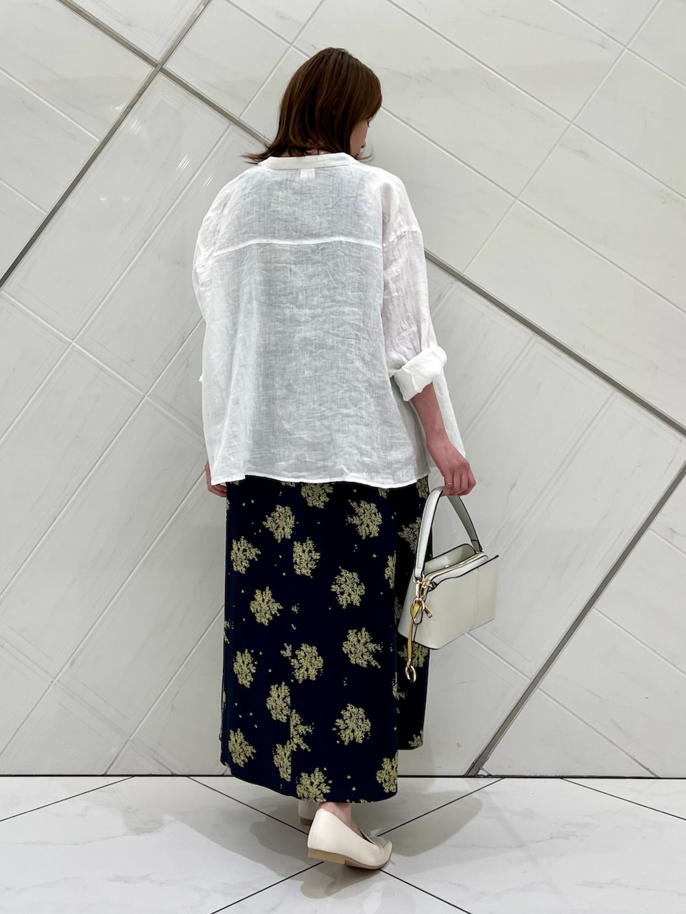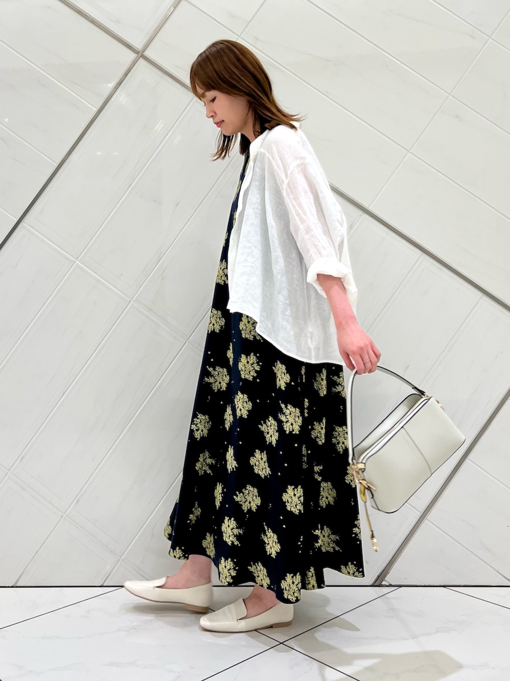 裾に向けて広がりがあるシルエットが女性らしい