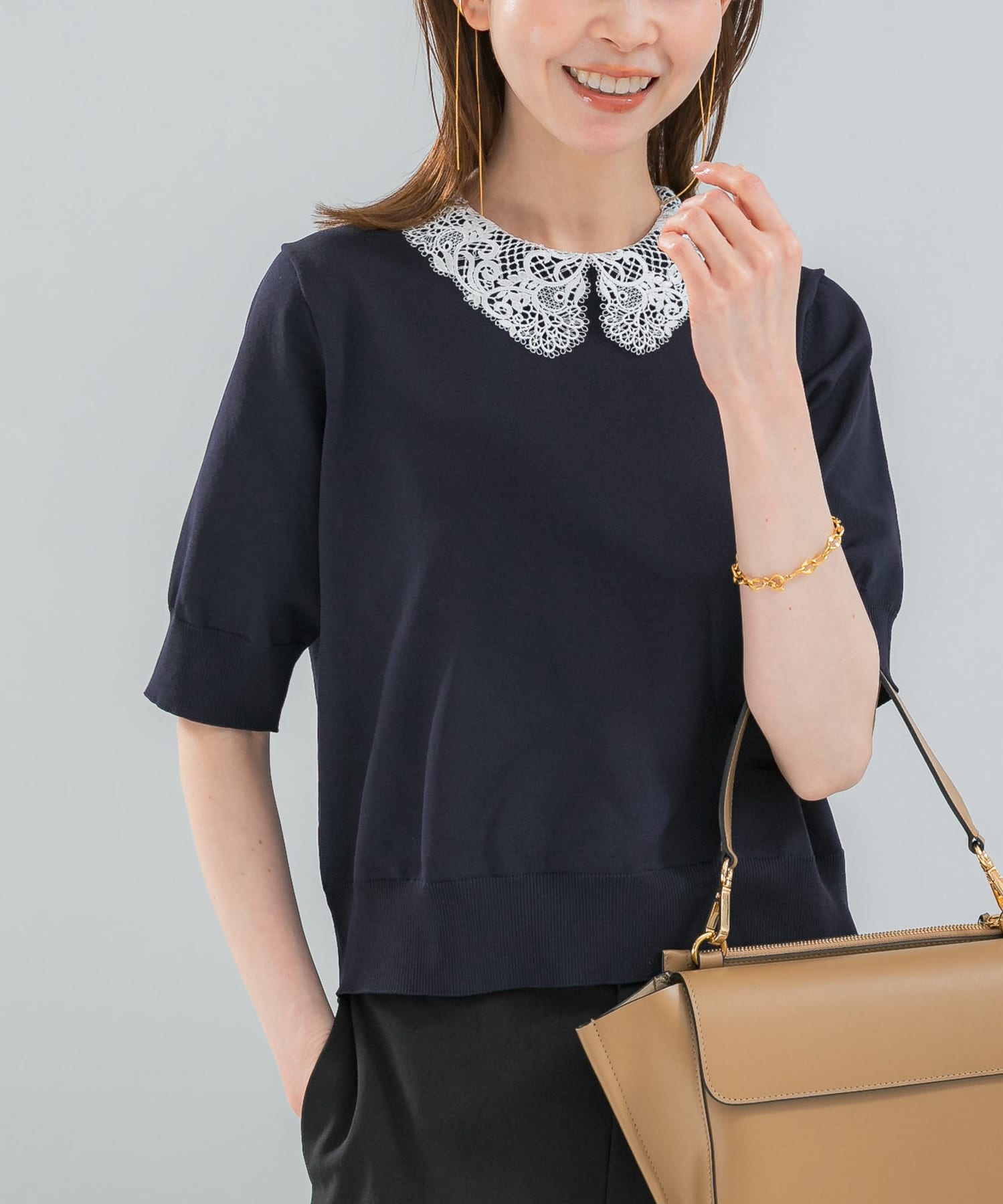 重たくなりがちなワイドパンツスタイルも、軽やかな半袖ニットと華やかな襟のデザインで、春夏の高揚感にふさわしいスタイリングに仕上げました。