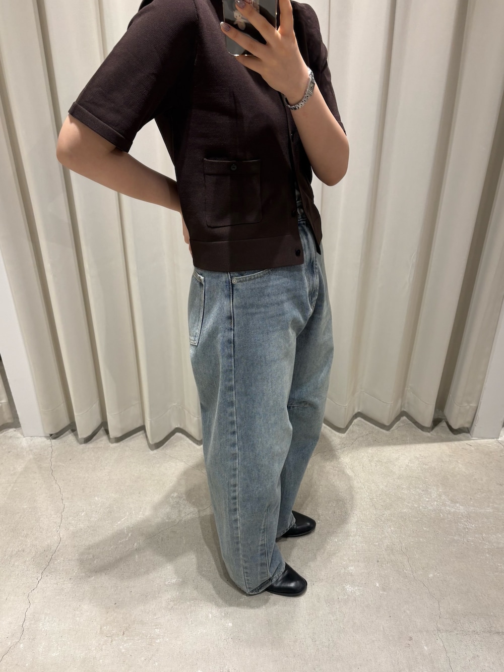 トップスは短丈のニットカーディガン。ONOFFで使える万能アイテムです
