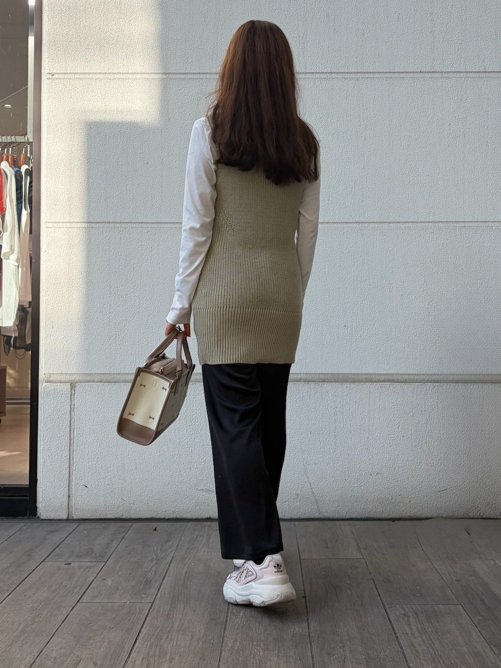 淡色でまとめつつ、ブラックで引き締めた大人カジュアルに仕上げています。