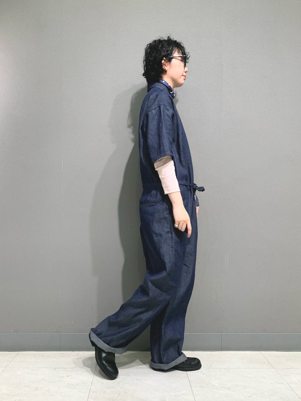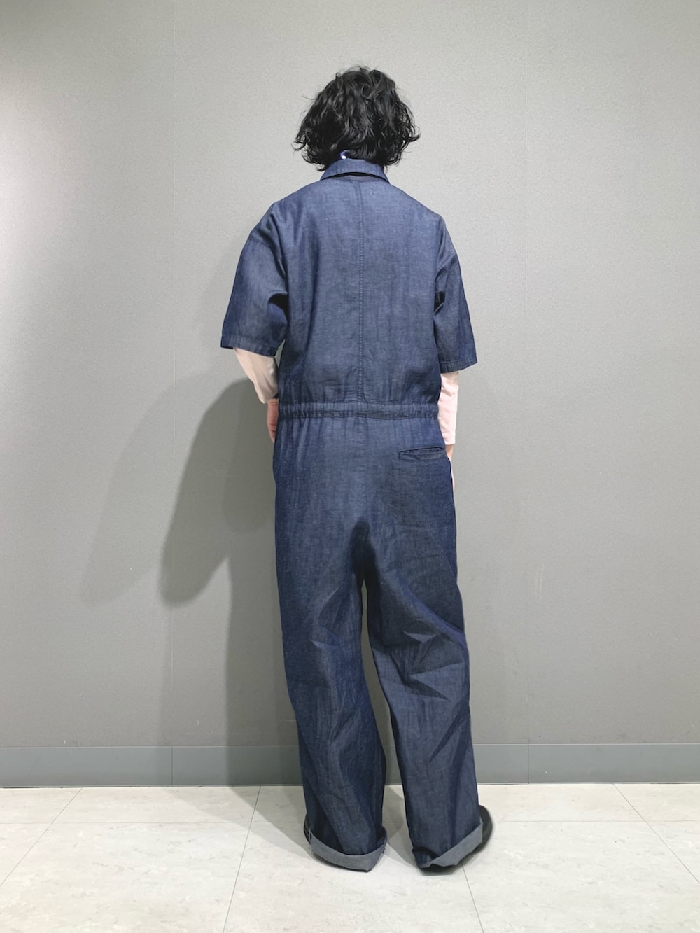 ライトデニムのオールインワンです。軽めな生地感でサラッとお召しいただけます。ウエスト位置は絞り具合で変化をつけていただけます。今回はローウエストでゆるっと来てみました。丈は長めなのでロールアップするのがおすすめです。
