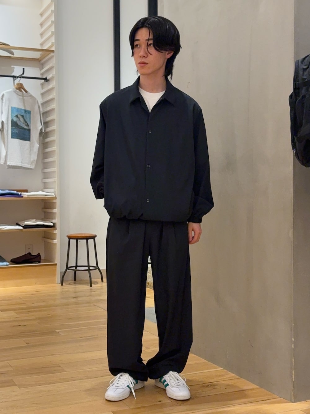 CHARCOALのセットアップを着用し、インナーとスニーカーは白で重たくなりすぎない爽やかなコーデにまとめました。