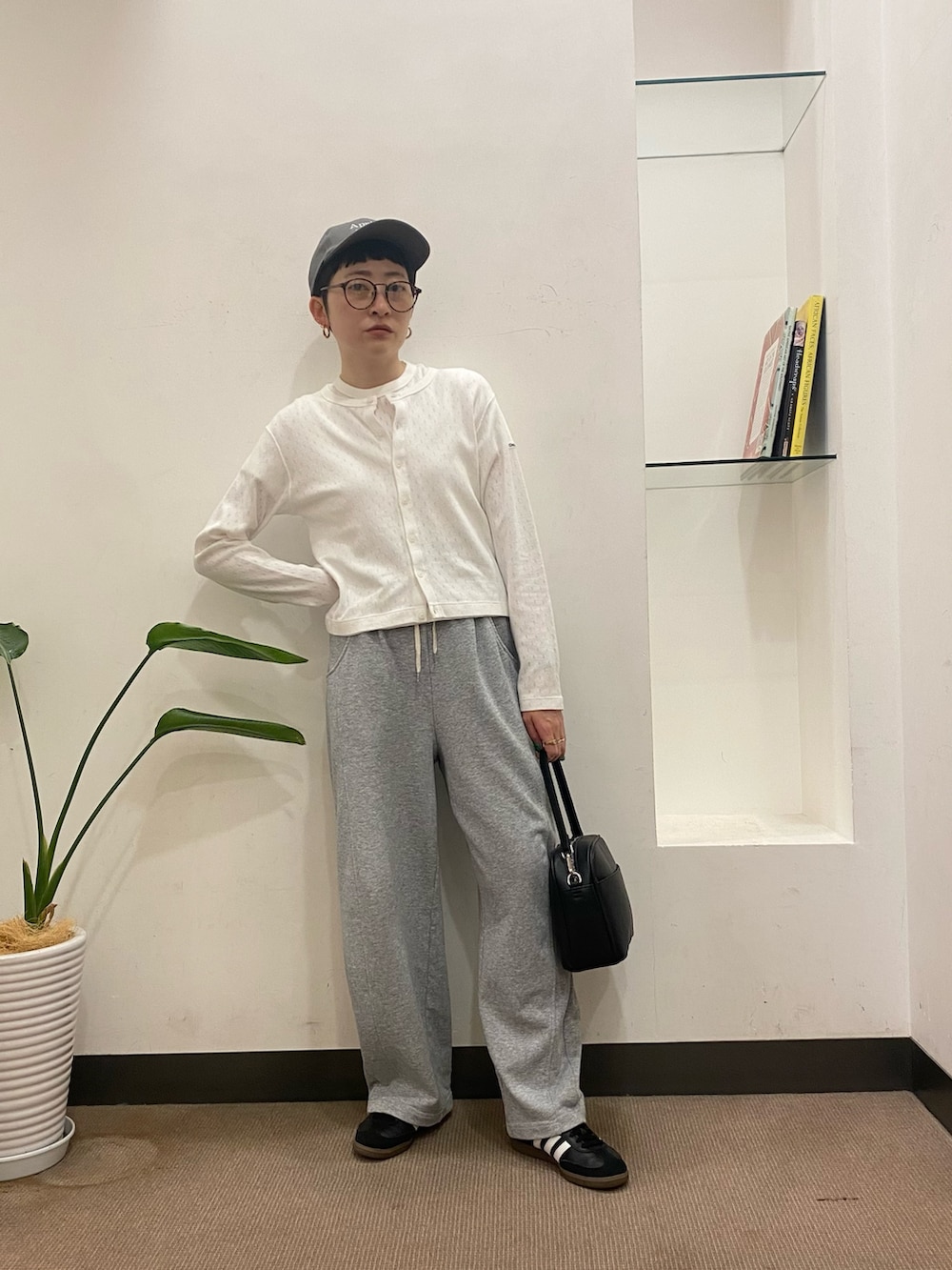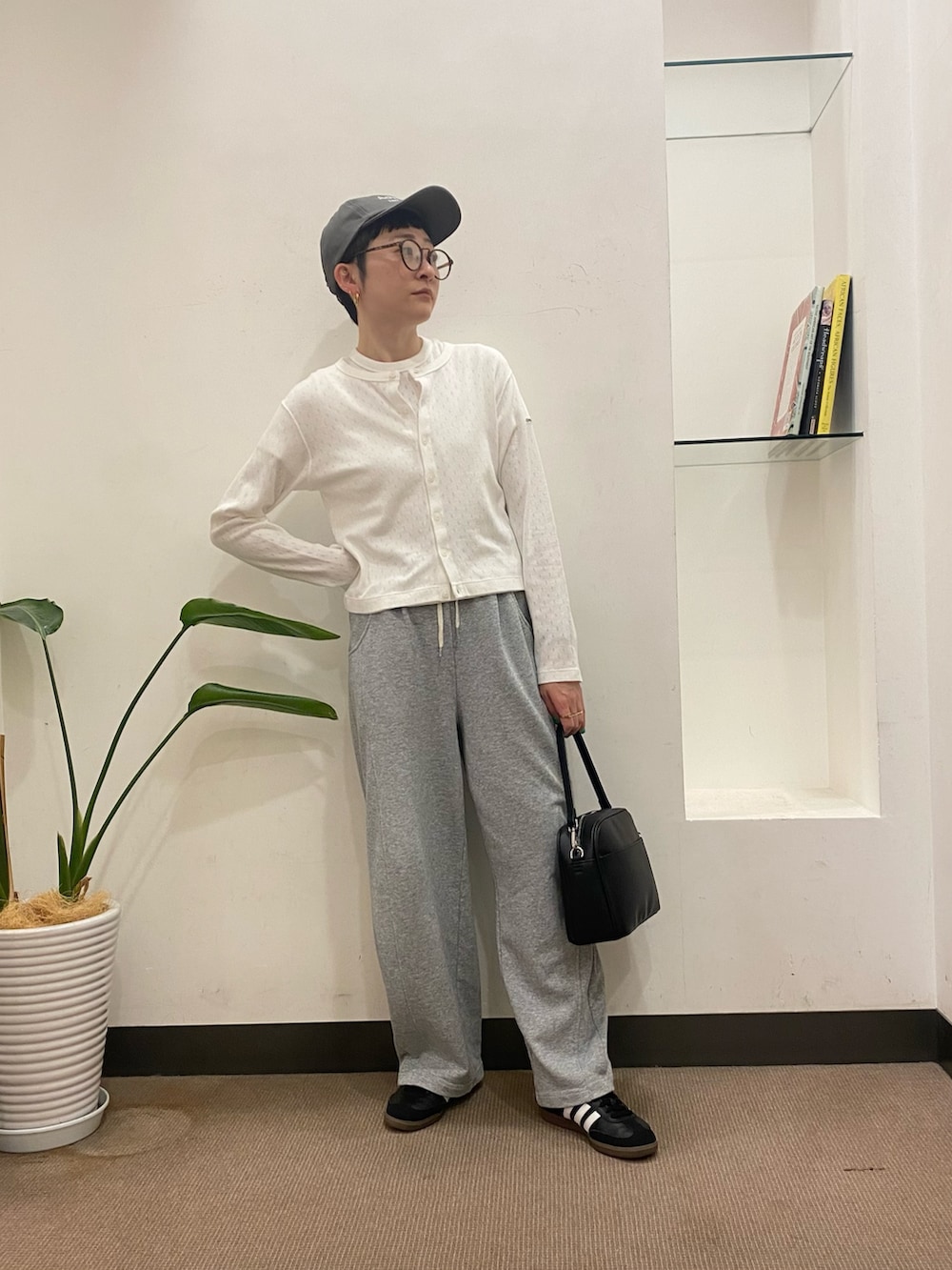 カーディガンは今年トレンドのショート丈でコンパクトタイプ。